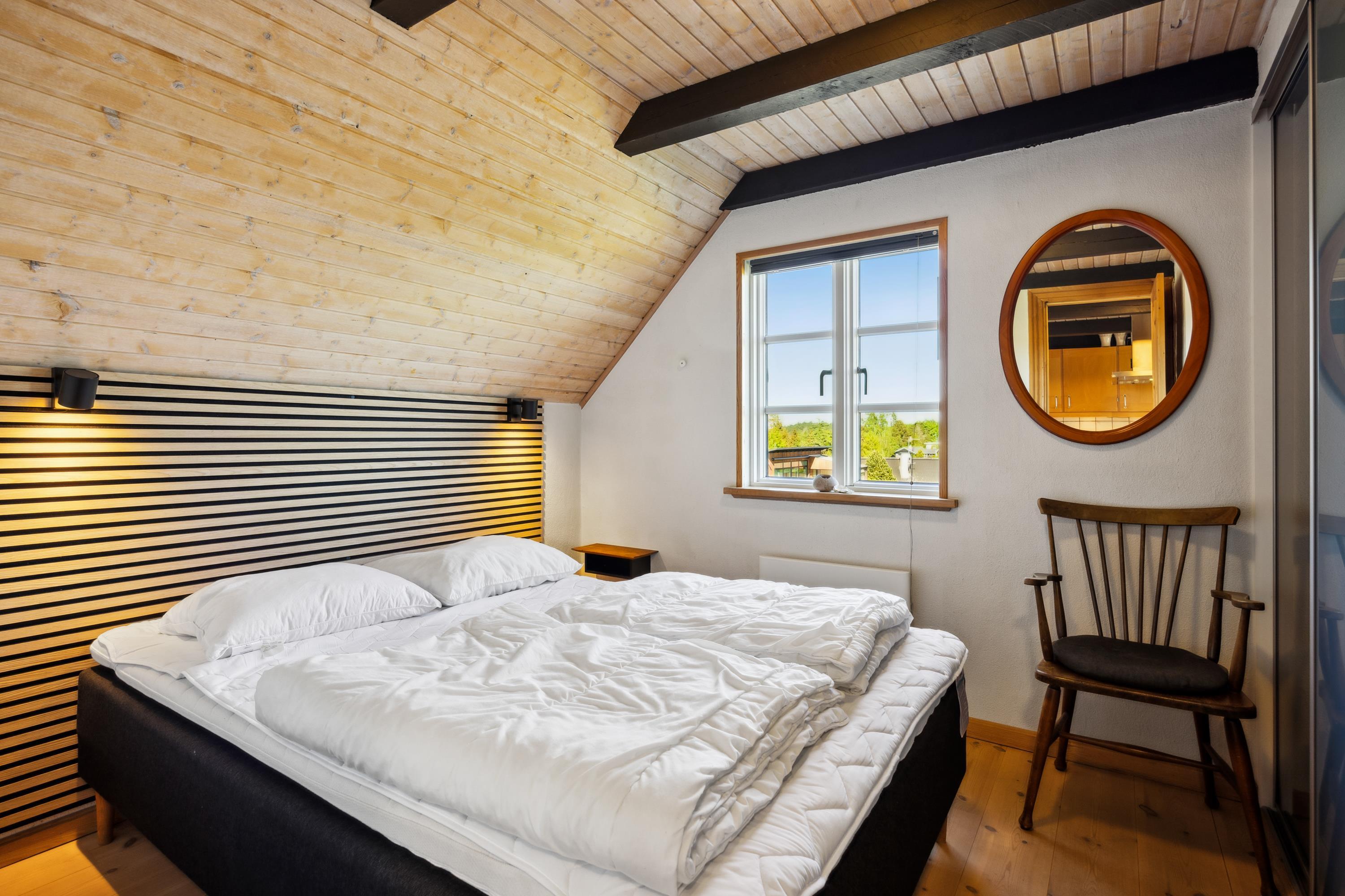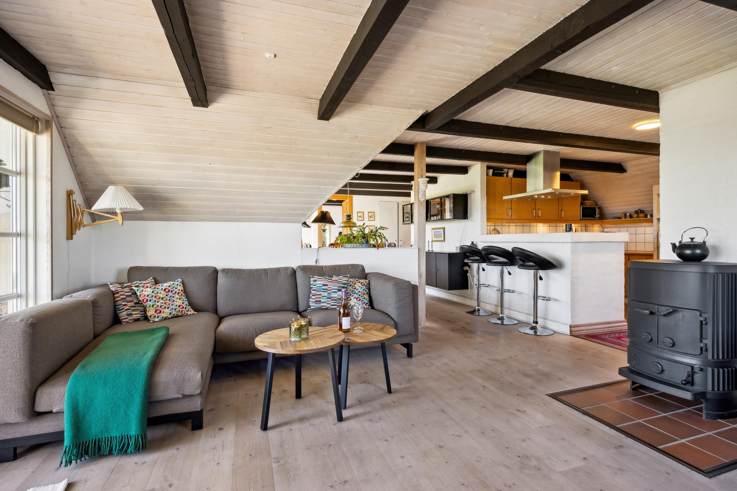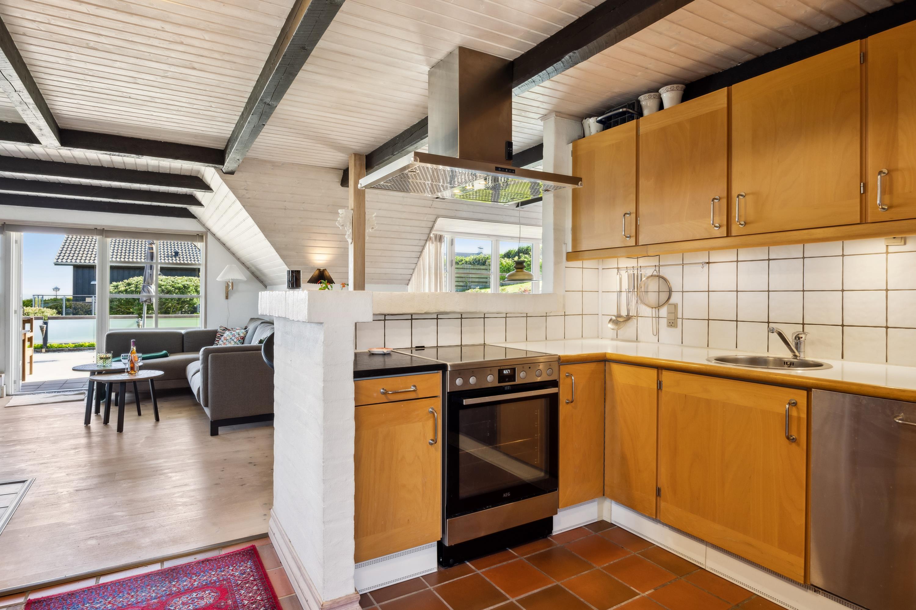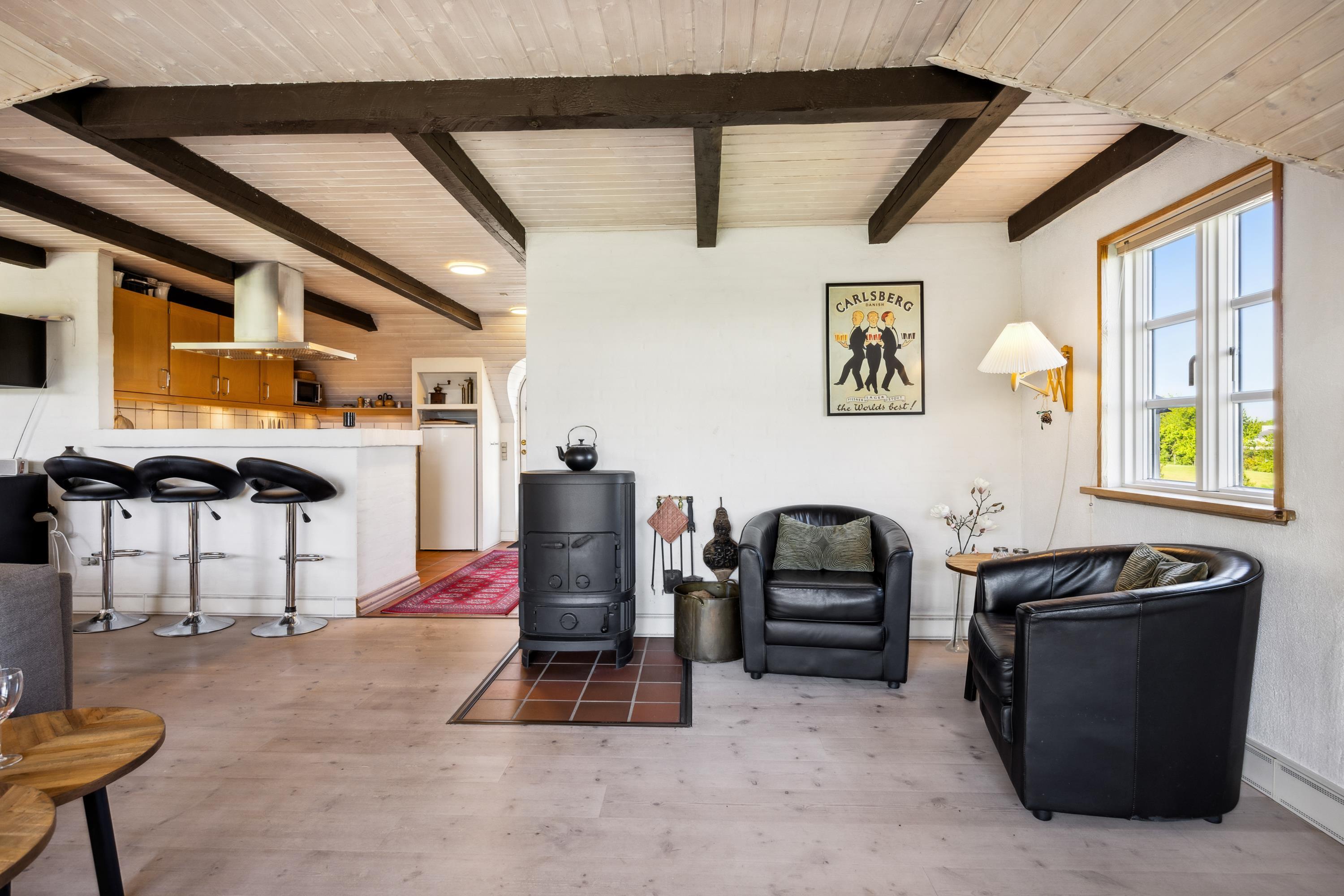 Großes, gemütlich eingerichtetes Wohnzimmer mit sichtbaren Deckenbalken, schönem Dielenboden und Ausgang auf die Terrasse. Geräumige Sitzecke, Kaminofen, TV mit deutschen und dänischen Programmen (inkl. TV2) und Radio. Neben dem Wohnzimmer liegt der Essbereich mit Platz für sechs Personen und ebenfalls mit Ausgang auf die Aussichtsterrasse. Die gut ausgestattete Küche mit viel Arbeitsfläche, Glaskeramikherd, Kühl-/Gefrierkombination und Geschirrspüler liegt in halboffener Verbindung zum Wohnzimmer. Die sechs Schlafplätze verteilen sich auf ein schönes, großes Schlafzimmer mit Doppelbett, ein großes Zimmer mit französischem Bett und einem Einzelbett sowie ein etwas kleineres Zimmer mit zwei Einzelbetten. Wirklich schickes Badezimmer mit Dusche, Waschmaschine und Fußbodenheizung. Internetzugang.
