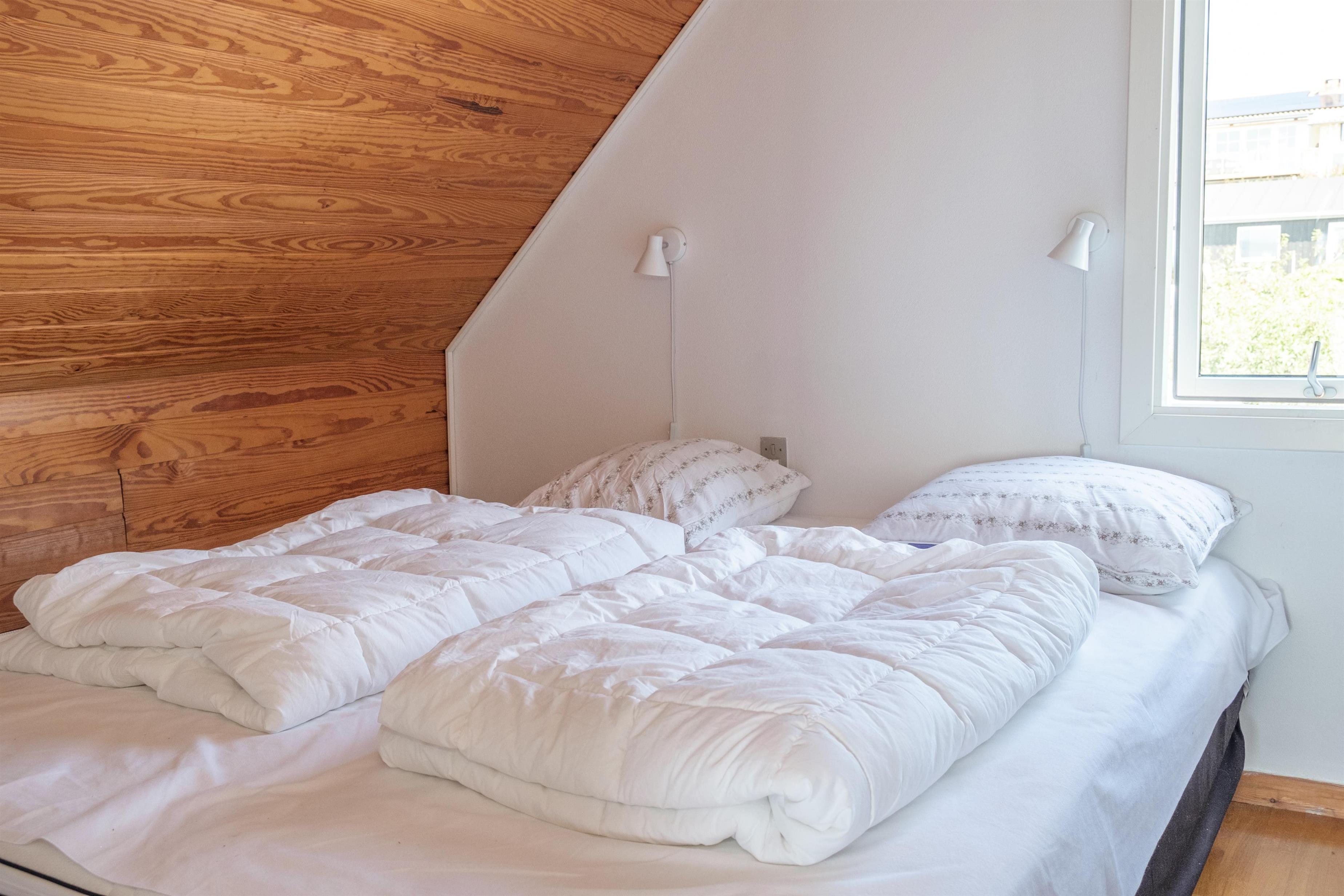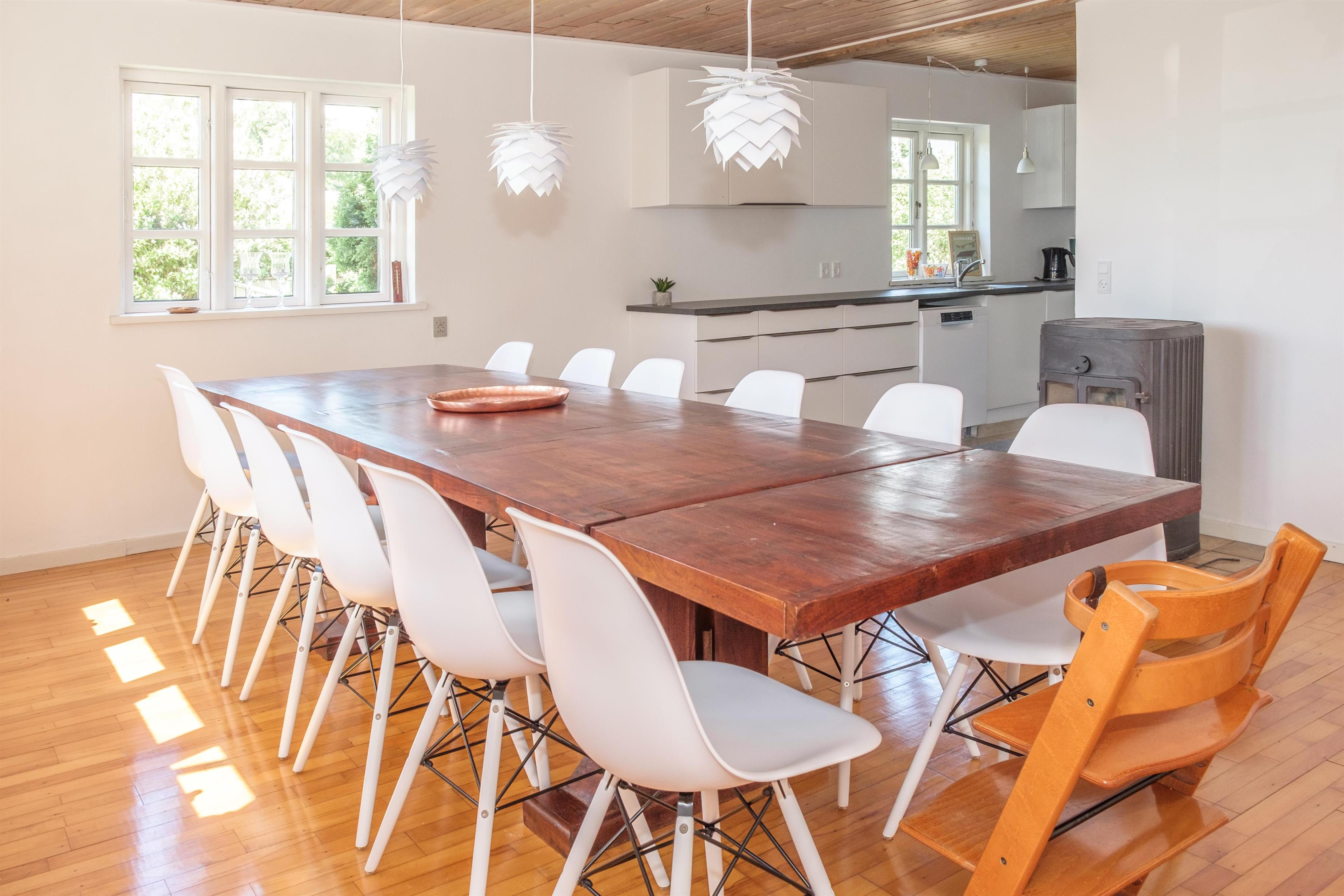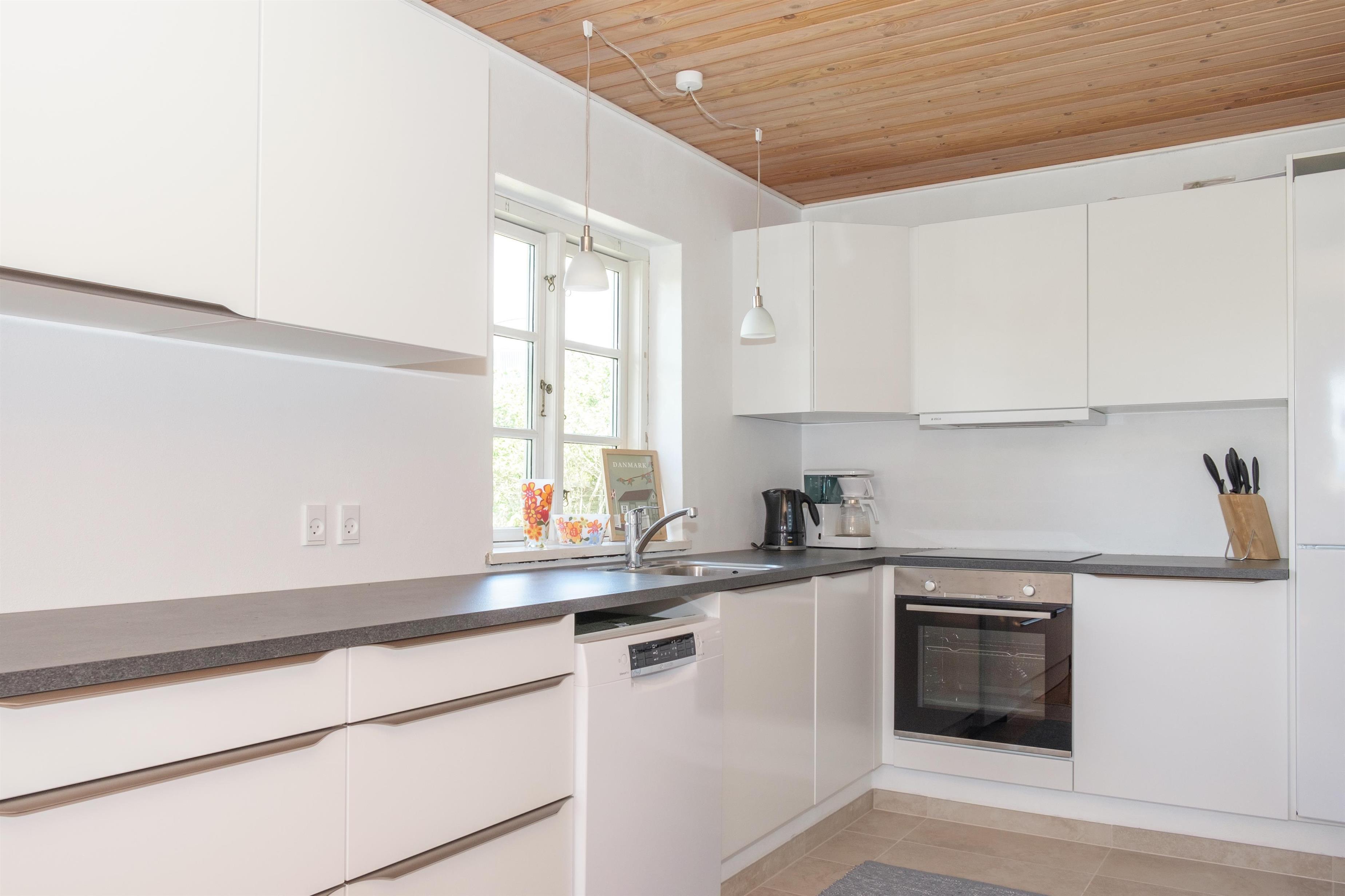 Vom geräumigen Eingangsbereich kommt man in die große Wohnküche mit Kaminofen und Essplatz für 12 Personen am langen Holztisch. Für die Kleinsten ist ein Hochstuhl vorhanden. Schicke neue Küche mit Glaskeramik-Kochfeld, Einbaubackofen, Kühl-/Gefrierkombination, Geschirrspüler und Mikrowelle. Im 1. Stock befindet sich das gemütliche, gut möblierte Wohnzimmer mit TV mit dänischen (inkl. TV2) und deutschen Programmen, Radio sowie Ausgang auf den kleinen, überdachten Aussichtsbalkon. Die insgesamt 12 Schlafplätze verteilen sich auch zwei gute Schlafzimmer mit Doppelbett und ein Zimmer mit zwei Etagenbetten im Erdgeschoss sowie zwei Schlafzimmer mit Doppelbett im 1. Stock. Im Erdgeschoss befinden sich ein schönes, neues Badezimmer mit Dusche, Waschmaschine und Trockner sowie das Original-Badezimmer aus den 60er Jahren mit hellblauen Fliesen und Badewanne. Beide sind mit Fußbodenheizung ausgestattet. Internetzugang.