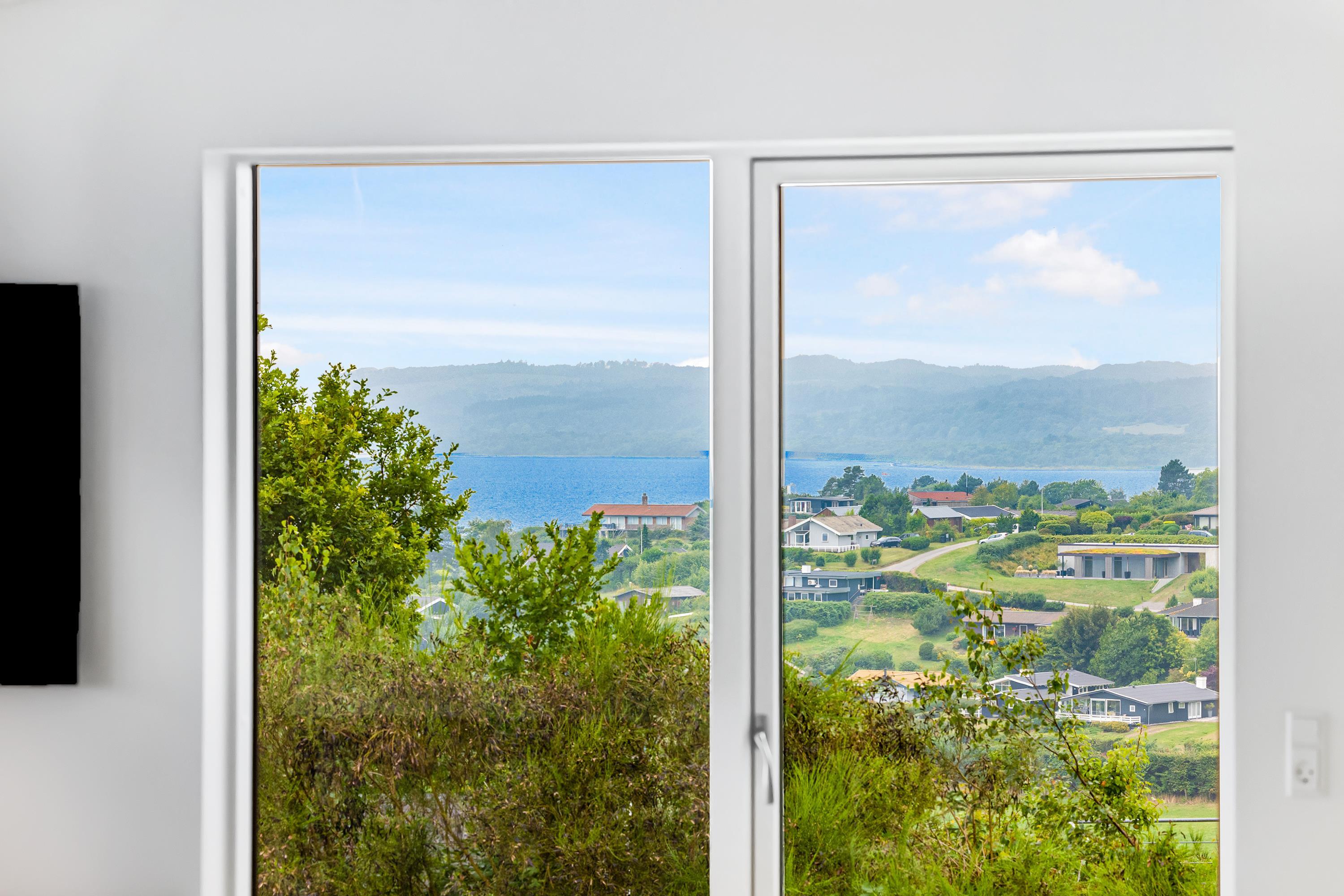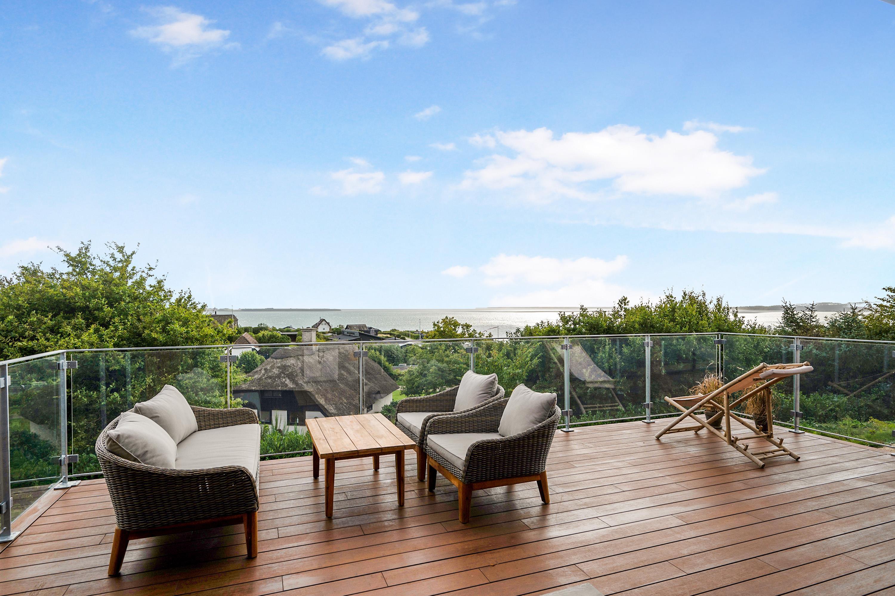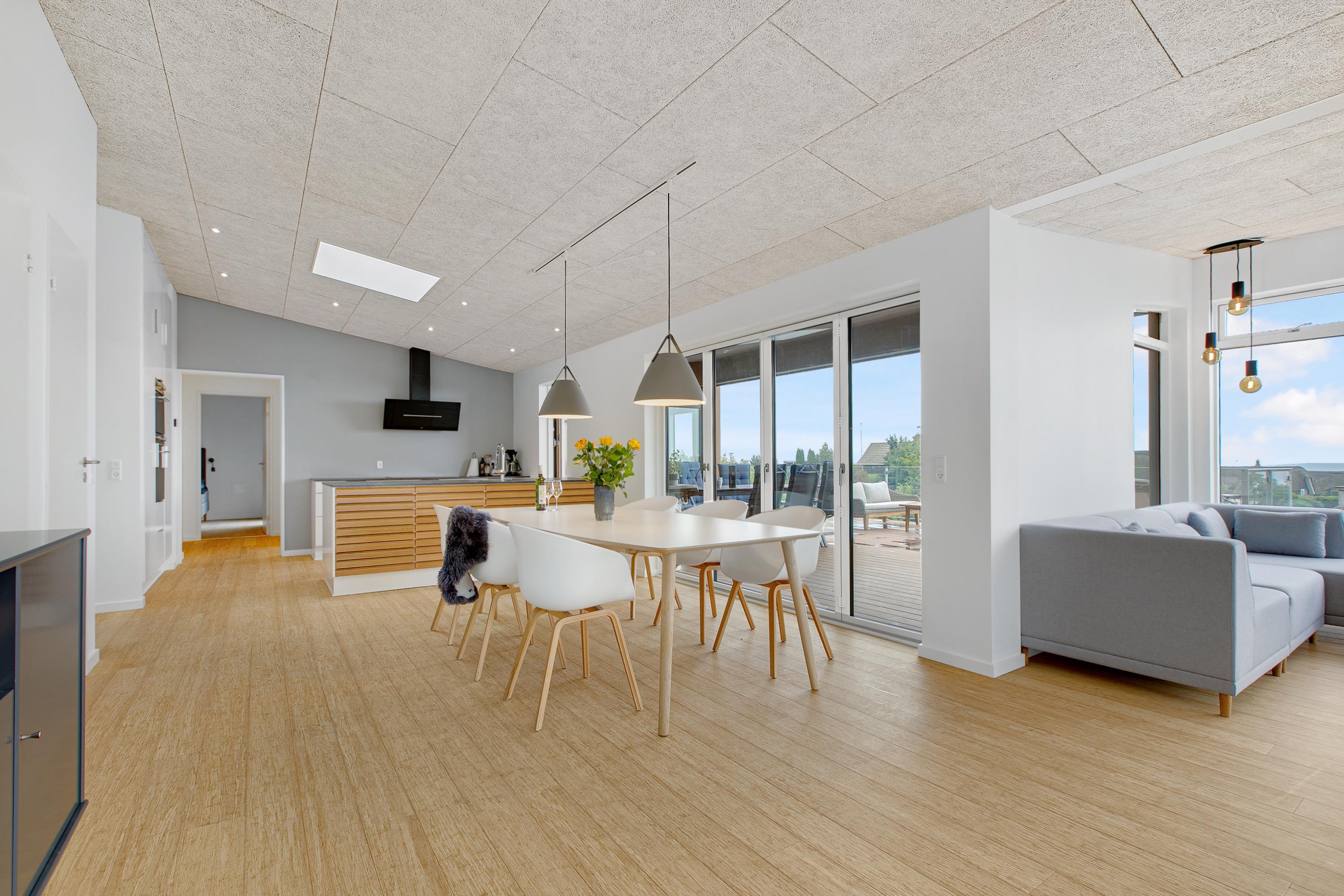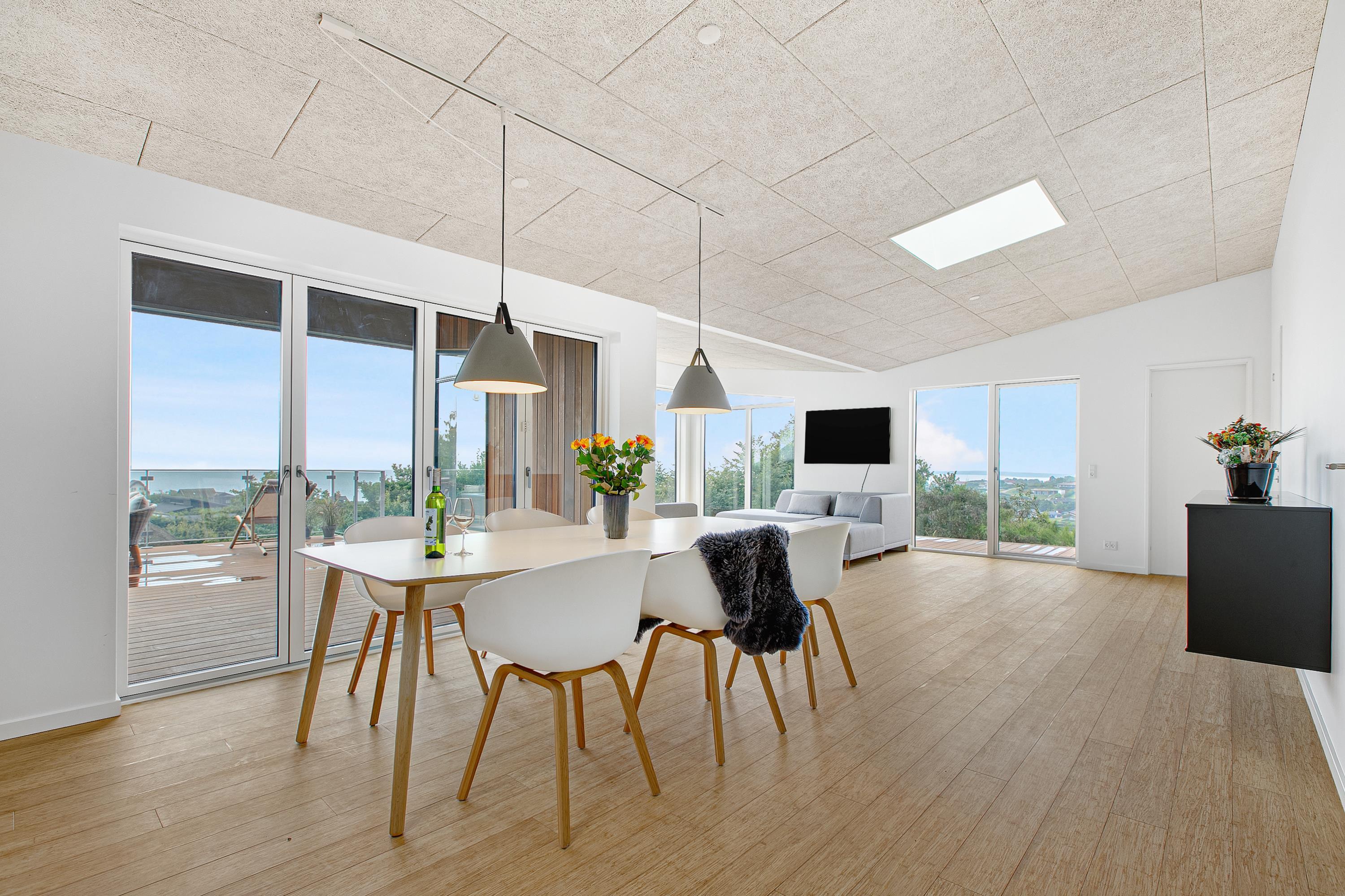 Mit der schönsten Aussicht über Ebeltoft Bucht und bis nach Samsø finden Sie dieses schöne neu gebaute Haus. Das Haus wurde von einem Architekten entworfen und im Hinblick auf Nachhaltigkeit in soliden Materialien gebaut. Das Haus besteht aus Zedernholz, auf dem Dach befinden sich Solarzellen und die Böden sind aus massivem Bambus. Das Haus verfügt über ein großes, helles Wohnzimmer mit stilvollen Möbeln und Panoramablick auf das Wasser. In Verbindung mit dem Wohnzimmer befindet sich die superschöne Küche mit allen Elektrogeräten und von der aus man Zugang zu einer sehr großen und schönen Terrasse mit guten Gartenmöbeln hat. Ein Teil der Terrasse ist überdacht, so dass man bei fast jedem Wetter die schöne Aussicht nach draußen genießen kann. Auf der Terrasse mit Blick auf die Bucht befindet sich ein Whirlpool im Freien für 5 Personen. Die acht Schlafplätze des Hauses verteilen sich auf vier große Zimmer mit Doppelbetten. Es gibt auch einen großen Aktivitätsraum/Spielzimmer mit Tischtennis, Duplo, Flexi-Trax und Spielen. Das Haus verfügt über zwei schöne Badezimmer, von denen eines über einen Whirlpool verfügt. Es gibt auch Zugang zu einer Waschmaschine und einem Wäschetrockner. Es gibt Internet im Haus und Fernsehen ist über Streaming. Das Haus wird mit einer Luft-Wasser-Wärmepumpe beheizt und ist daher günstig im Verbrauch.