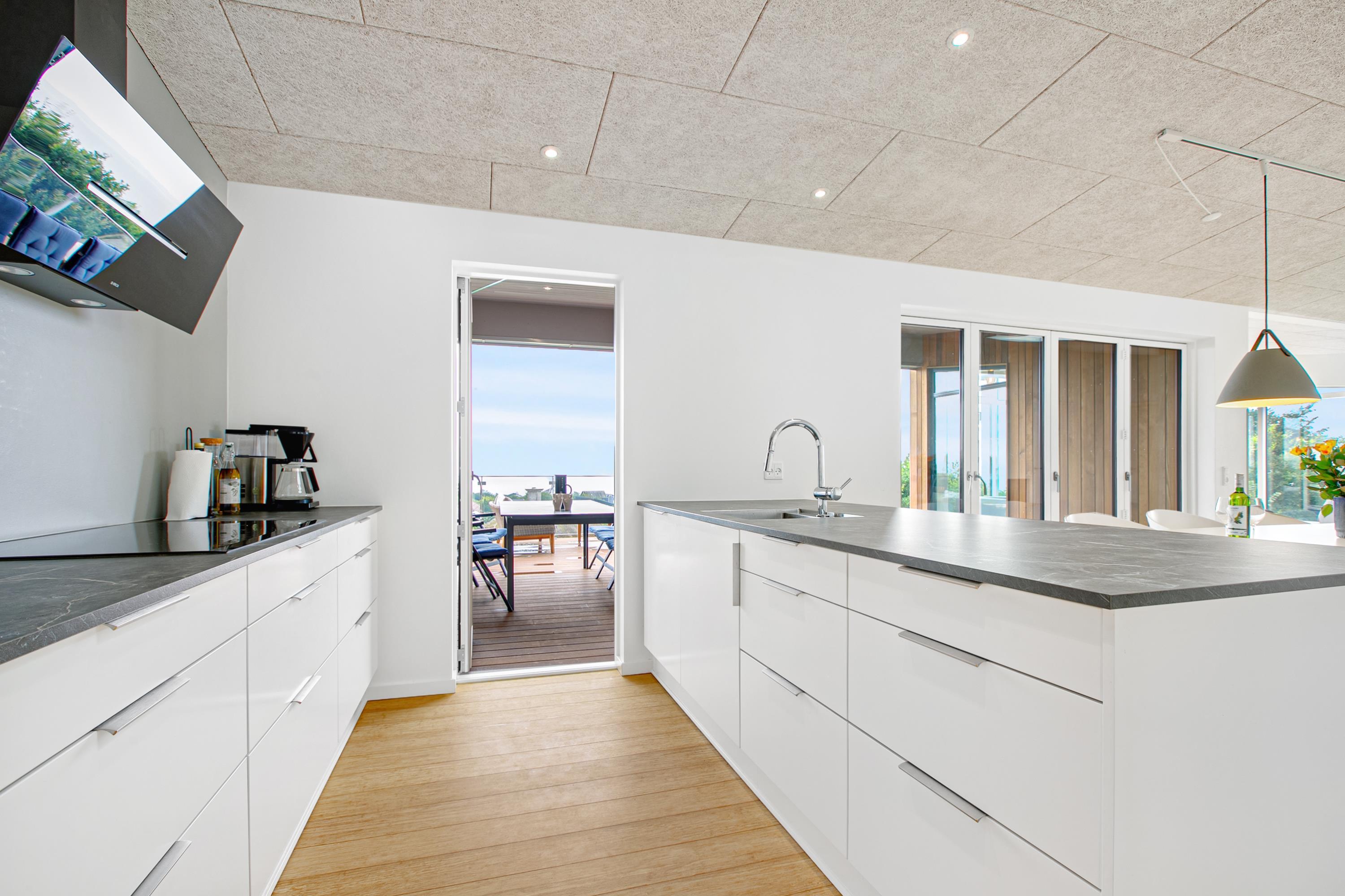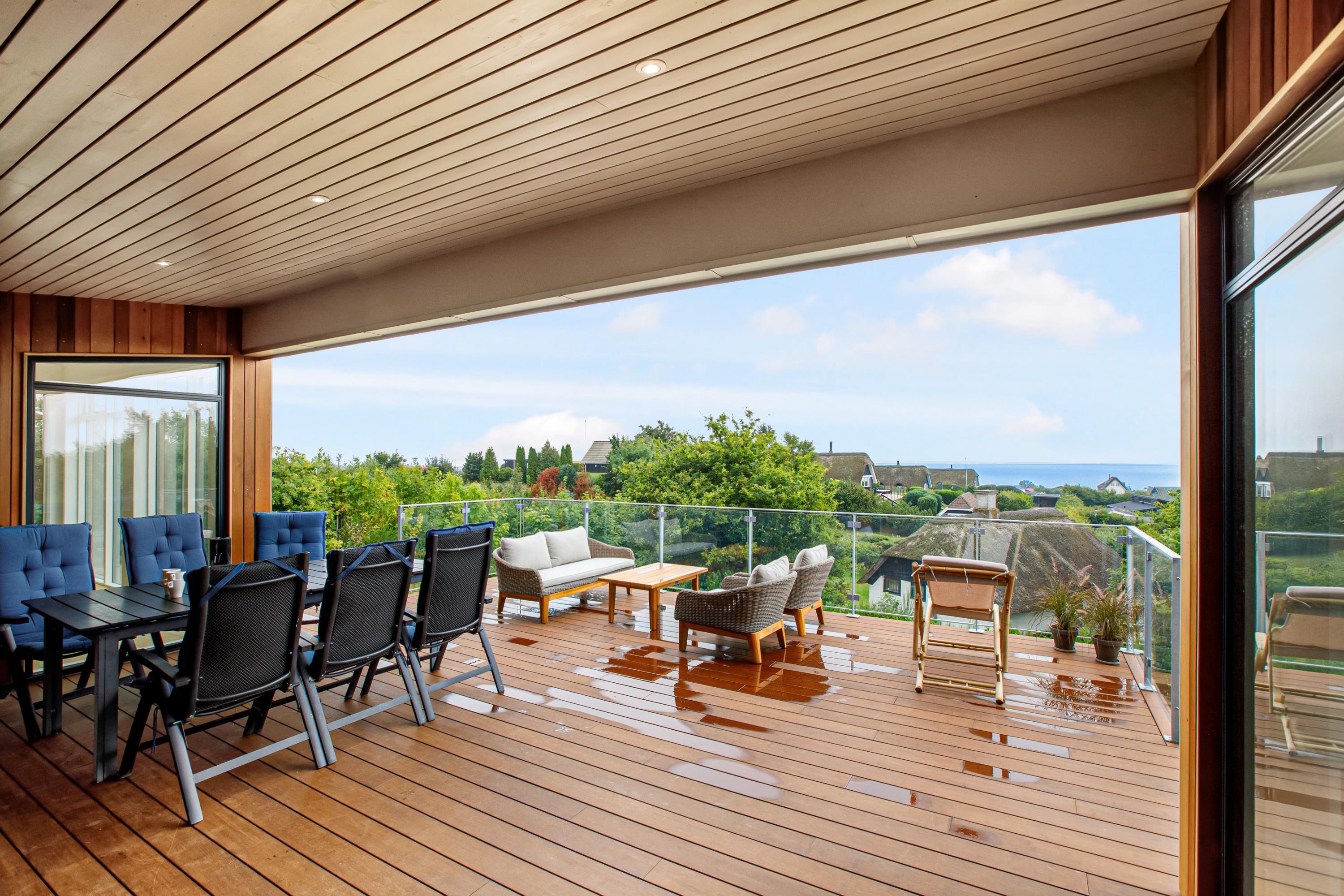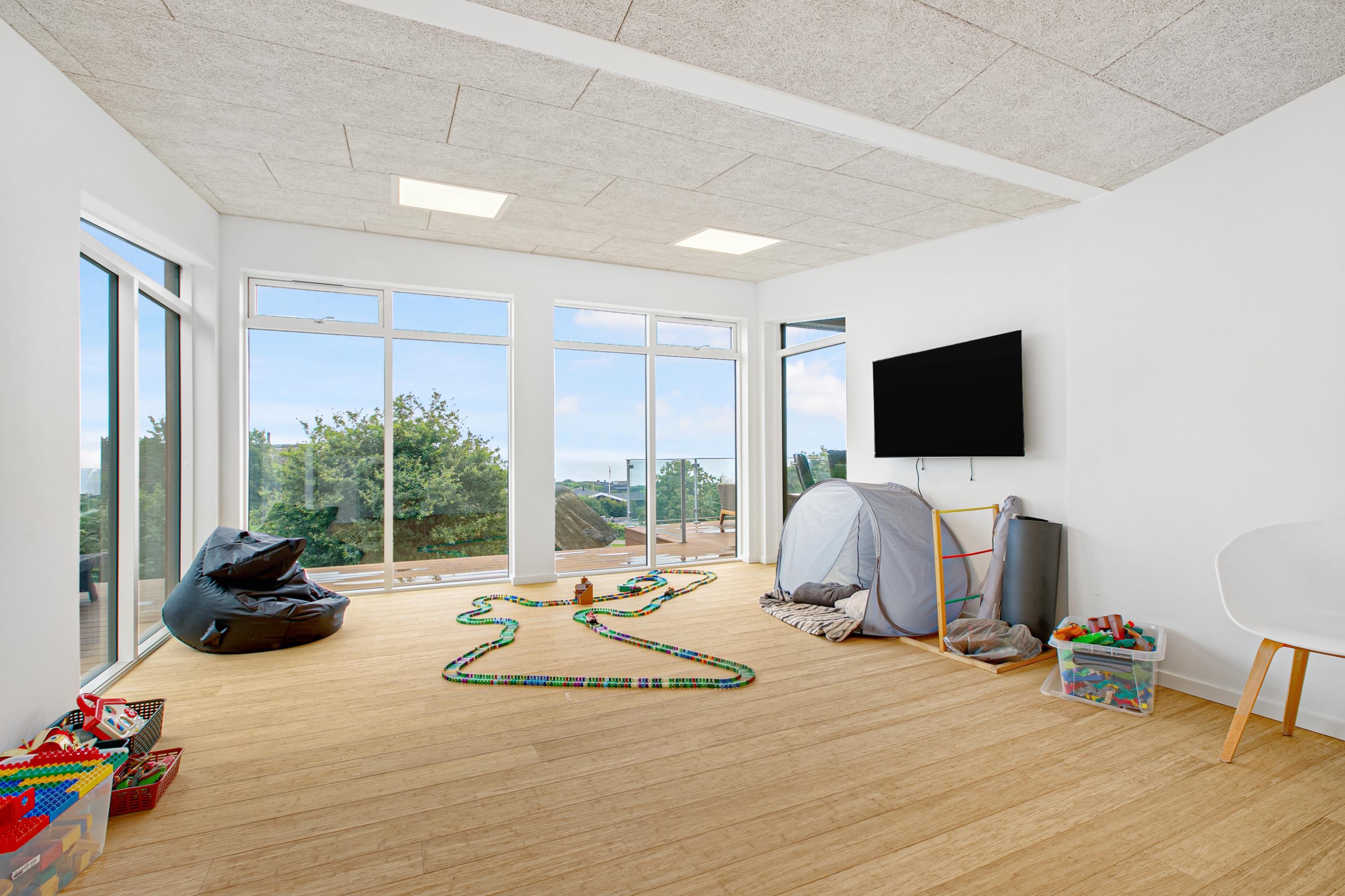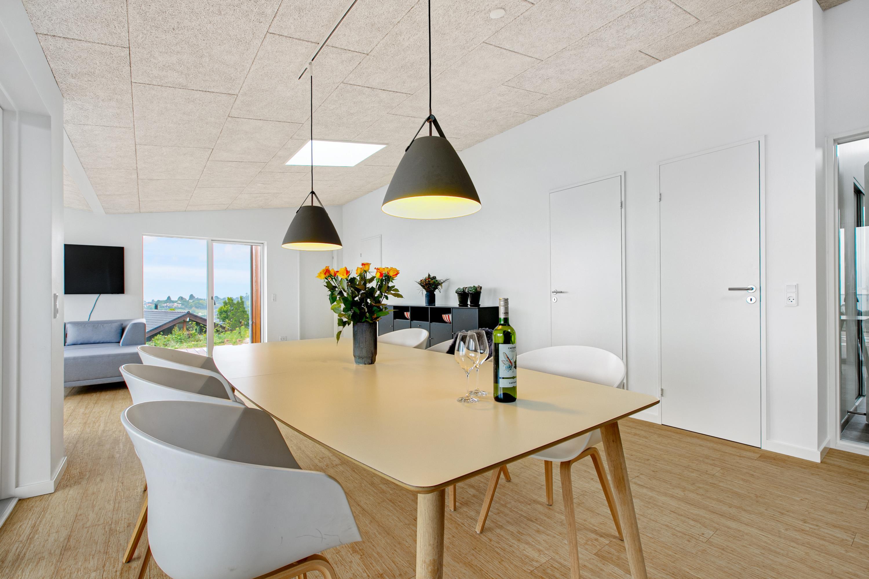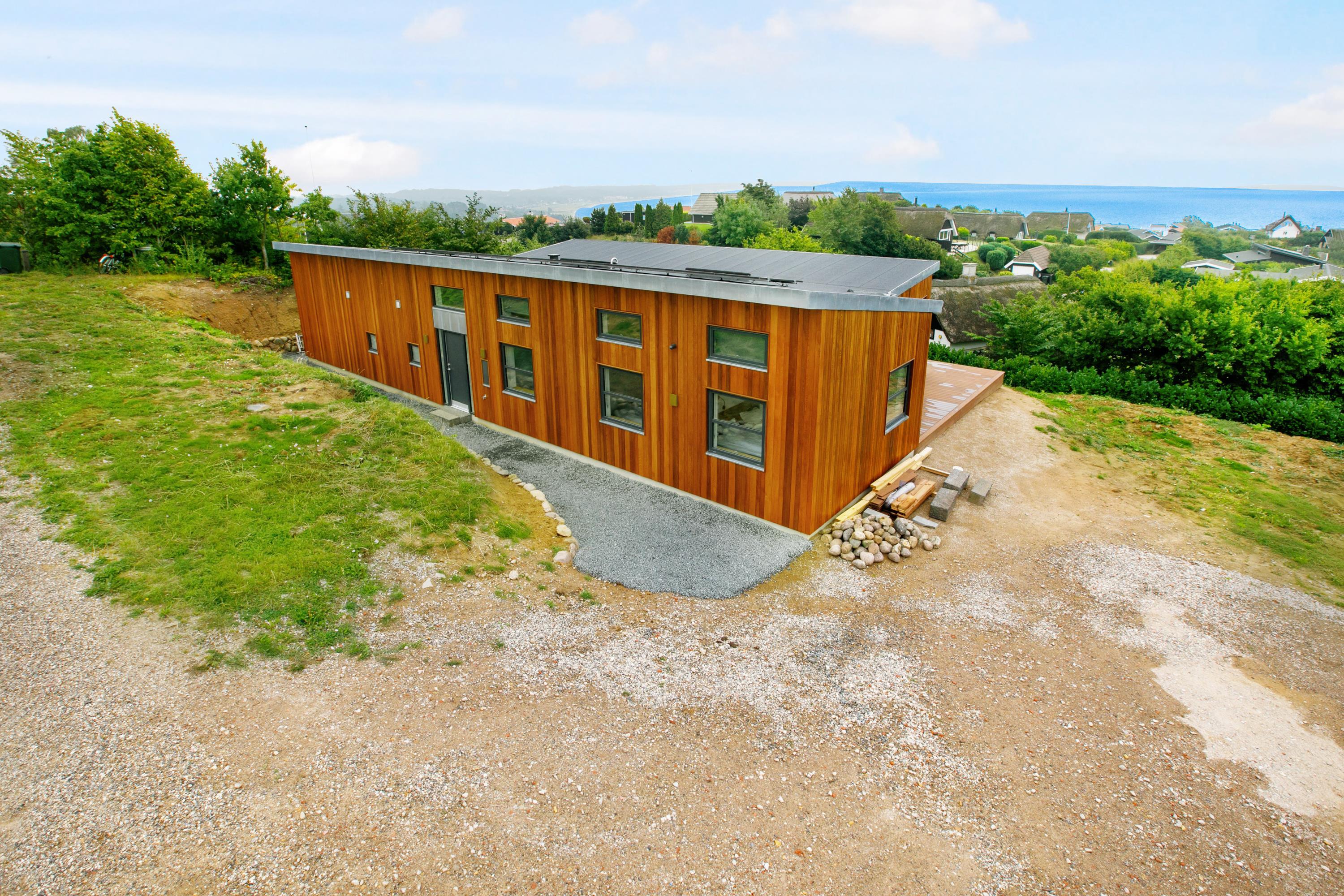 Mit der schönsten Aussicht über Ebeltoft Bucht und bis nach Samsø finden Sie dieses schöne neu gebaute Haus. Das Haus wurde von einem Architekten entworfen und im Hinblick auf Nachhaltigkeit in soliden Materialien gebaut. Das Haus besteht aus Zedernholz, auf dem Dach befinden sich Solarzellen und die Böden sind aus massivem Bambus. Das Haus verfügt über ein großes, helles Wohnzimmer mit stilvollen Möbeln und Panoramablick auf das Wasser. In Verbindung mit dem Wohnzimmer befindet sich die superschöne Küche mit allen Elektrogeräten und von der aus man Zugang zu einer sehr großen und schönen Terrasse mit guten Gartenmöbeln hat. Ein Teil der Terrasse ist überdacht, so dass man bei fast jedem Wetter die schöne Aussicht nach draußen genießen kann. Auf der Terrasse mit Blick auf die Bucht befindet sich ein Whirlpool im Freien für 5 Personen. Die acht Schlafplätze des Hauses verteilen sich auf vier große Zimmer mit Doppelbetten. Es gibt auch einen großen Aktivitätsraum/Spielzimmer mit Tischtennis, Duplo, Flexi-Trax und Spielen. Das Haus verfügt über zwei schöne Badezimmer, von denen eines über einen Whirlpool verfügt. Es gibt auch Zugang zu einer Waschmaschine und einem Wäschetrockner. Es gibt Internet im Haus und Fernsehen ist über Streaming. Das Haus wird mit einer Luft-Wasser-Wärmepumpe beheizt und ist daher günstig im Verbrauch.