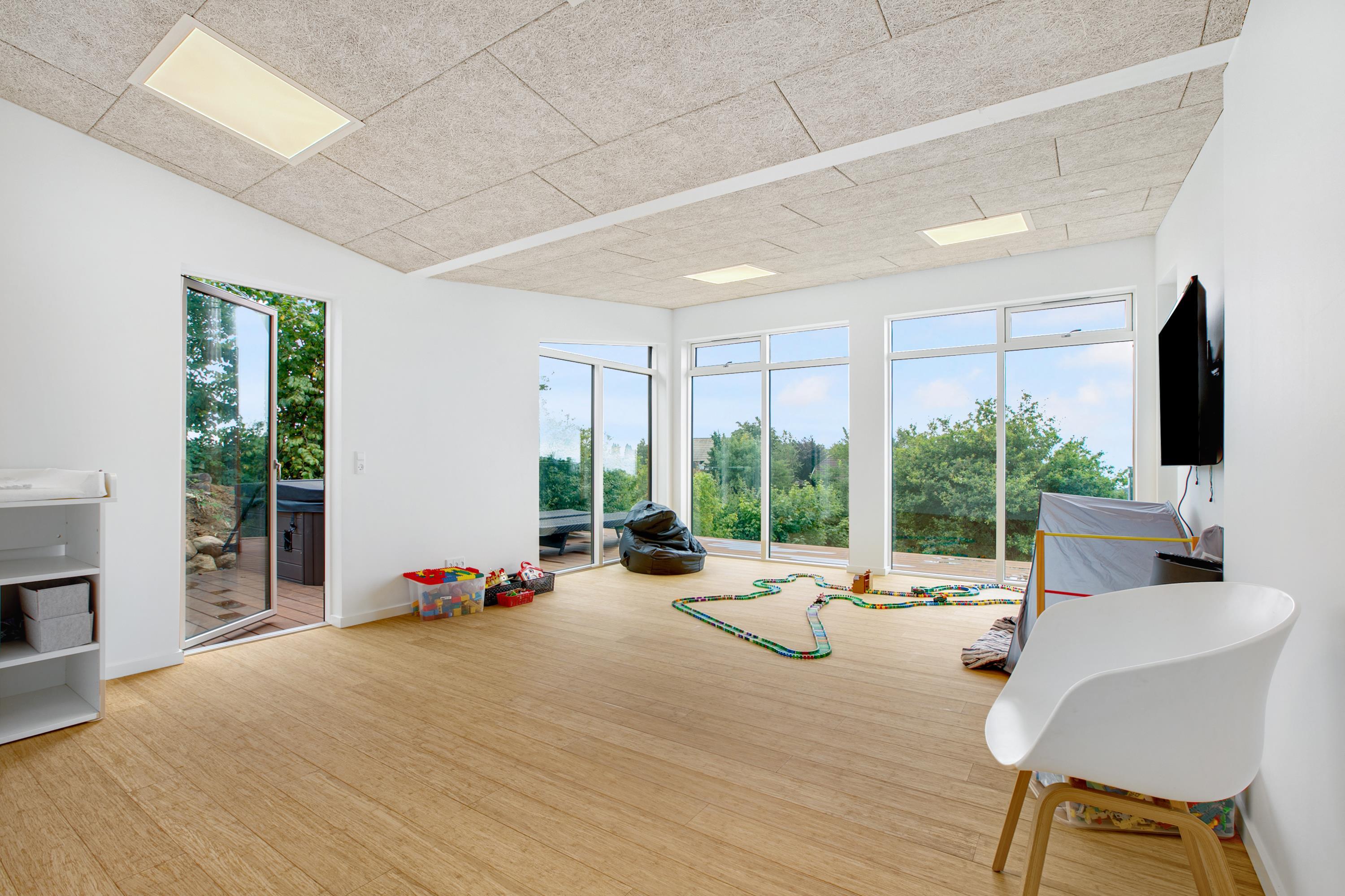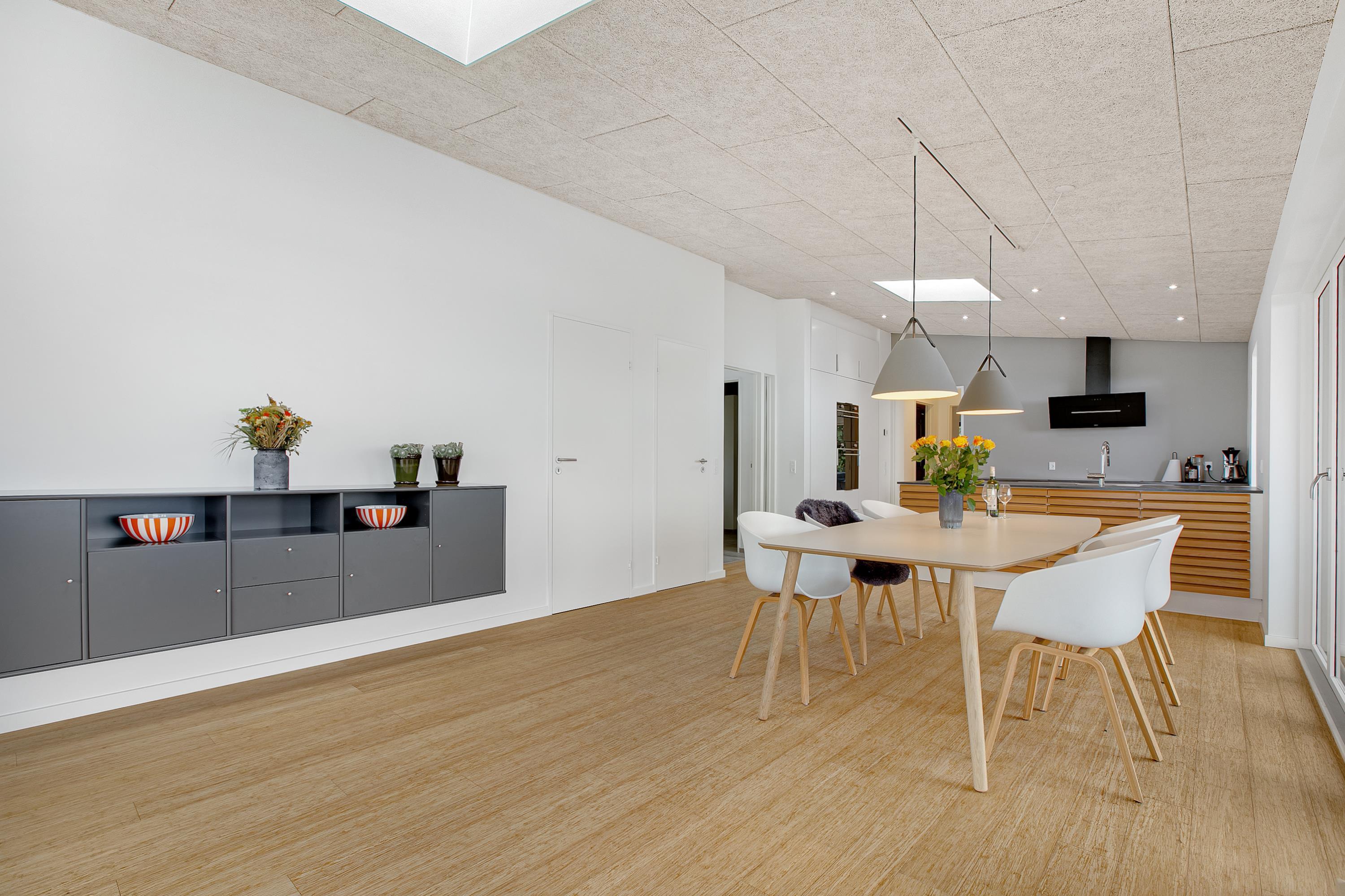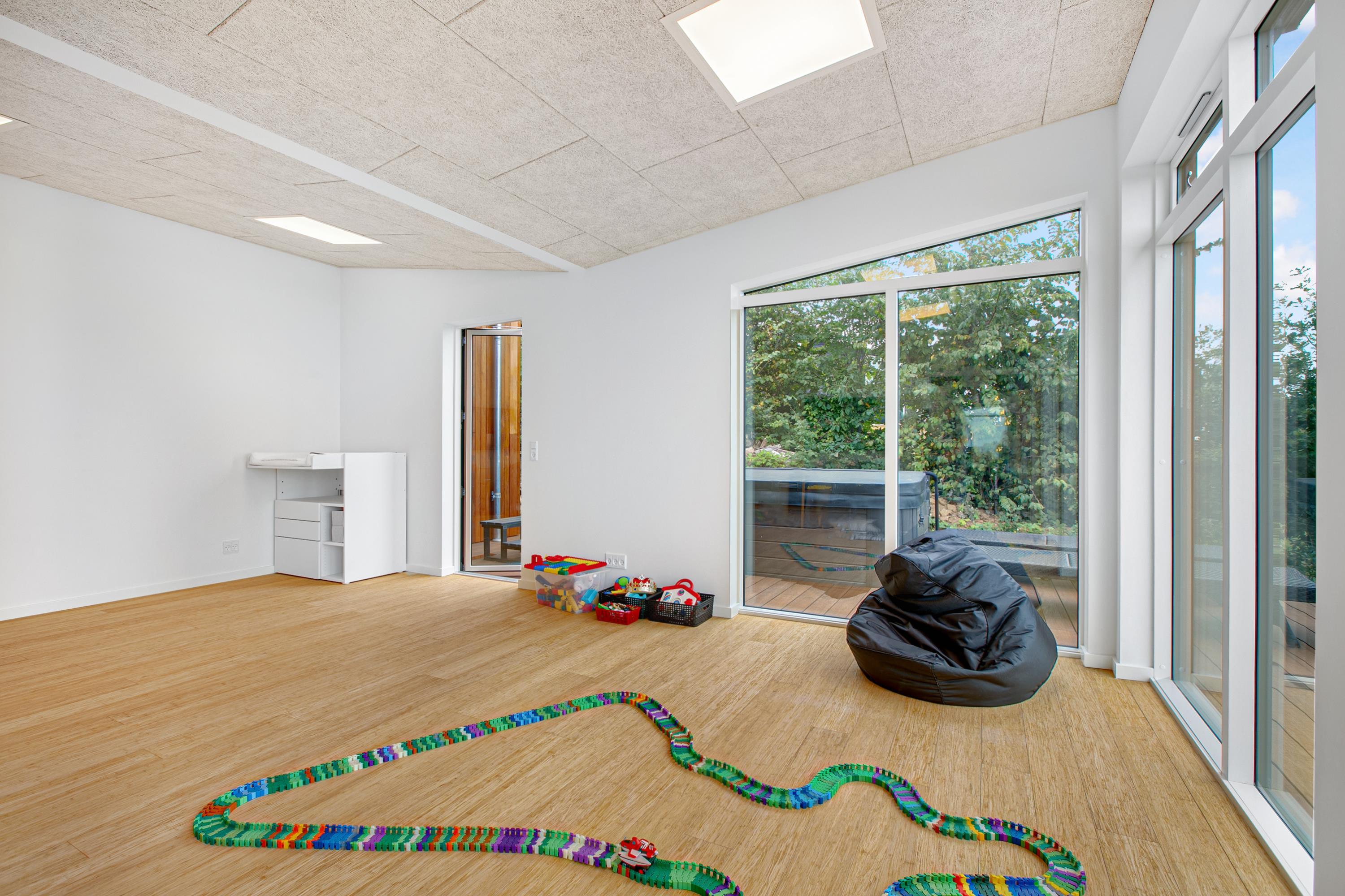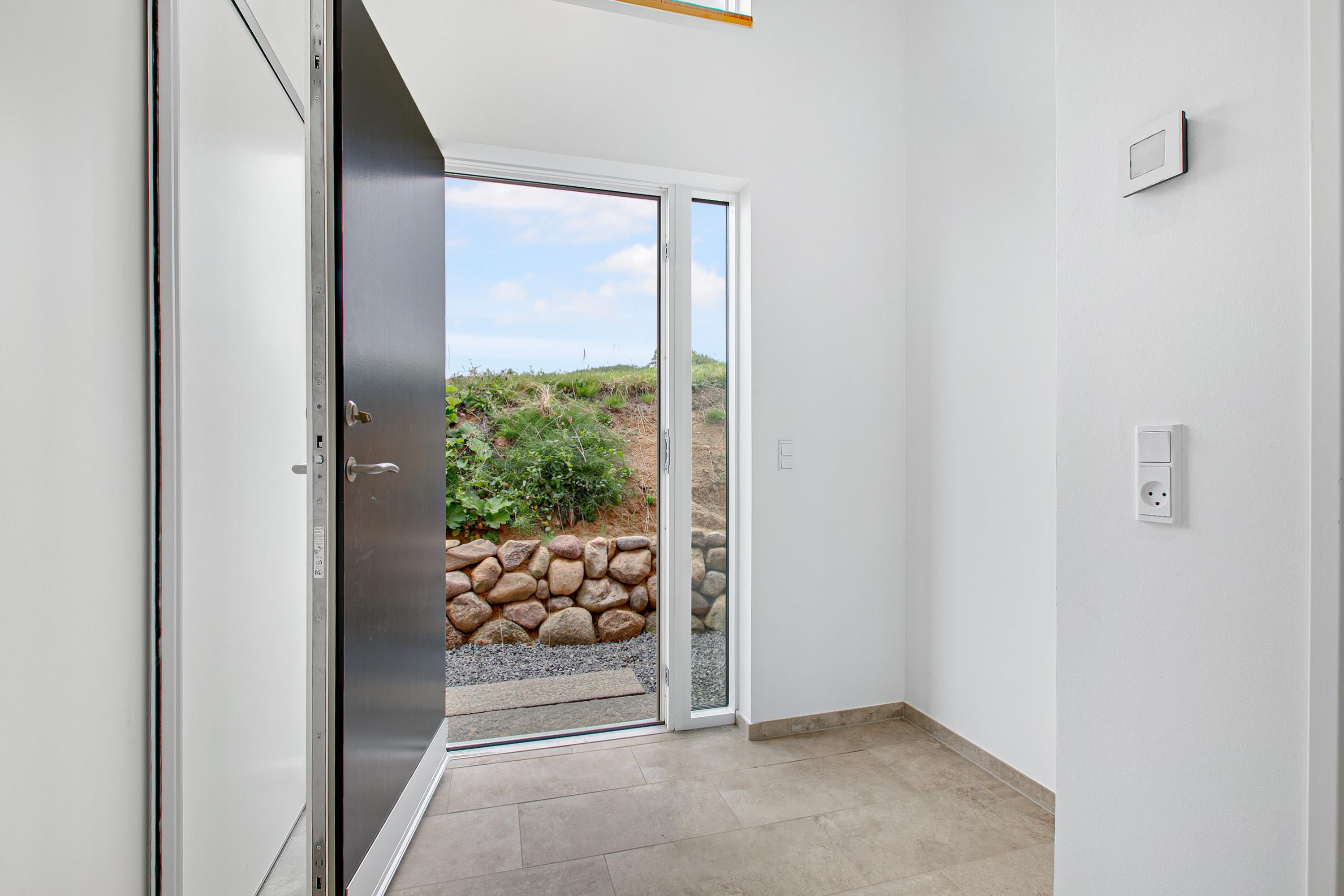 Mit der schönsten Aussicht über Ebeltoft Bucht und bis nach Samsø finden Sie dieses schöne neu gebaute Haus. Das Haus wurde von einem Architekten entworfen und im Hinblick auf Nachhaltigkeit in soliden Materialien gebaut. Das Haus besteht aus Zedernholz, auf dem Dach befinden sich Solarzellen und die Böden sind aus massivem Bambus. Das Haus verfügt über ein großes, helles Wohnzimmer mit stilvollen Möbeln und Panoramablick auf das Wasser. In Verbindung mit dem Wohnzimmer befindet sich die superschöne Küche mit allen Elektrogeräten und von der aus man Zugang zu einer sehr großen und schönen Terrasse mit guten Gartenmöbeln hat. Ein Teil der Terrasse ist überdacht, so dass man bei fast jedem Wetter die schöne Aussicht nach draußen genießen kann. Auf der Terrasse mit Blick auf die Bucht befindet sich ein Whirlpool im Freien für 5 Personen. Die acht Schlafplätze des Hauses verteilen sich auf vier große Zimmer mit Doppelbetten. Es gibt auch einen großen Aktivitätsraum/Spielzimmer mit Tischtennis, Duplo, Flexi-Trax und Spielen. Das Haus verfügt über zwei schöne Badezimmer, von denen eines über einen Whirlpool verfügt. Es gibt auch Zugang zu einer Waschmaschine und einem Wäschetrockner. Es gibt Internet im Haus und Fernsehen ist über Streaming. Das Haus wird mit einer Luft-Wasser-Wärmepumpe beheizt und ist daher günstig im Verbrauch.