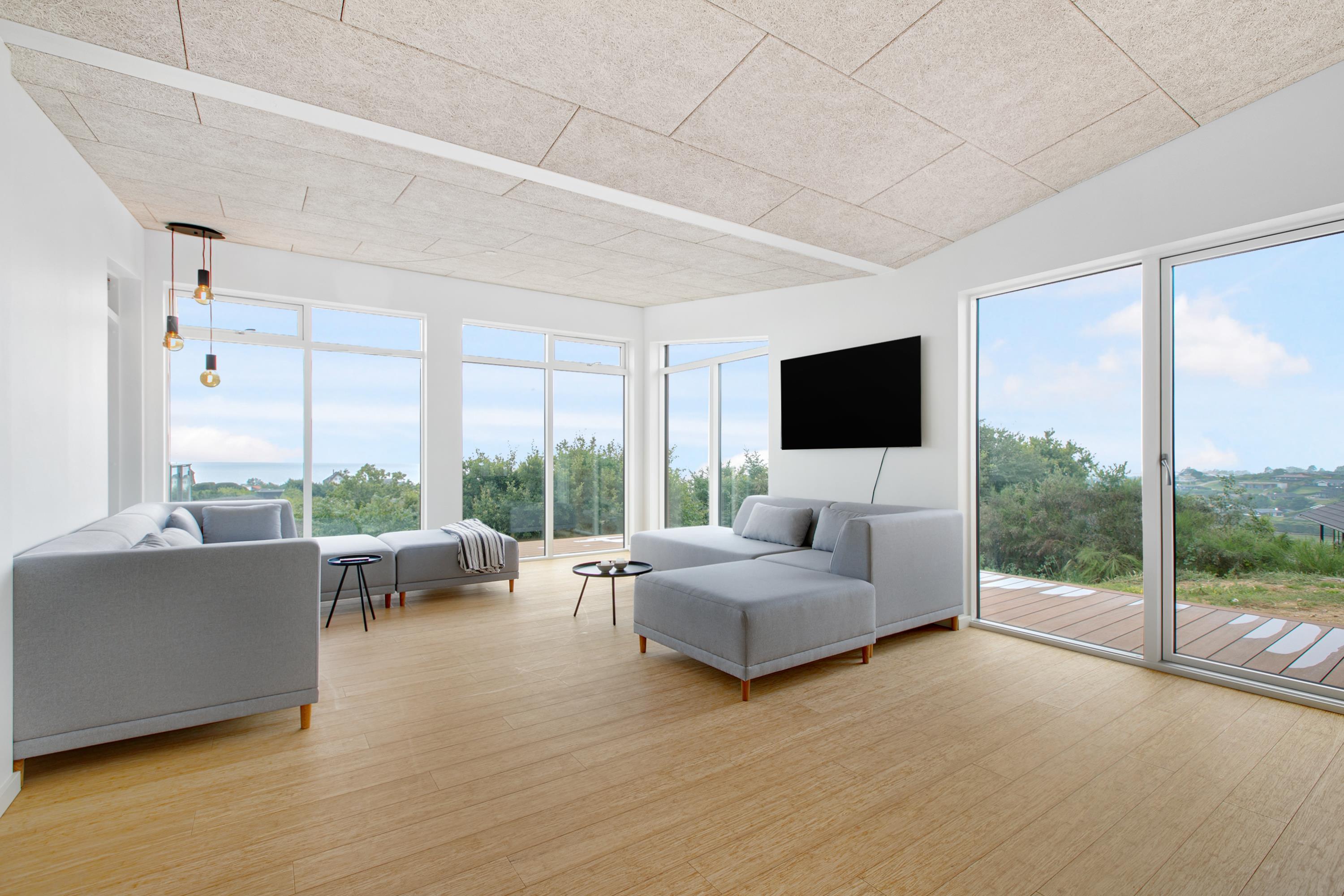 Modernes, nachhaltiges Ferienhaus mit Panoramablick auf die Ebeltoft Bucht und Whirlpool im Freien.