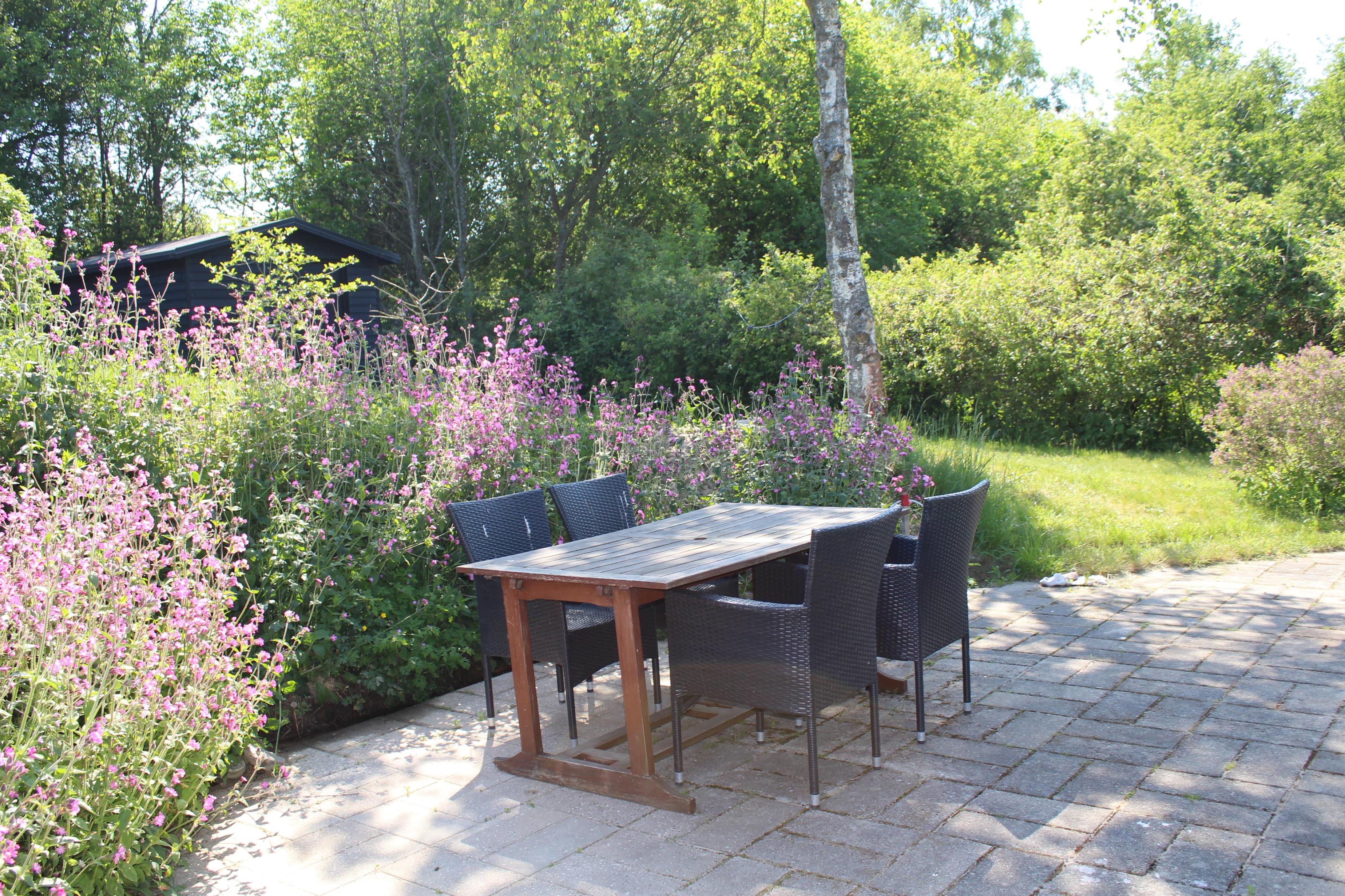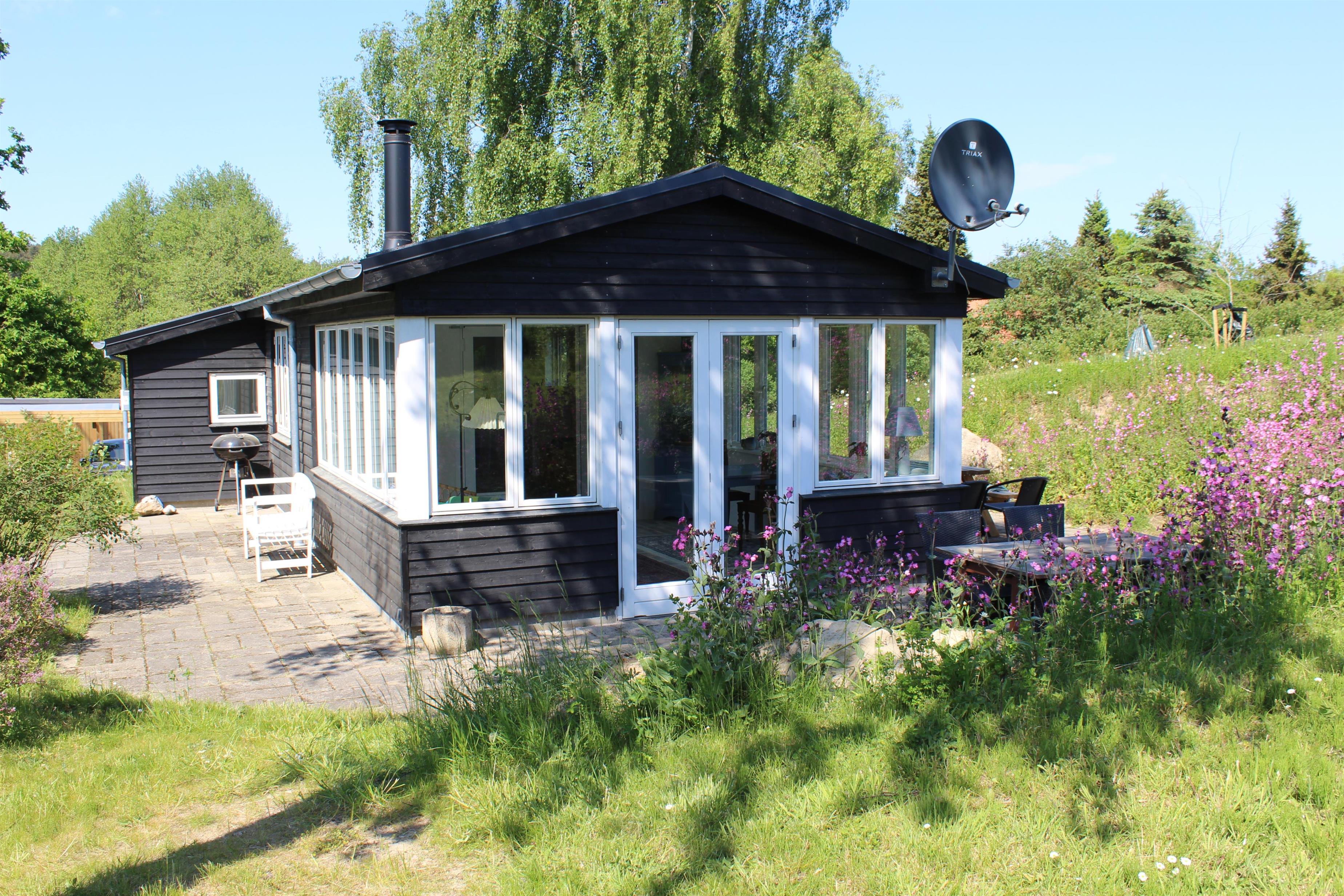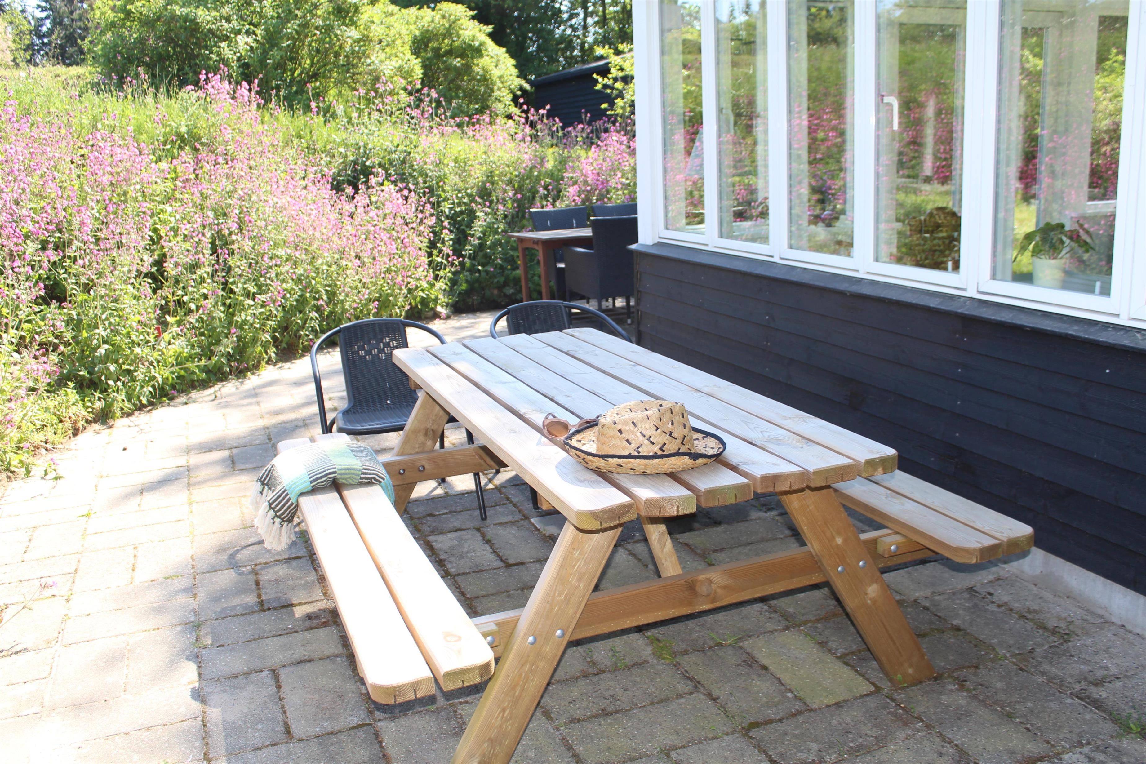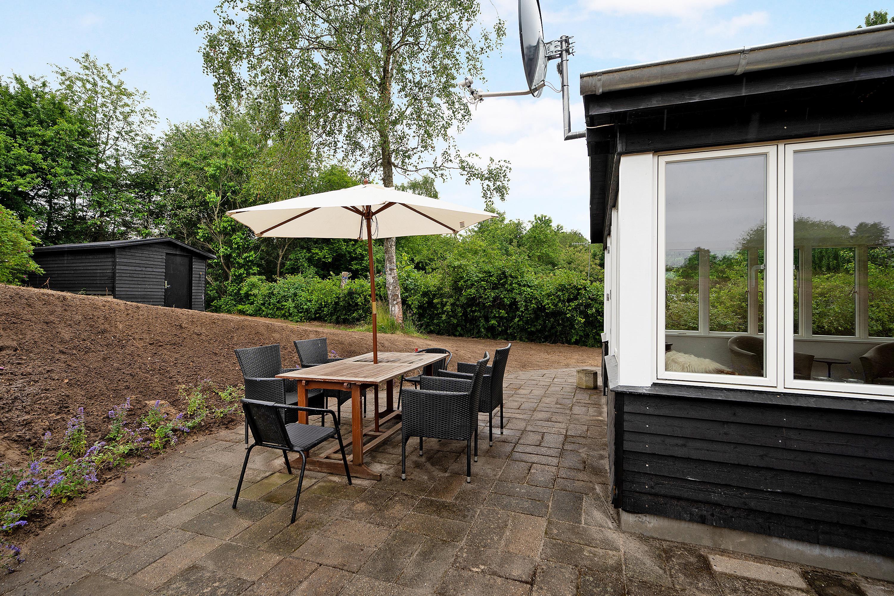 Dieses ältere, aber gepflegte und komplett neu renovierte kleine Ferienhaus liegt auf einem welligen Naturgrundstück im beliebten Gebiet Egsmark Strand an der Bucht Ebeltoft Vig. Fliesenterrasse mit Gartenmöbeln und Grill.