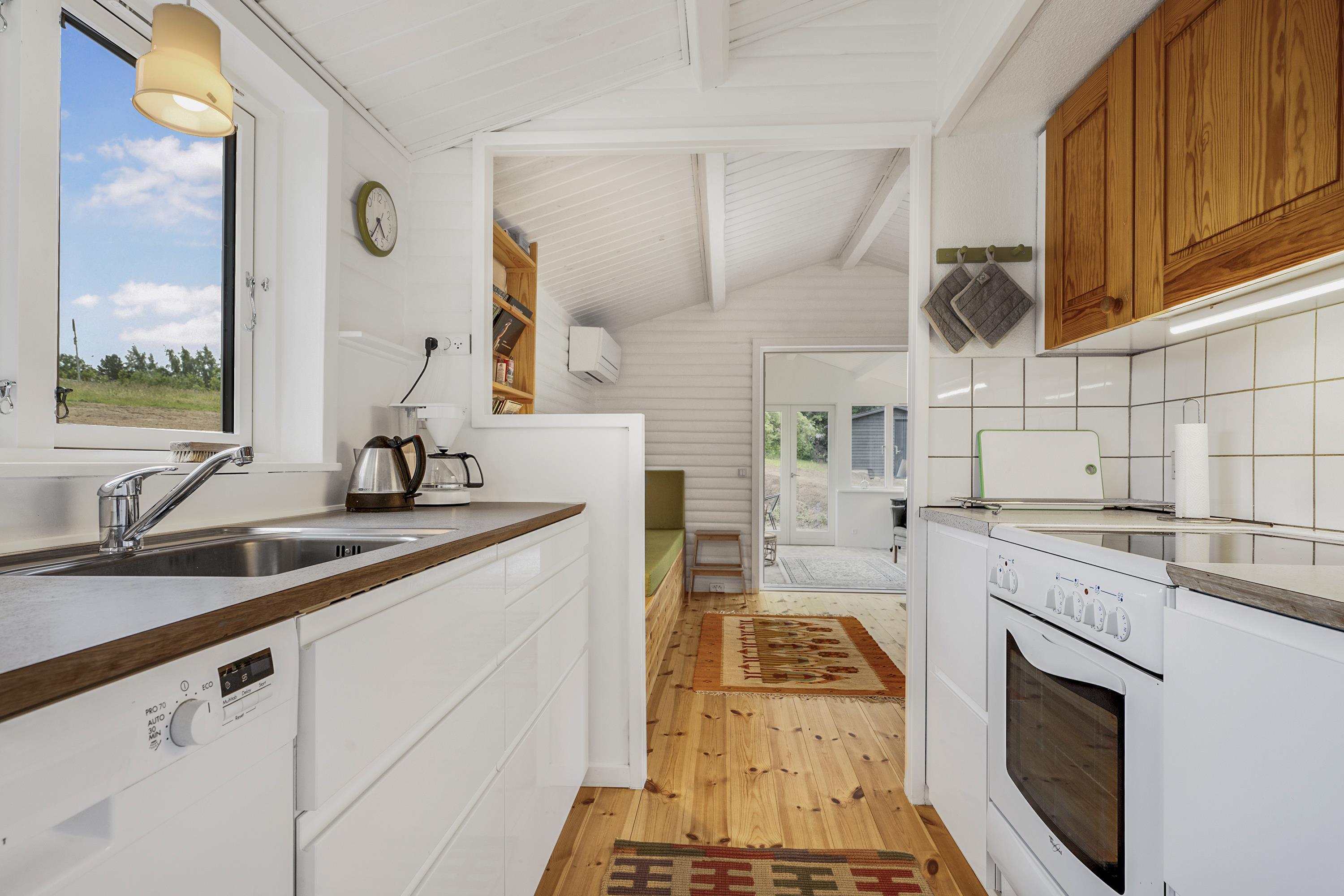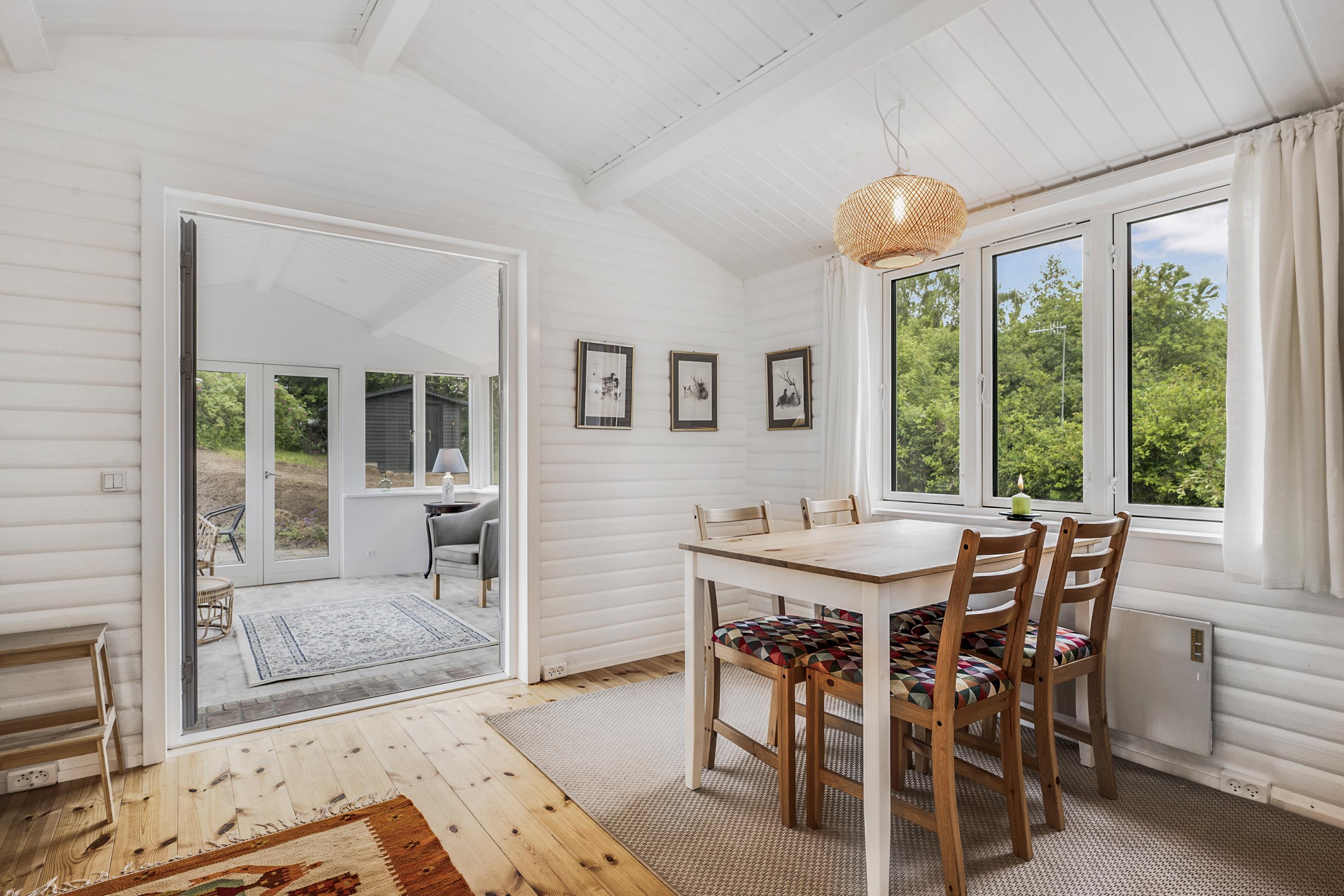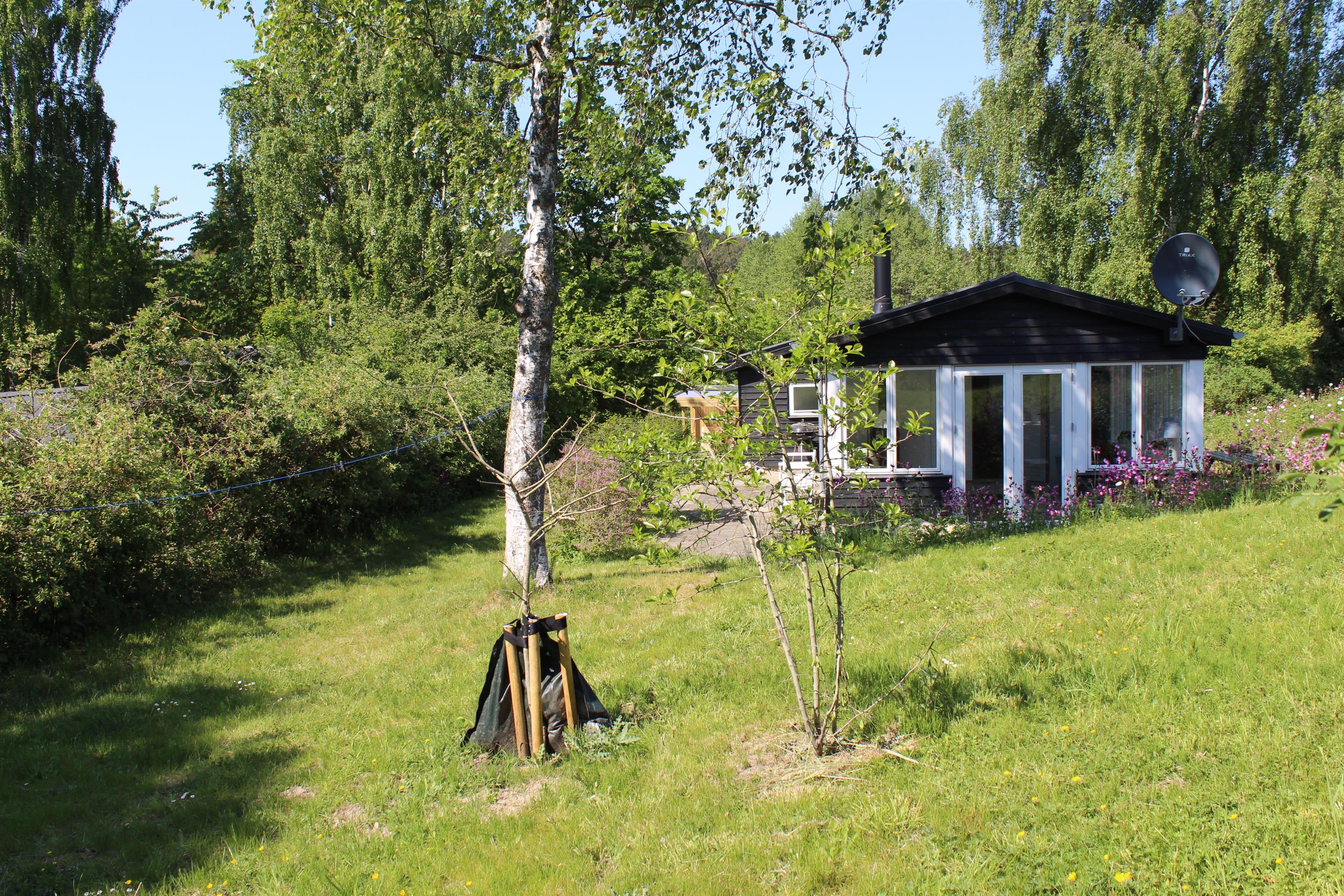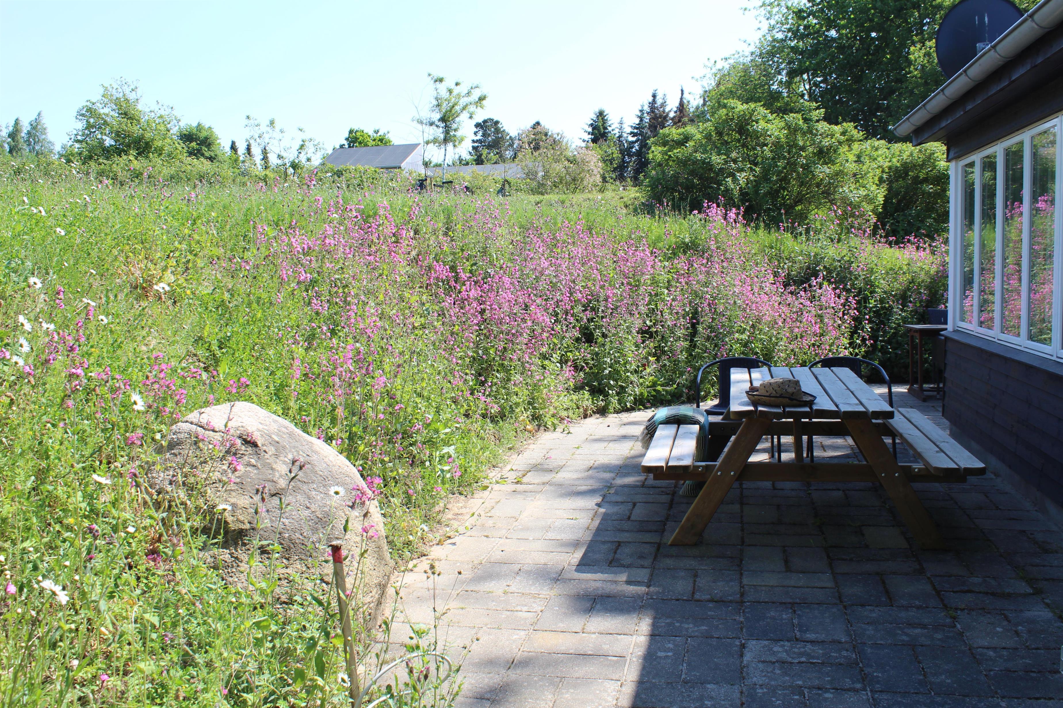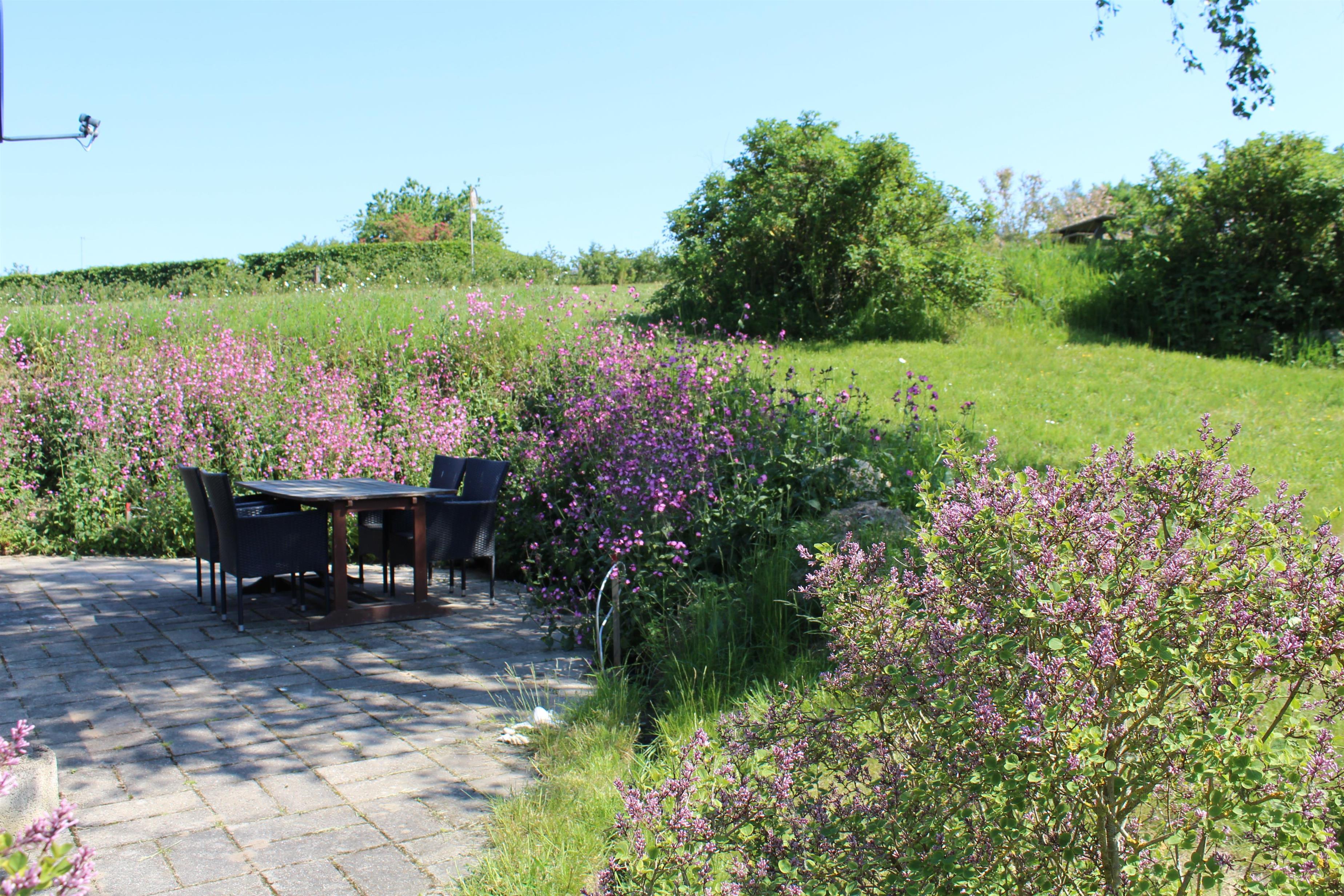Dieses ältere, aber gepflegte und komplett neu renovierte kleine Ferienhaus liegt auf einem welligen Naturgrundstück im beliebten Gebiet Egsmark Strand an der Bucht Ebeltoft Vig. Fliesenterrasse mit Gartenmöbeln und Grill.