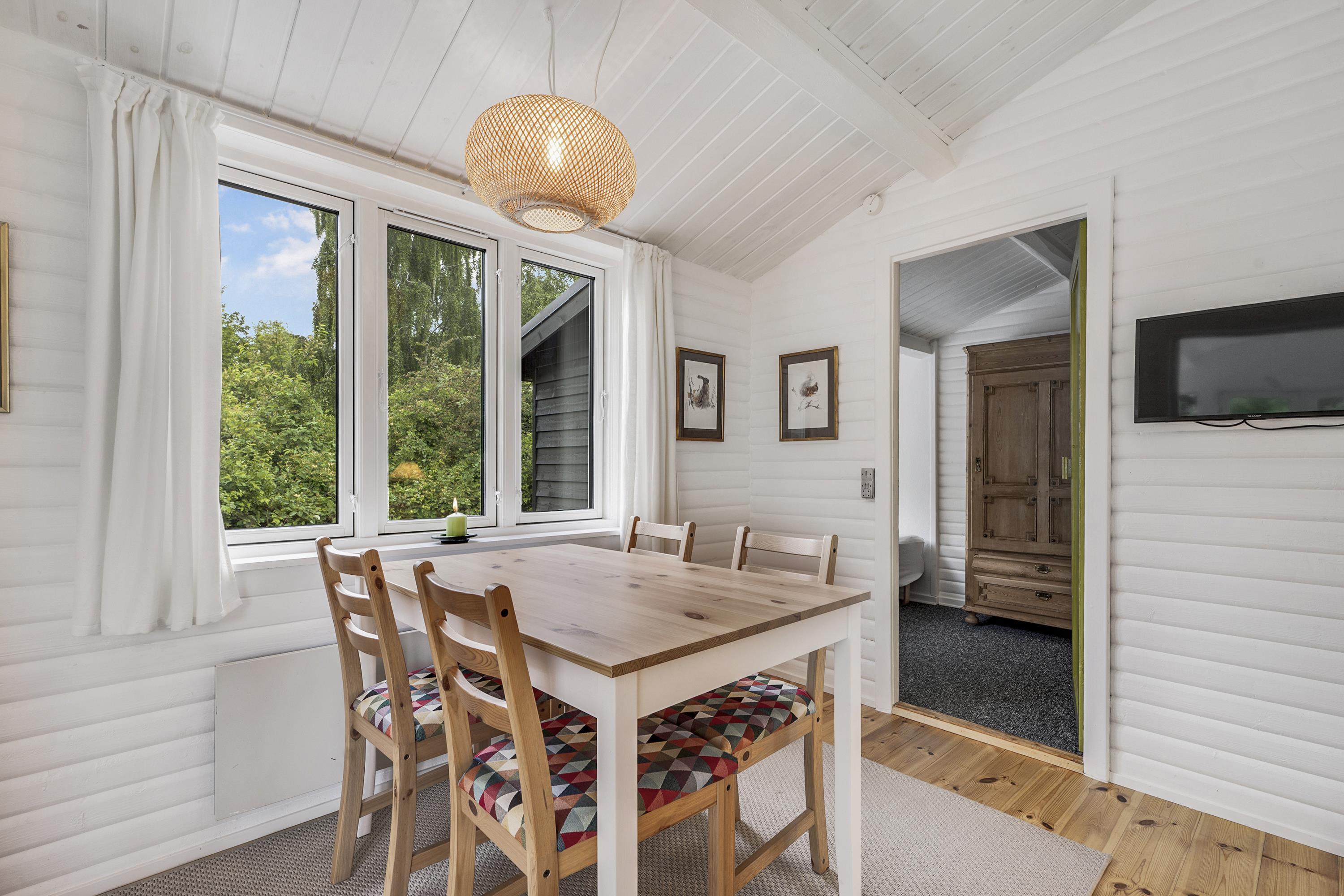Gemütliches, helles Wohnzimmer mit schönem Essplatz für vier Personen, Fernseher mit dänischen und deutschen Programmen sowie Radio.