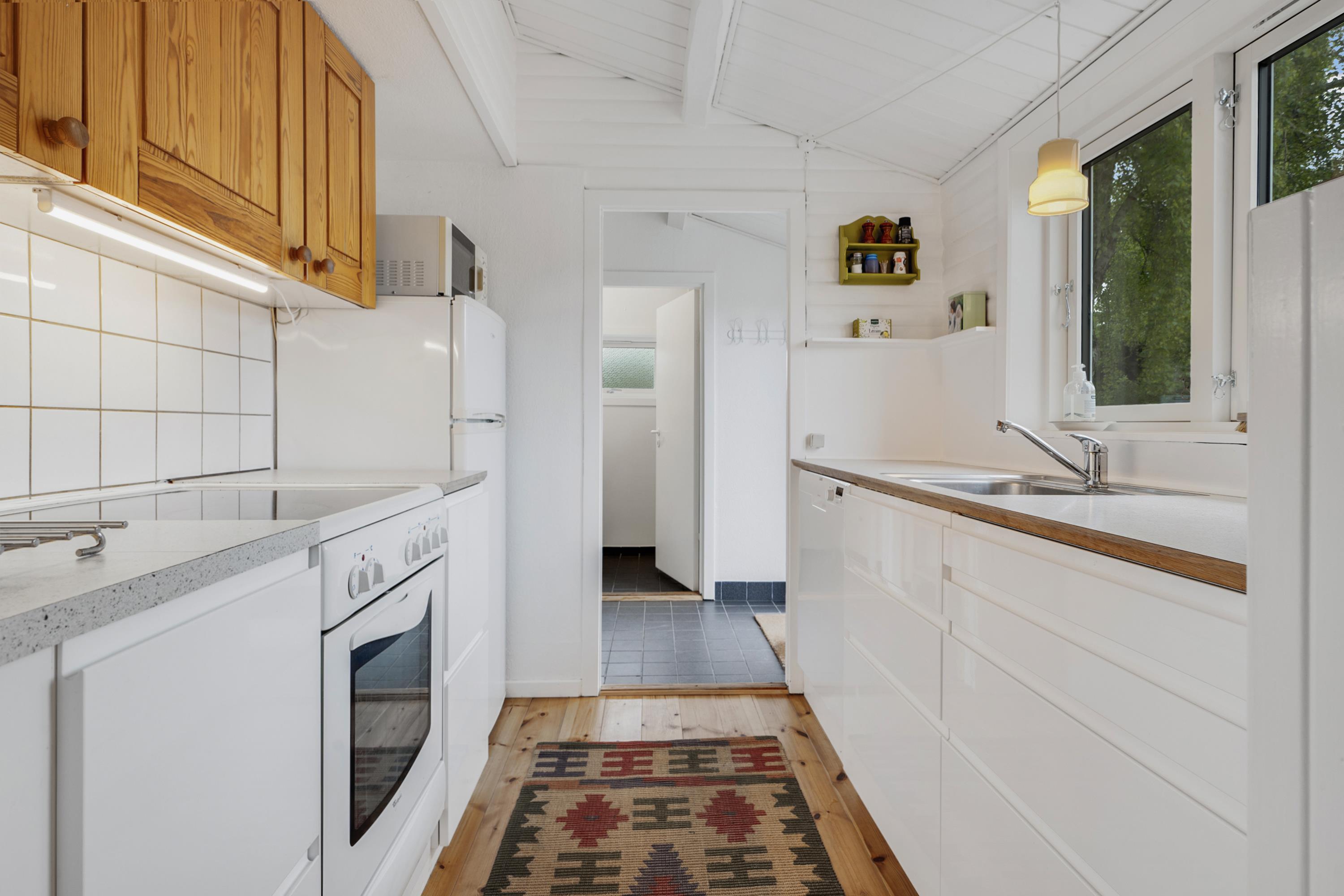 In offener Verbindung dazu liegt die funktionelle neue Küche mit Glaskeramikherd, Kühl-/Gefrierkombination, Geschirrspüler und Mikrowelle.