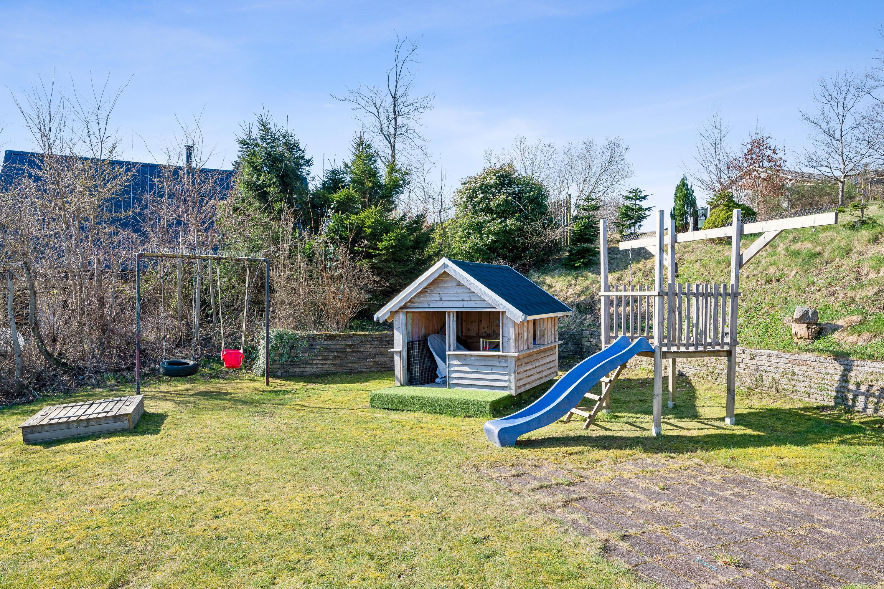 Das Haus liegt auf einem abschüssigen Grundstück mit Rasen und einer schönen Terrasse mit Gartenmöbeln und Grill. Auch im Außenbereich wurde an die kleinen Gäste gedacht – mit Sandkasten, Schaukel, Rutsche und Spielhaus.