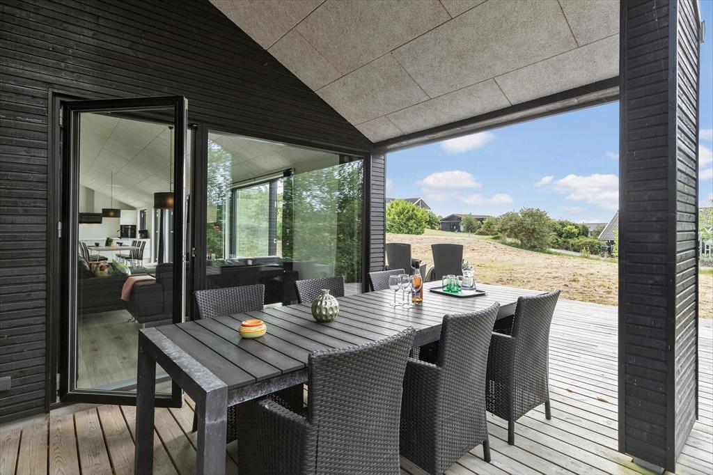 Unter freiem Himmel erwartet dich ein 1.212 m² großes Naturgrundstück, das viel Platz zum Spielen und Erholen bietet. Auf der teilweise überdachten Terrasse kannst du dich in aller Ruhe niederlassen und allabendlich in gemütlicher Runde mit deiner Familie grillen. Die Umgebung ist friedvoll und landschaftlich schön. Lediglich 400 Meter trennen dein Ferienhaus von einem schönen, kinderfreundlichen Strand, an dem ihr zusammen nach Herzenslust baden, Sandburgen bauen, spielen und lange Strandspaziergänge unternehmen könnt. Ein Teil der Terrasse verwöhnt sogar mit einem "kleinen" Blick auf das Meer - perfekt für den ersten Becher Kaffee des Tages.