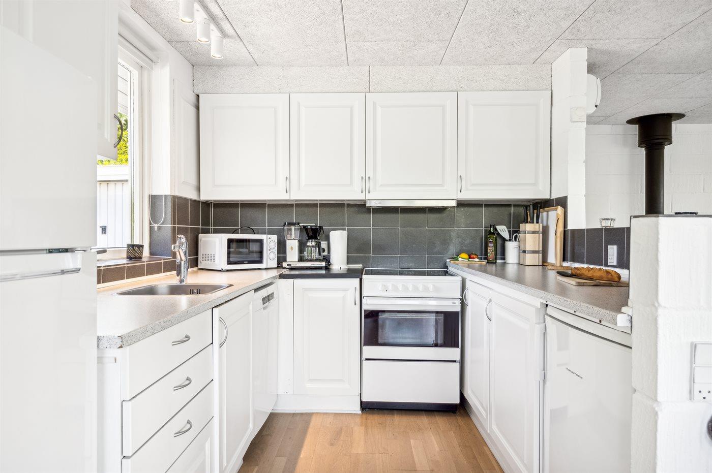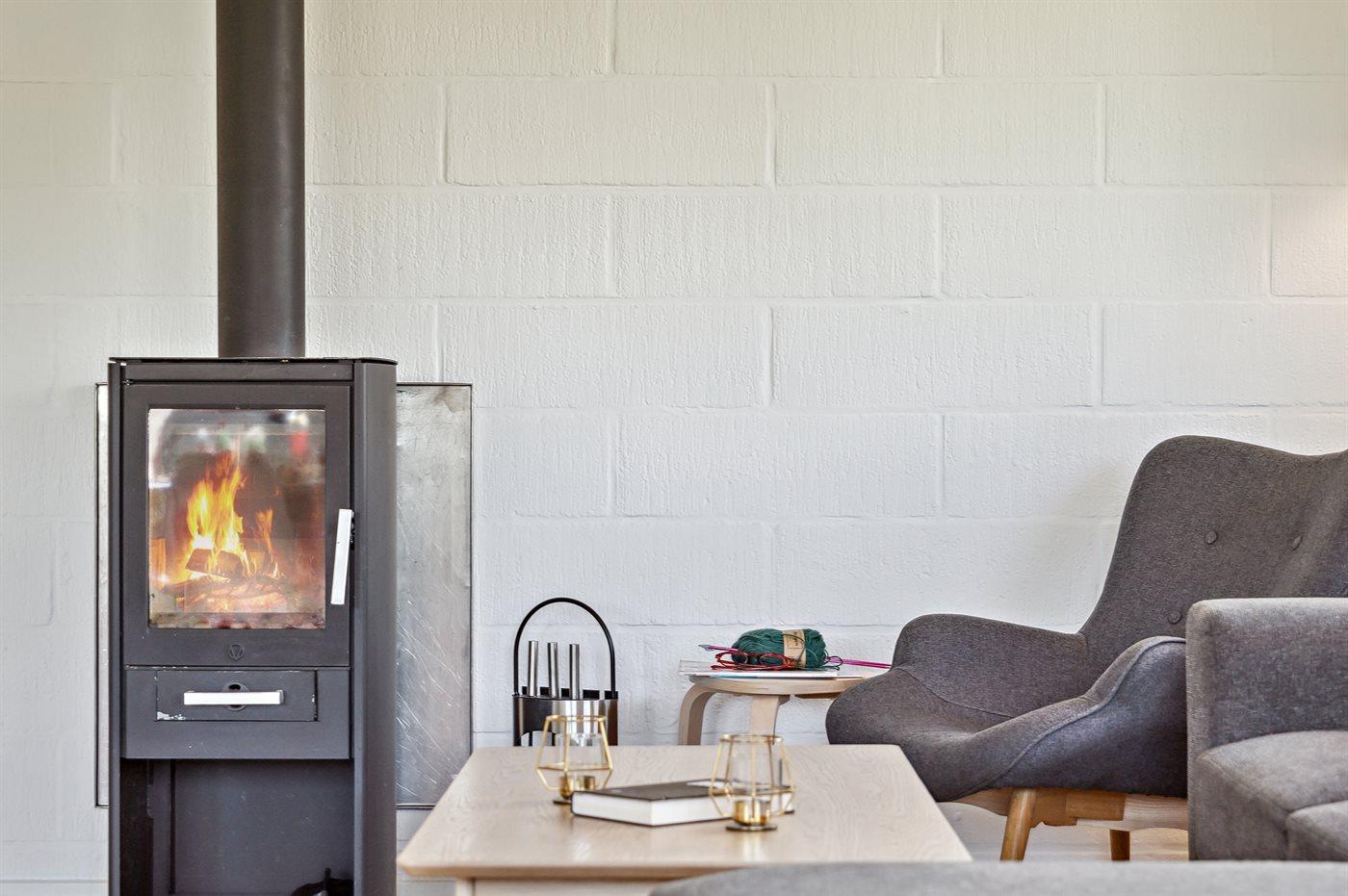 Vom Eingang deines Ferienhauses aus gelangst du zum Badezimmer und zur Toilette. Links findest du die zwei gemütlichen Schlafzimmer des Hauses. Der offene Wohn- und Essbereich ist ideal für das Zusammensein mit der Familie, und hier gibt es sowohl einen Kaminofen für die kühleren Abende als auch ein Smart-TV mit Chromecast, damit du deine Lieblingsdienste streamen kannst. Die Küche ist offen und in den Wohnraum integriert.