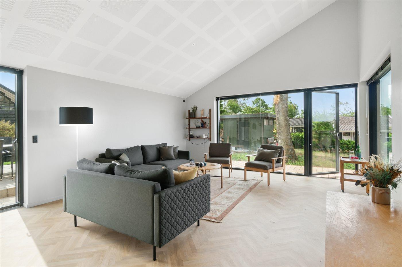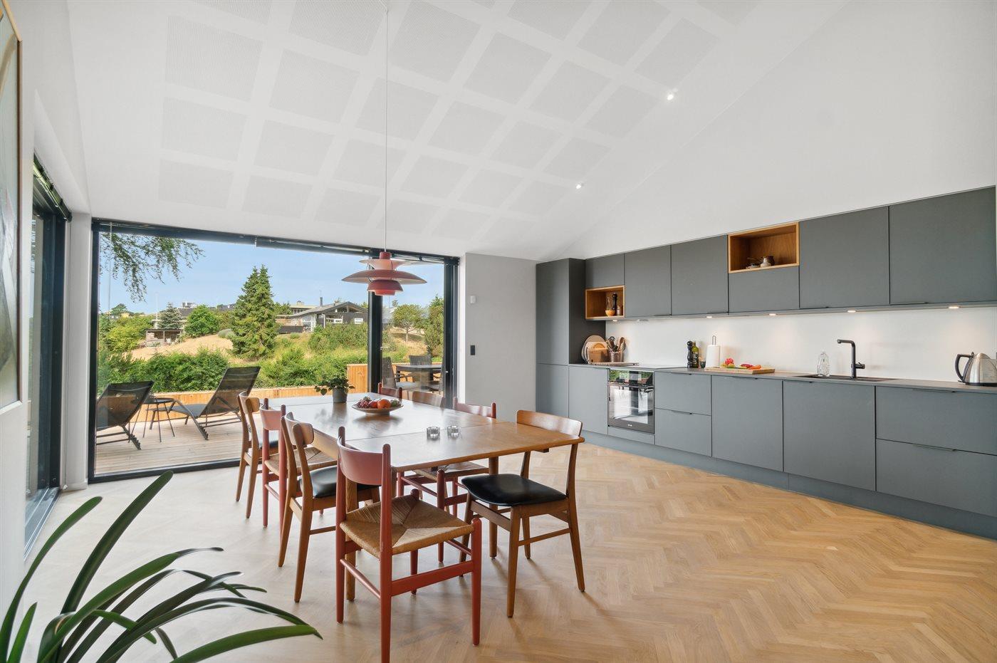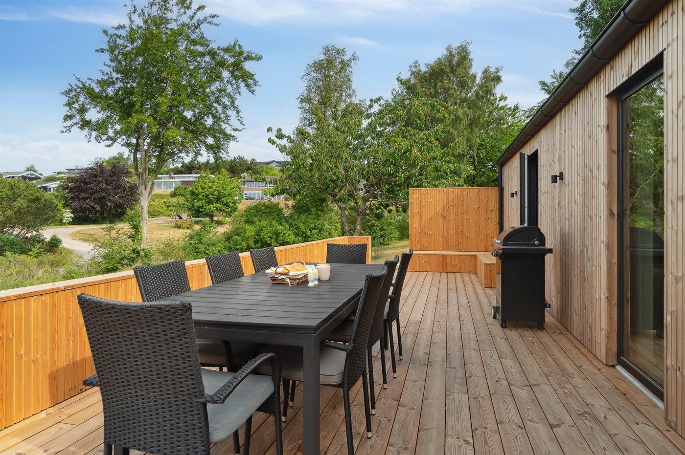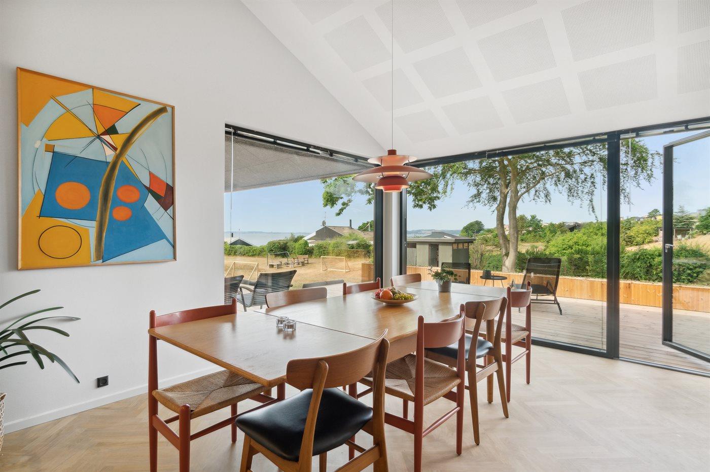 Modernes Ferienhaus mit Meerblick und großem Garten nahe Ebeltoft, ideal für Familien und Erholungssuchende.
