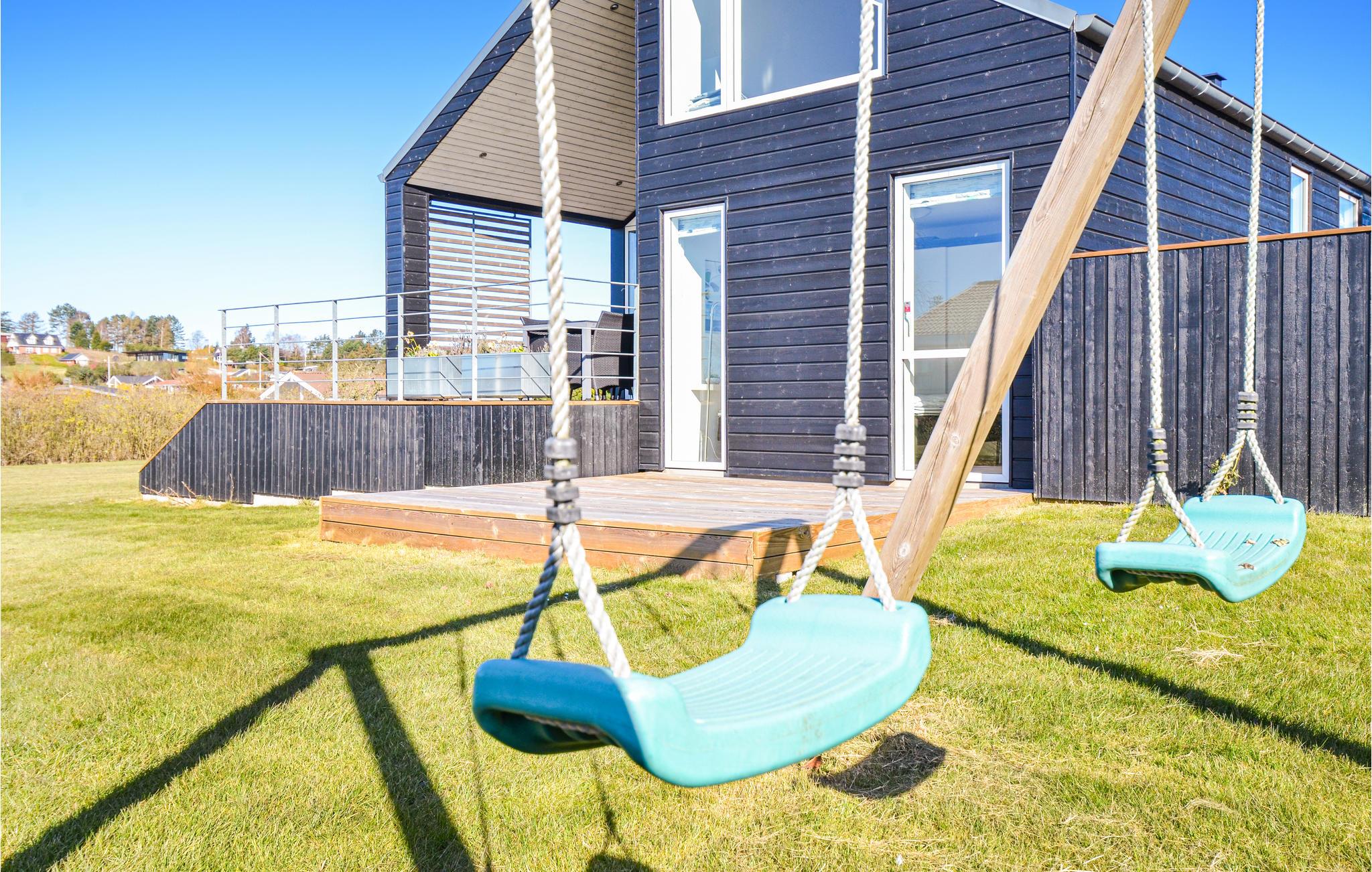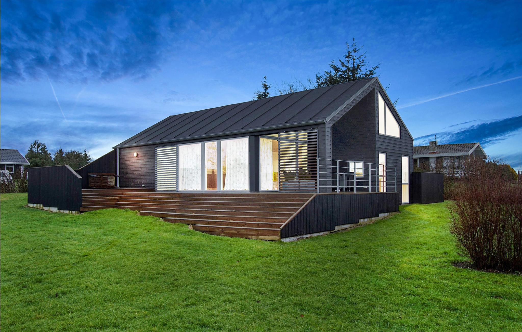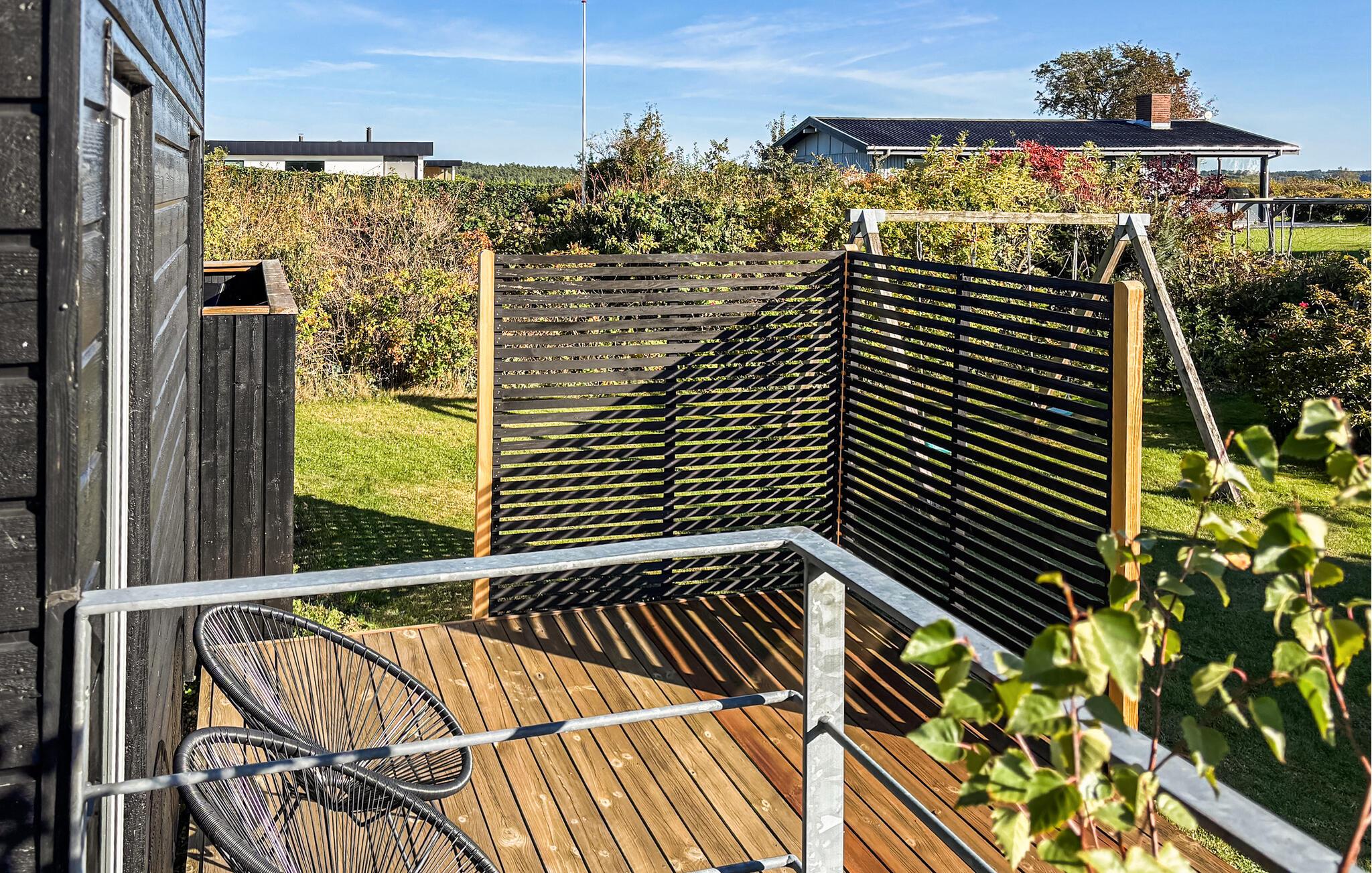 Modernes Ferienhaus nahe Ebeltoft mit großer Terrasse, Garten und Zugang zum Strand für einen entspannten Urlaub.