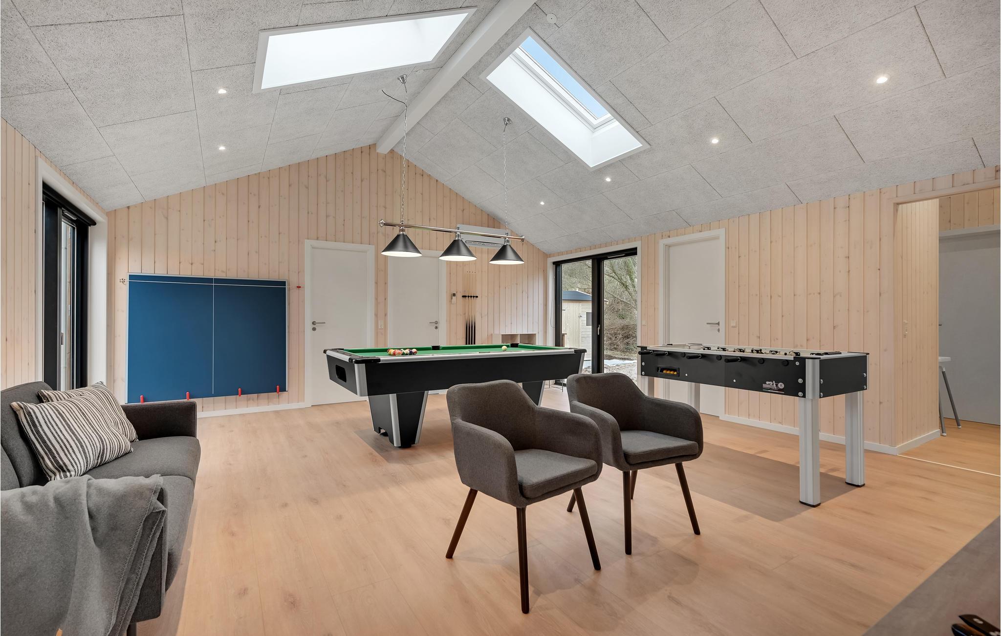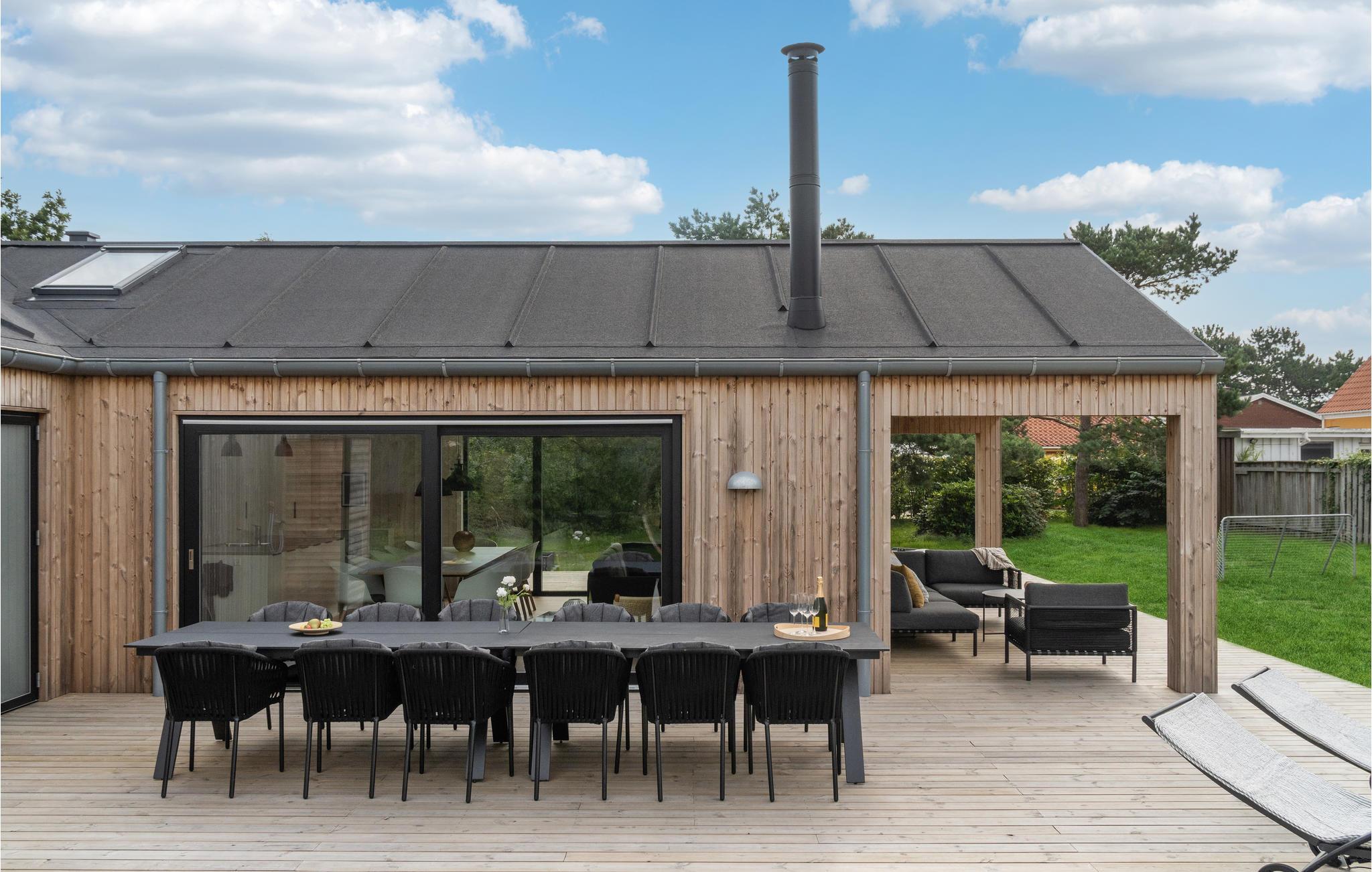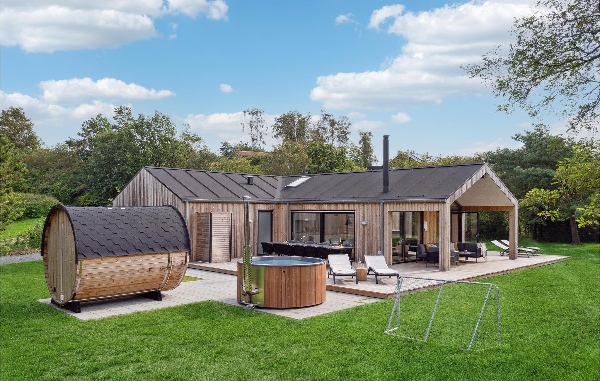 Modernes Luxus-Ferienhaus am Egsmark Strand mit Wellness, Aktivitätsraum und Garten für entspannte Urlaubstage.