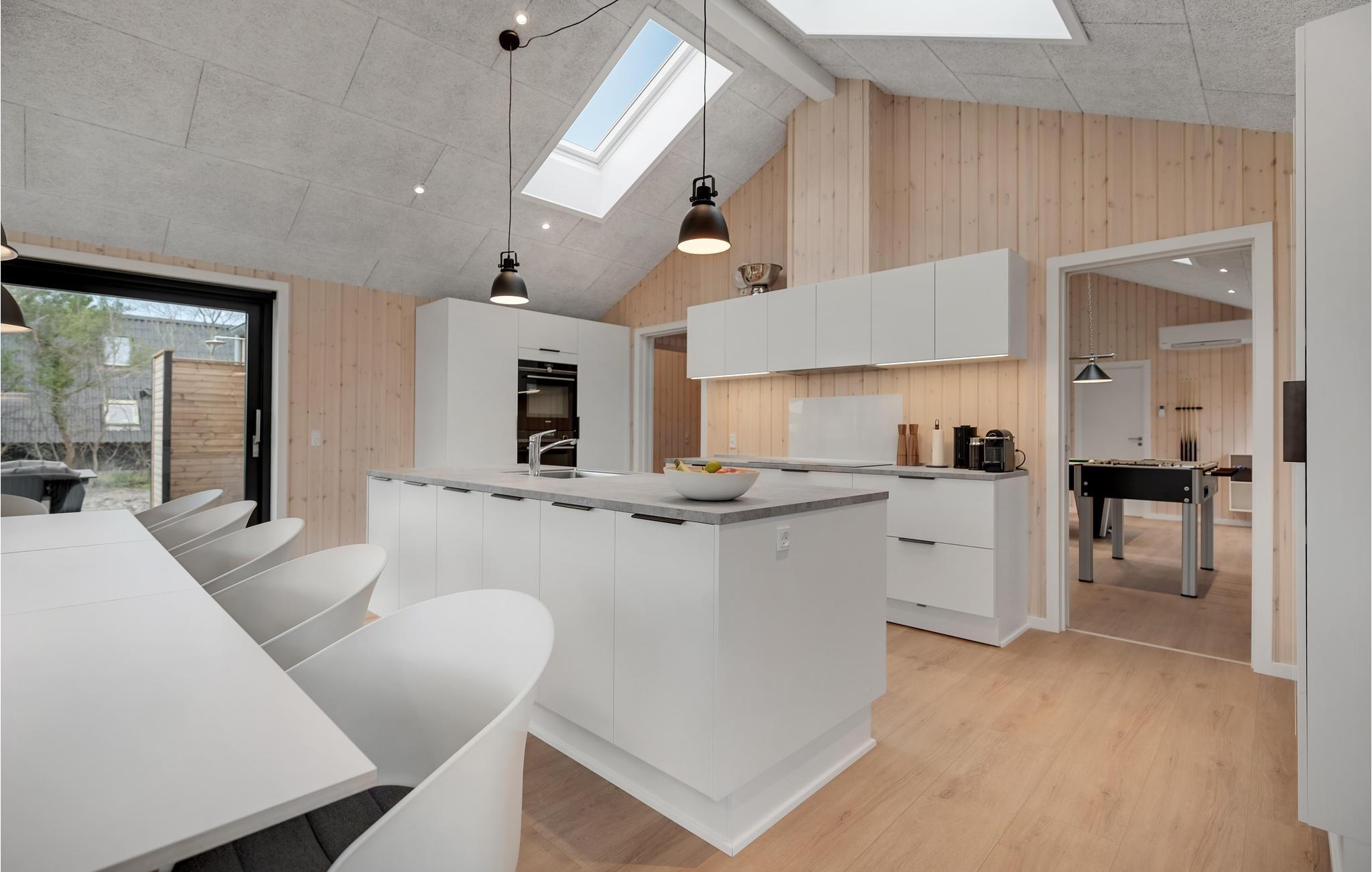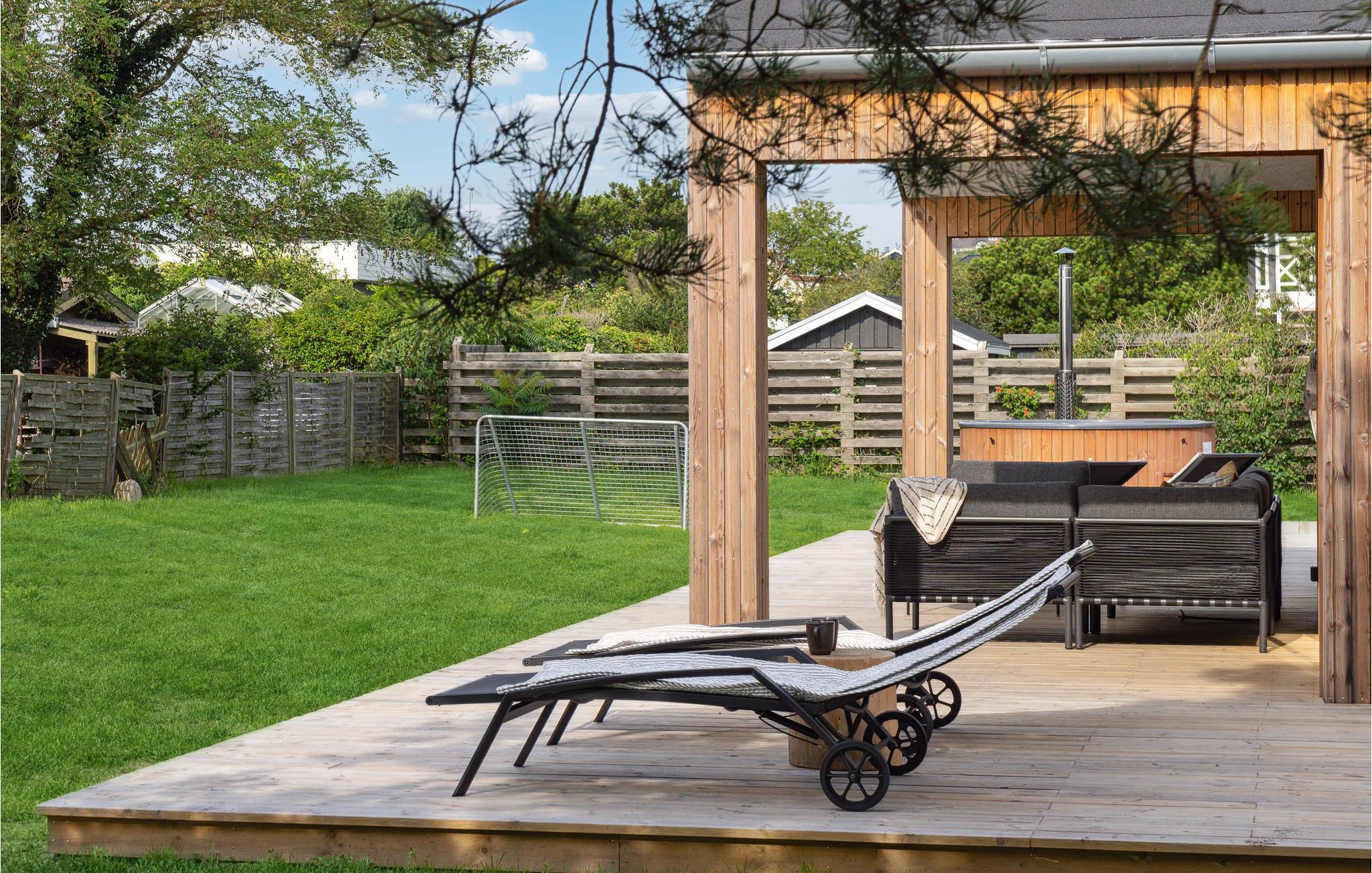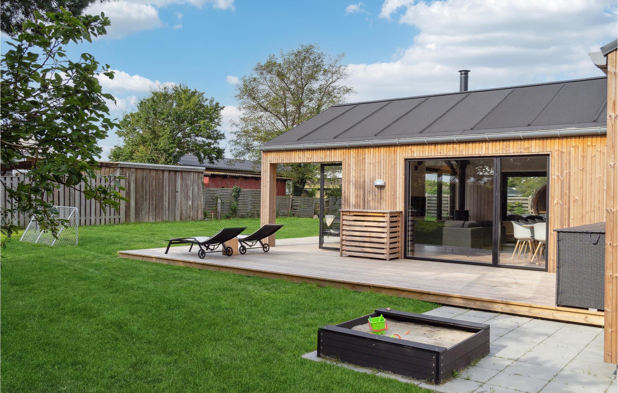 Modernes Luxus-Ferienhaus am Egsmark Strand mit Wellness, Aktivitätsraum und Garten für entspannte Urlaubstage.