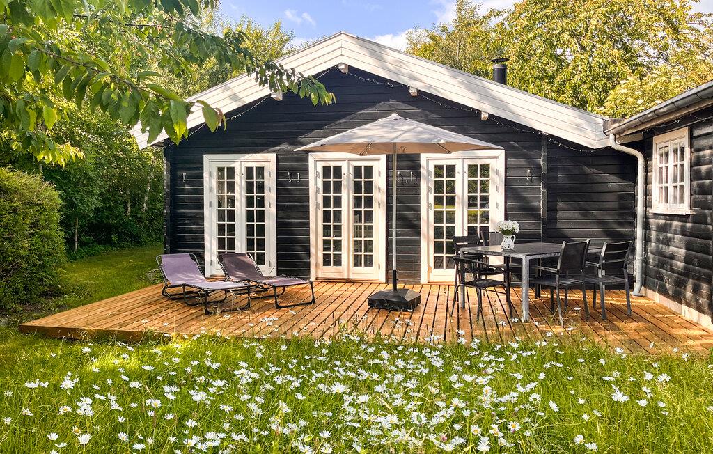 Charmantes Blockhaus mit großem Garten nahe Ejby Strand in Dänemark, ideal für entspannte Familienurlaube.