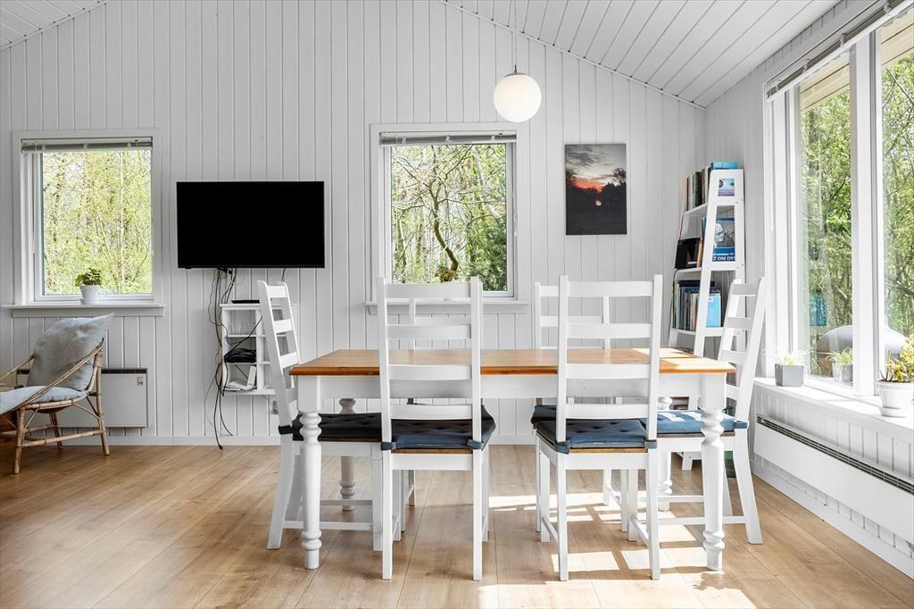 Das schöne, gut eingerichtete Ferienhaus mit einer Wohnfläche von 76 m² wurde im Jahr 2018 renoviert. Der Aufenthaltsraum besticht mit einer hellen und leichten Atmosphäre, die auf die weißgestrichenen Holzwände und die hohen Decken zurückzuführen ist. Der Kaminofen sorgt für ein Maximum an echtem Ferienhausflair. Zu den modernen Annehmlichkeiten zählen ein Fernseher mit Chromecast und eine gute WiFi-Verbindung. Die modernen Medien werden in Anbetracht des schönen Fjordblick allerdings eher zur Nebensache. Die schöne Küche fügt sich offen in den Wohnraum ein. Zur Wohnfläche zählen darüber hinaus ein ansprechendes Duschbadezimmer mit einer Waschmaschine und zwei gute Schlafräume. Beide Räume verfügen über jeweils ein Doppelbett. Vom Eingangsbereich gelangen Sie auf einen großen Schlafboden mit zusätzlichen Matratzen.