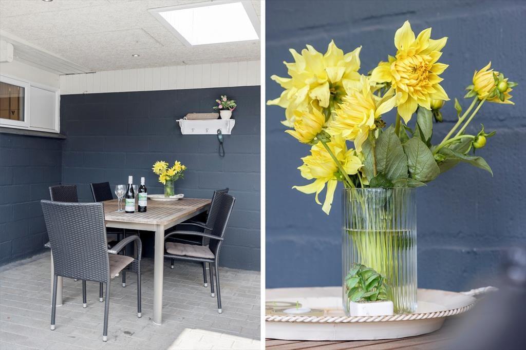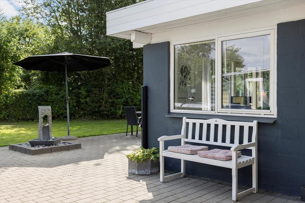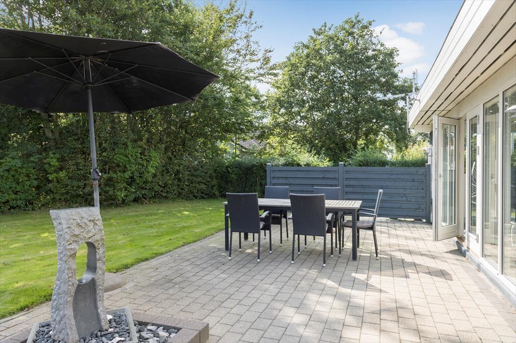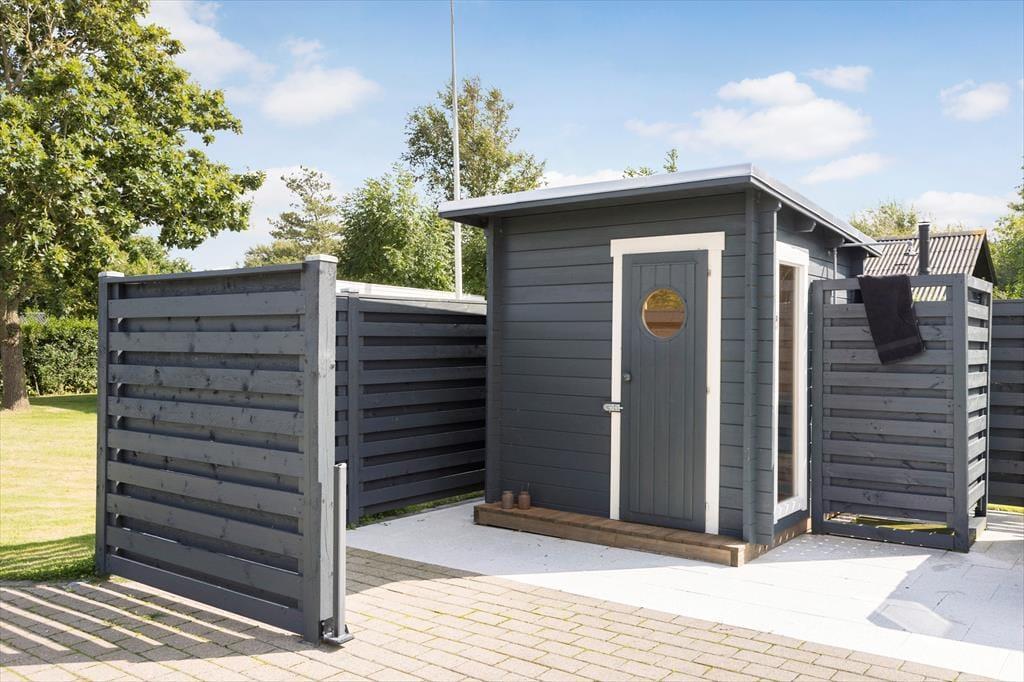 Das grüne Gartengrundstück präsentiert sich mindestens genauso schön und gepflegt wie dein Ferienhaus. Zudem weiß es mit einigen schönen Details zu punkten. Zu diesen Details zählt beispielsweise das Terrassenareal, das als eine Art Outdoor-Wellnessbereich fungiert. Deine Familie darf sich auf eine große schöne Outdoor-Sauna und auf eine Außendusche freuen. Letztgenannte lädt nicht nur zu einem frischen Duschbad unter dem blauen Morgenhimmel ein, sondern spült euch nach einem Tag am Strand den Sand und das Salz von der Haut. Die gute Rasenfläche bietet beste Möglichkeiten für eine Runde Wikingerschach und andere unterhaltsame Familienspiele. Erholsame und ruhige Momente genießt ihr zusammen auf den offenen und überdachten Terrassenbereichen, die mit Gartenmöbeln ausgestattet sind.