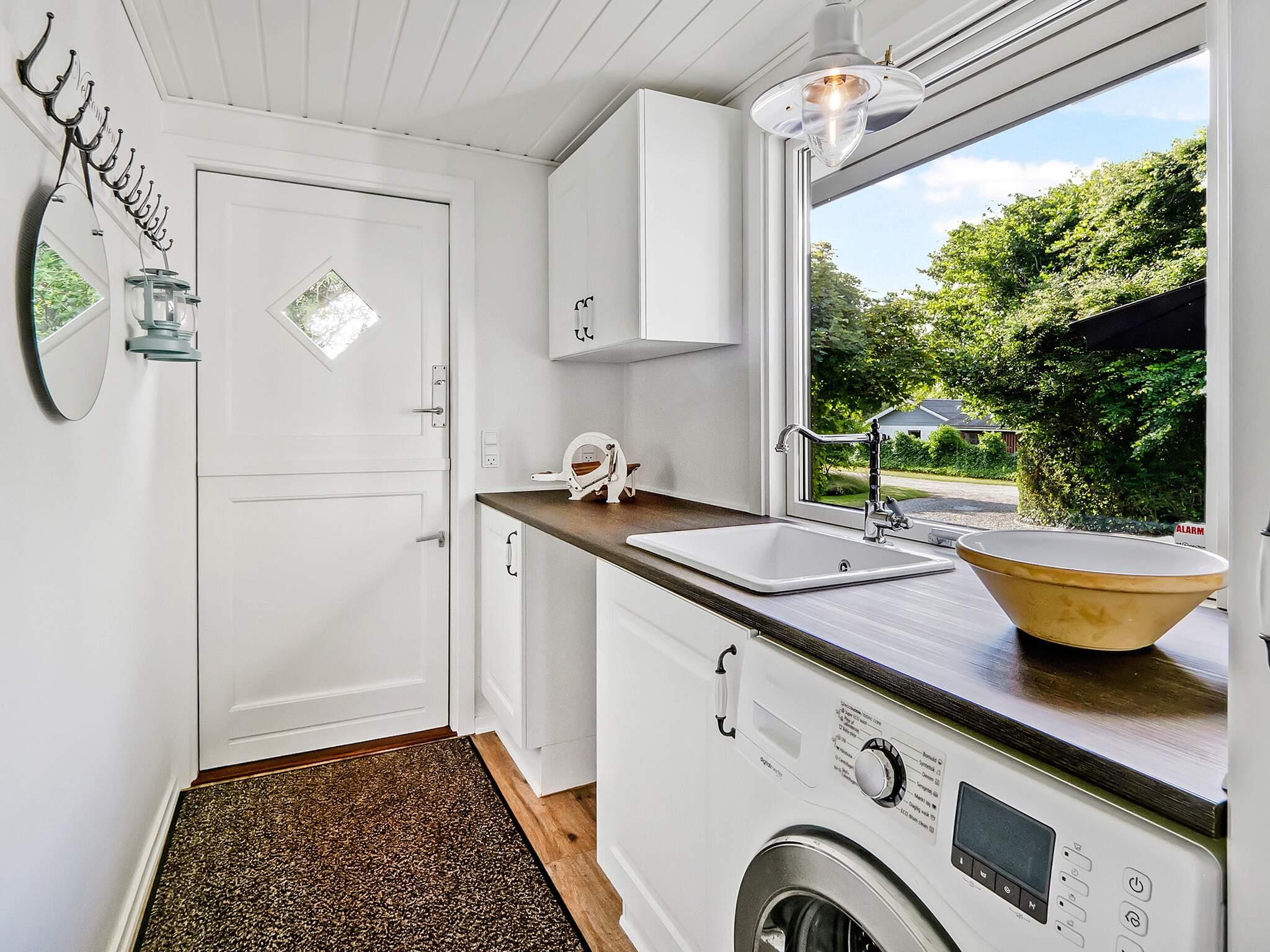 Die Küche ist mit einem Cerankochfeld, einem separaten Backofen mit Grill, einer Dunstabzugshaube, einer Mikrowelle, einem Geschirrspüler und einer Kaffeemaschine ausgestattet. Für kühle Sommerabende oder verregnete Herbstabende steht ein Holzofen zur Verfügung. Die Küche bietet einen Panoramablick auf das Wasser und direkten Zugang zur Terrasse.