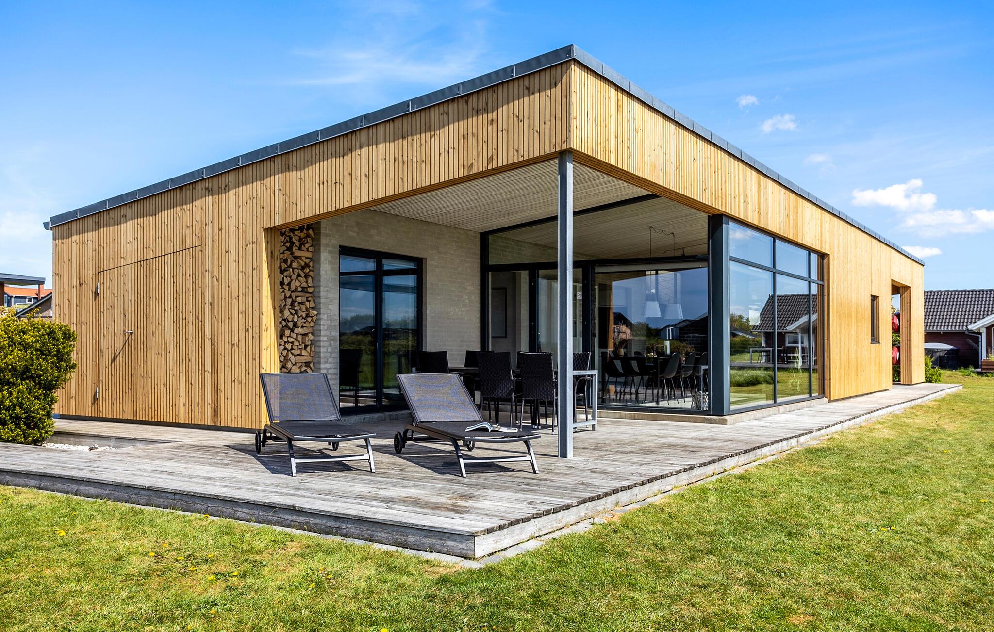 Modernes Ferienhaus mit Blick auf den Limfjord, offener Dachfirst und zwei Terrassen für entspannte Stunden.