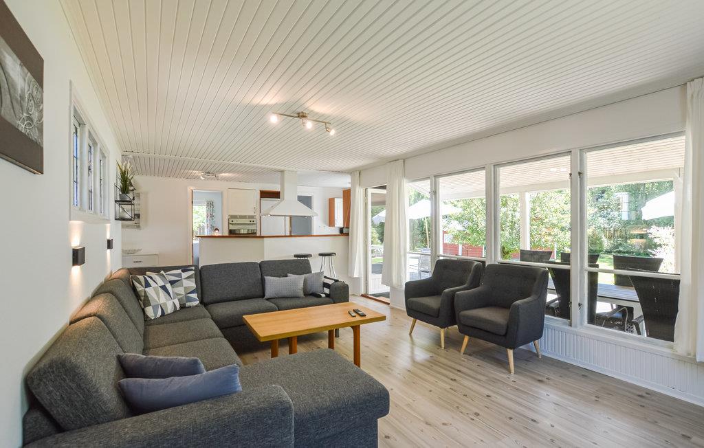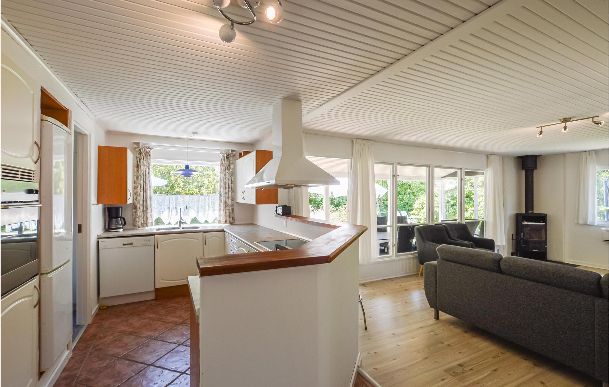 Großes Ferienhaus mit Sauna und vier Schlafzimmern, schöner Küche, die zum Ess- und Wohnzimmer offen ist.