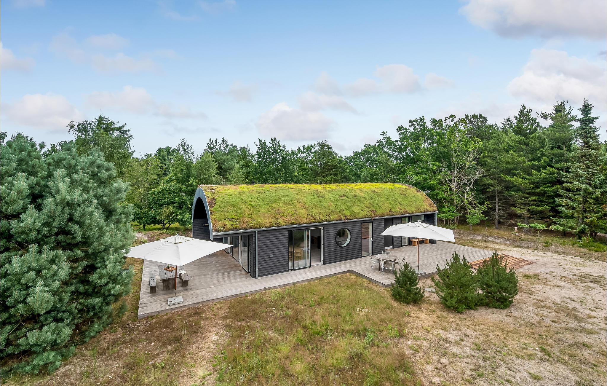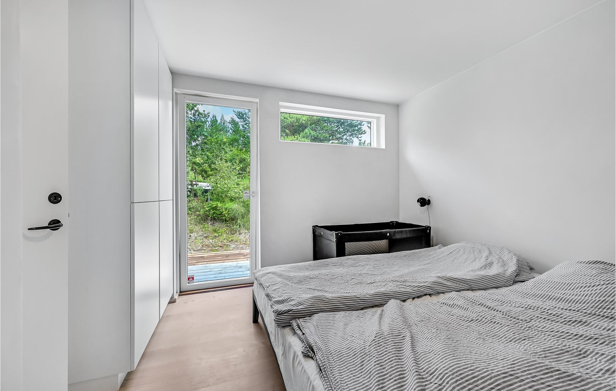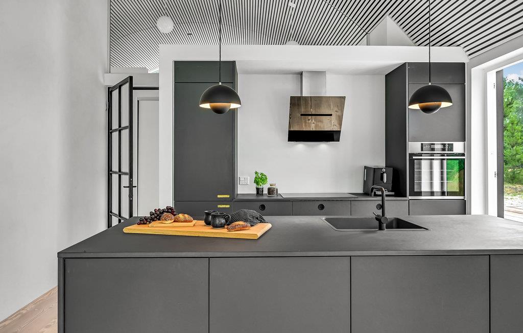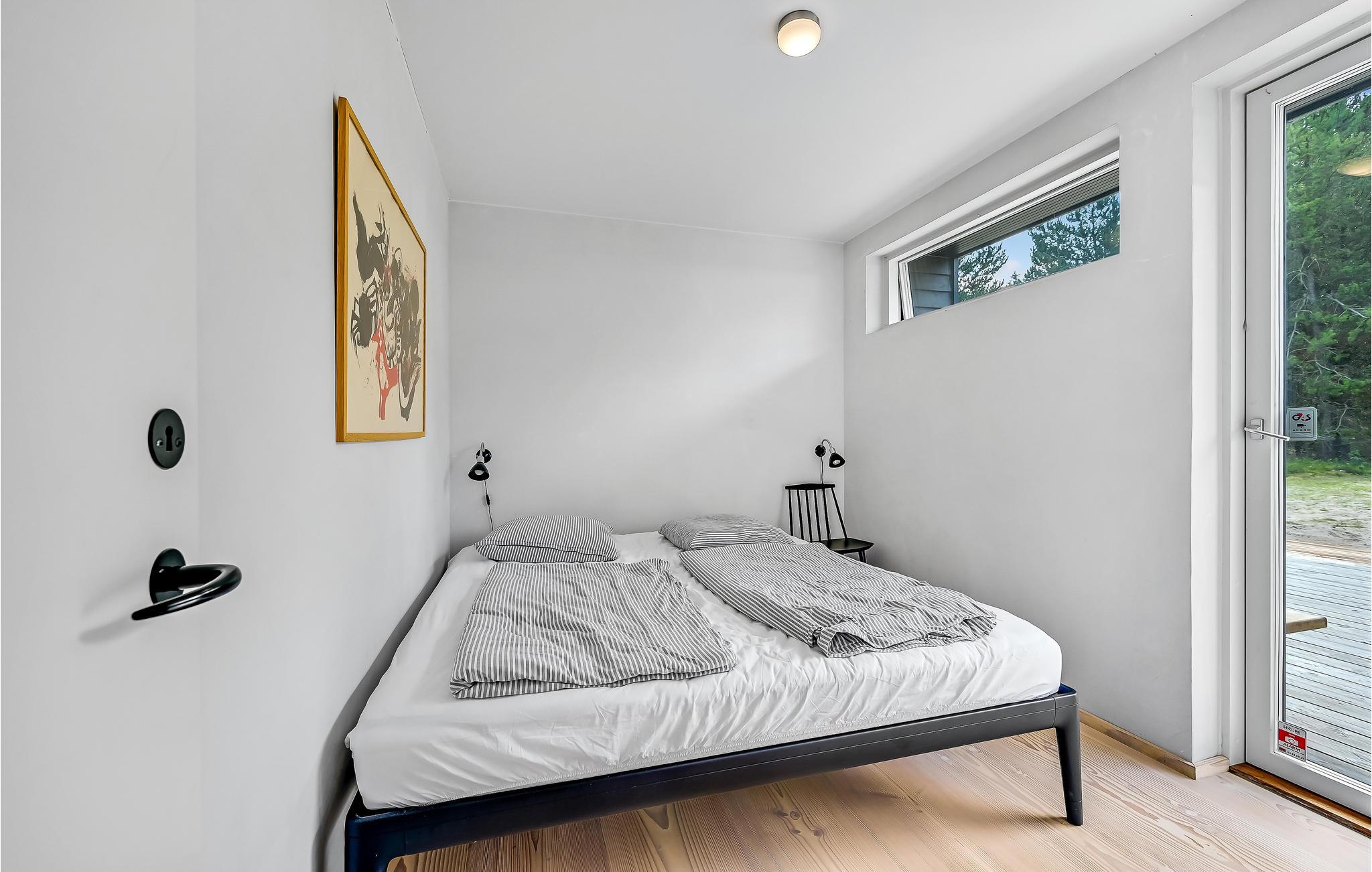 Hier haben Sie die Möglichkeit, Ihren Urlaub in einem einzigartigen Ferienhaus zu verbringen. Die geräumige, offene Wohnküche liegt in offener Verbindung zum Wohnraum. Die klaren Linien der Einrichtung werden wundervoll von der mit hellem Holz verkleideten gewölbten Decke ergänzt. Durchdachte Details und Spielereien mit Materialien, wie das in der Wand gestapelte Brennholz, sowie der Kontrast zwischen hellen Holzmöbeln und dunklen, minimalistischen Einrichtungsgegenständen prägen den Stil in den Innenräumen. Es gibt zwei Schlafzimmer und weitere Schlafgelegenheit auf dem Schlafboden, der über eine Leiter erreicht wird. Das Badezimmer hat eine Dusche.