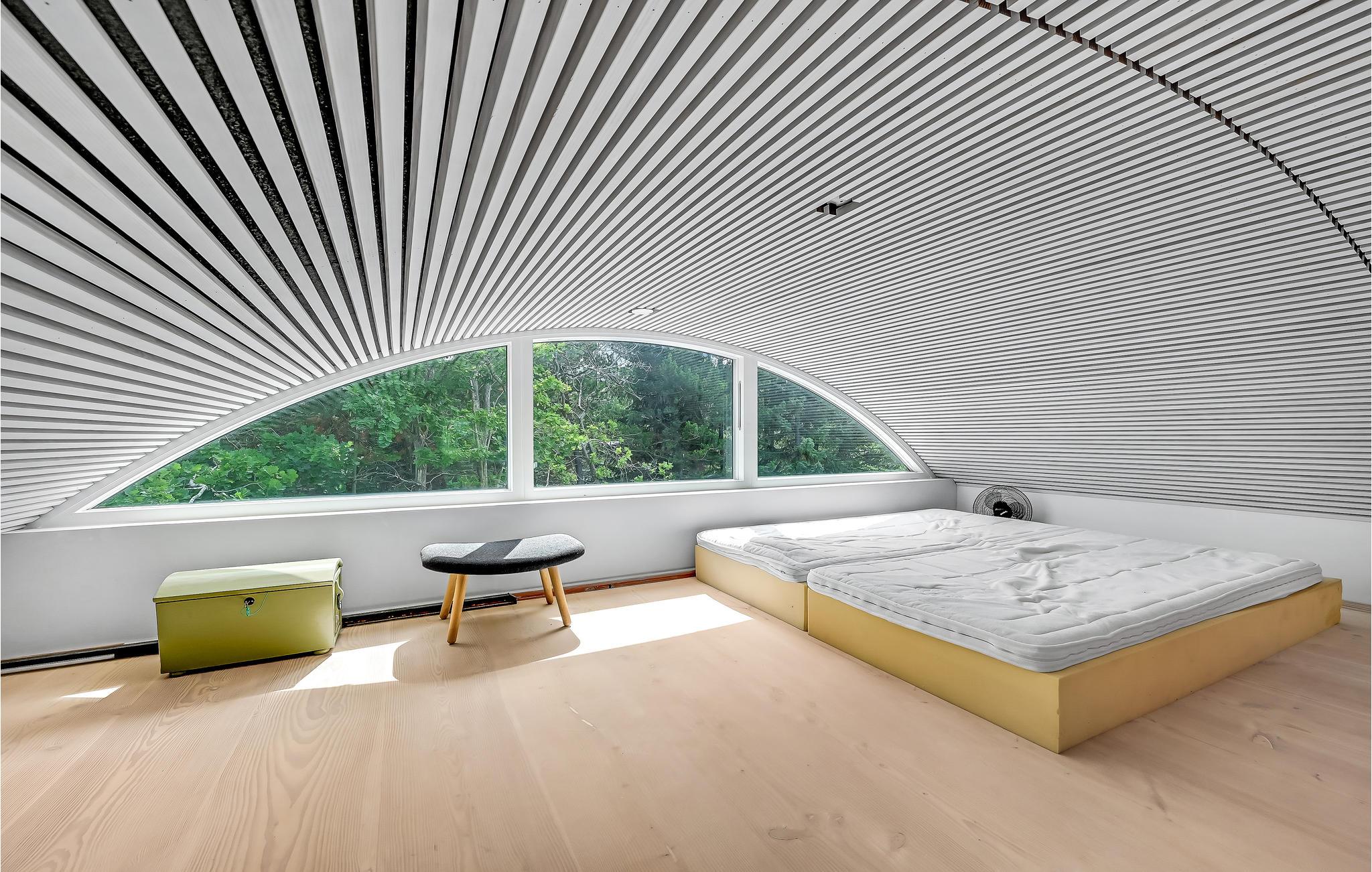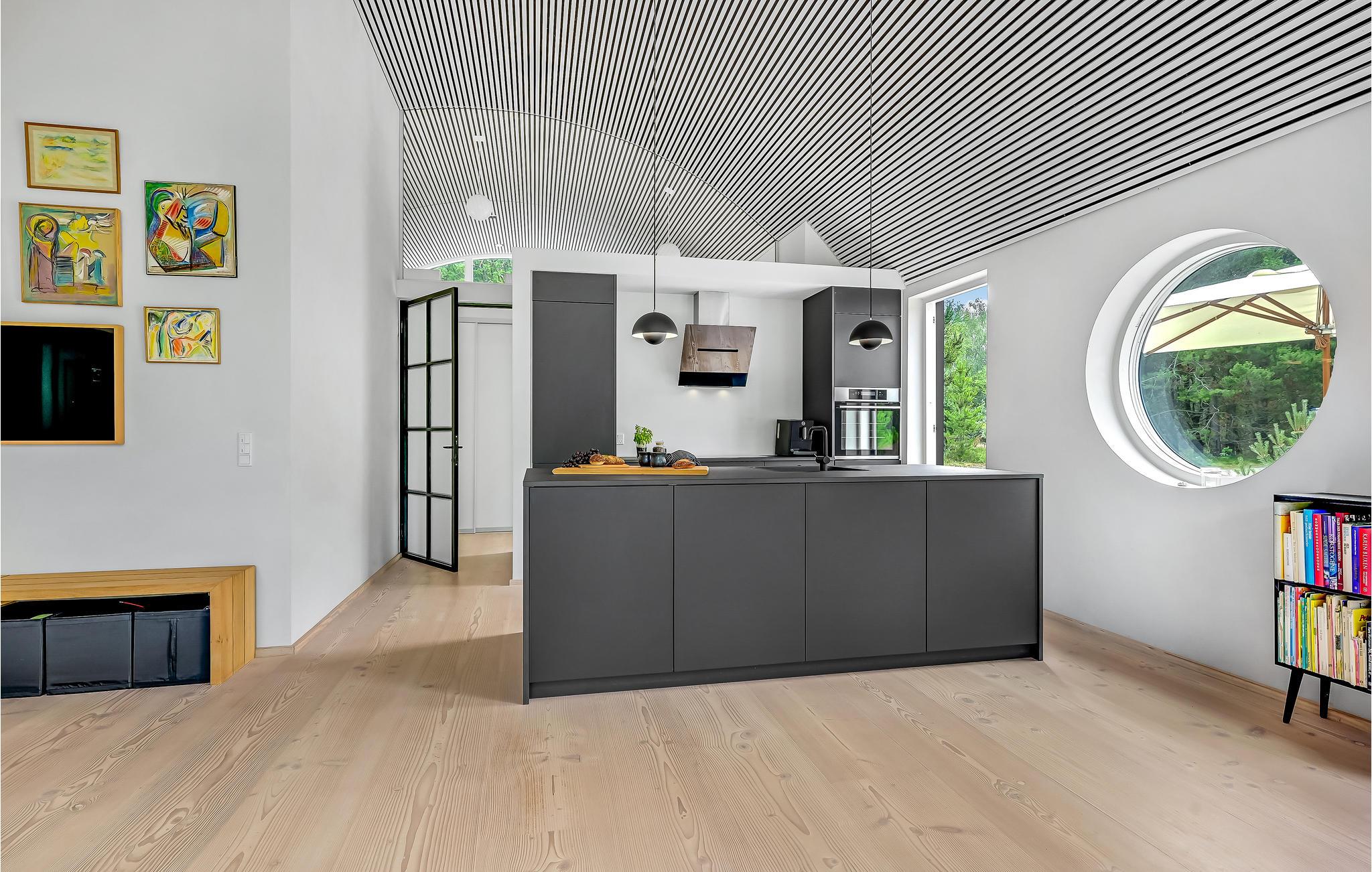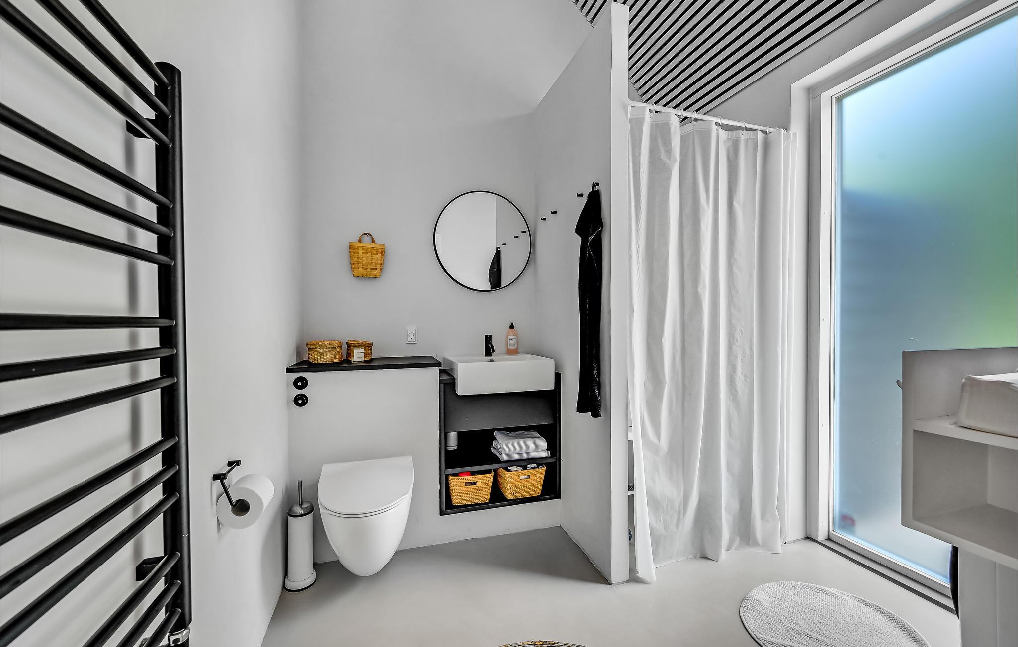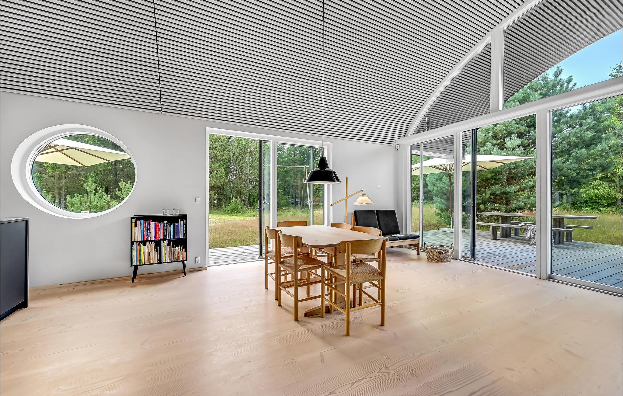 Hier haben Sie die Möglichkeit, Ihren Urlaub in einem einzigartigen Ferienhaus zu verbringen. Die geräumige, offene Wohnküche liegt in offener Verbindung zum Wohnraum. Die klaren Linien der Einrichtung werden wundervoll von der mit hellem Holz verkleideten gewölbten Decke ergänzt. Durchdachte Details und Spielereien mit Materialien, wie das in der Wand gestapelte Brennholz, sowie der Kontrast zwischen hellen Holzmöbeln und dunklen, minimalistischen Einrichtungsgegenständen prägen den Stil in den Innenräumen. Es gibt zwei Schlafzimmer und weitere Schlafgelegenheit auf dem Schlafboden, der über eine Leiter erreicht wird. Das Badezimmer hat eine Dusche.