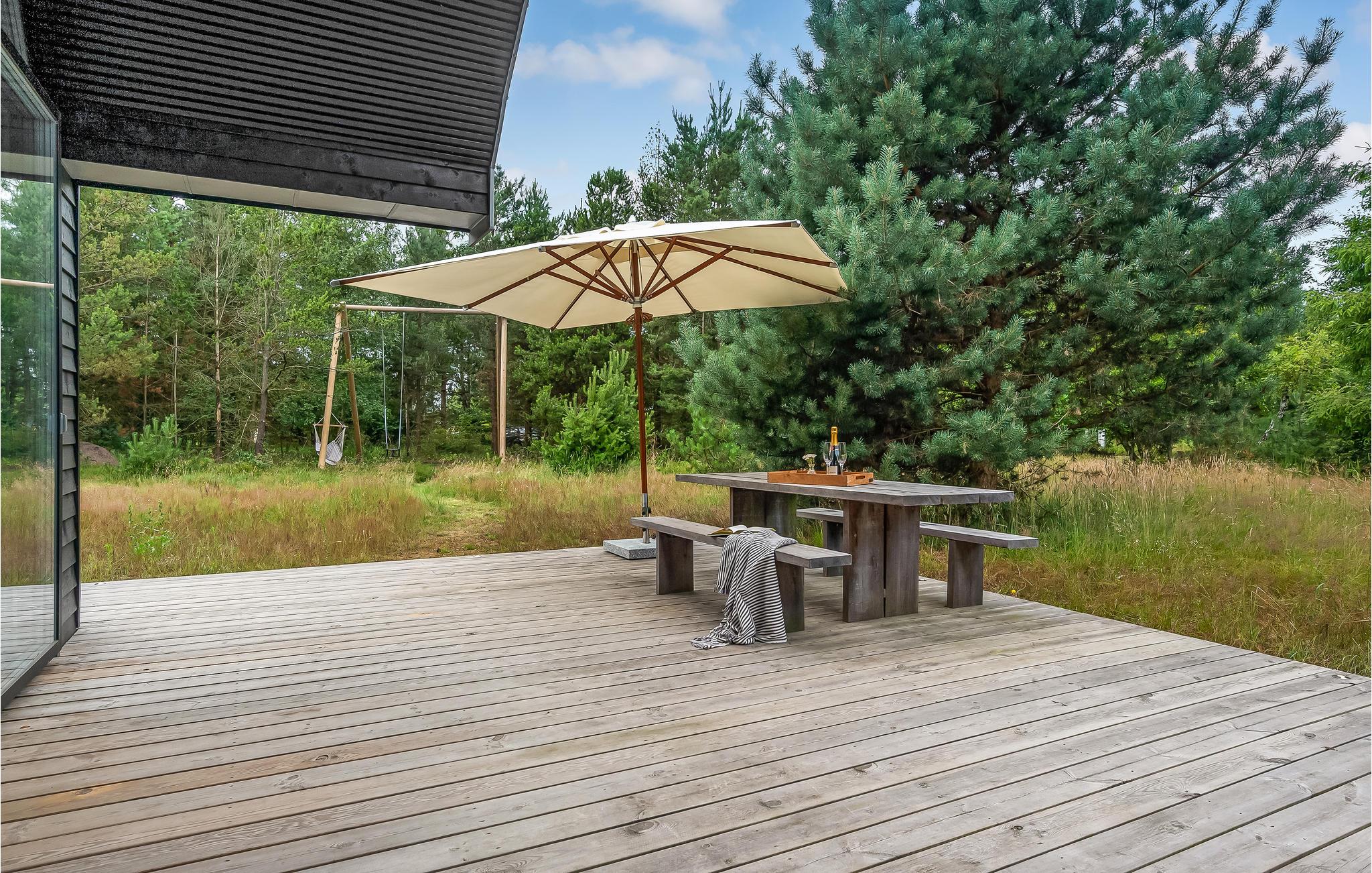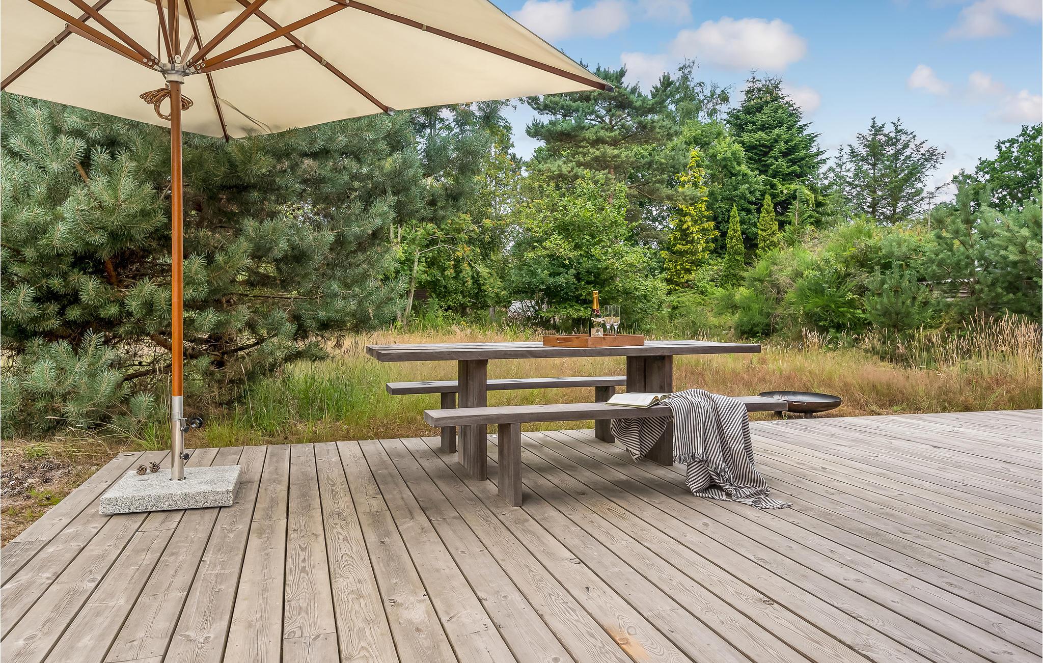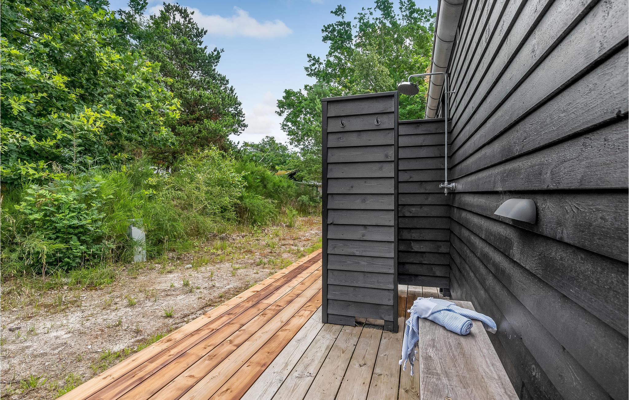 Am Haus sind im Außenbereich mehrere Terrassenareale aus Holz, die je nach Wunsch Schatten oder Sonne bieten. Außerdem schenkt eine installierte Außendusche erfrischende Abkühlung an heißen Tagen.