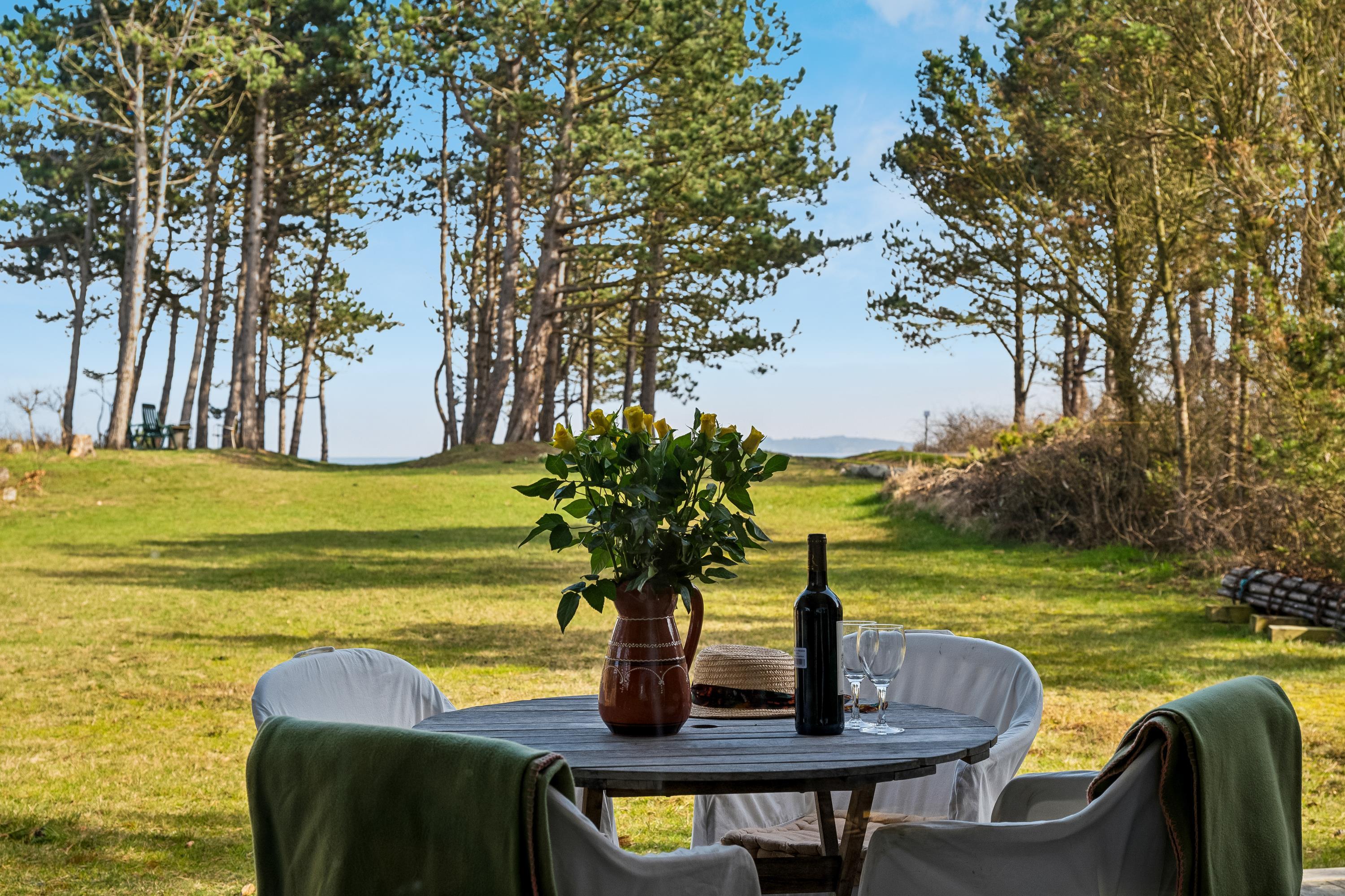 Gemütliches Ferienhaus mit Holzofen, überdachter Terrasse und Blick auf die Insel Hjelm am Elsegårde Strand.