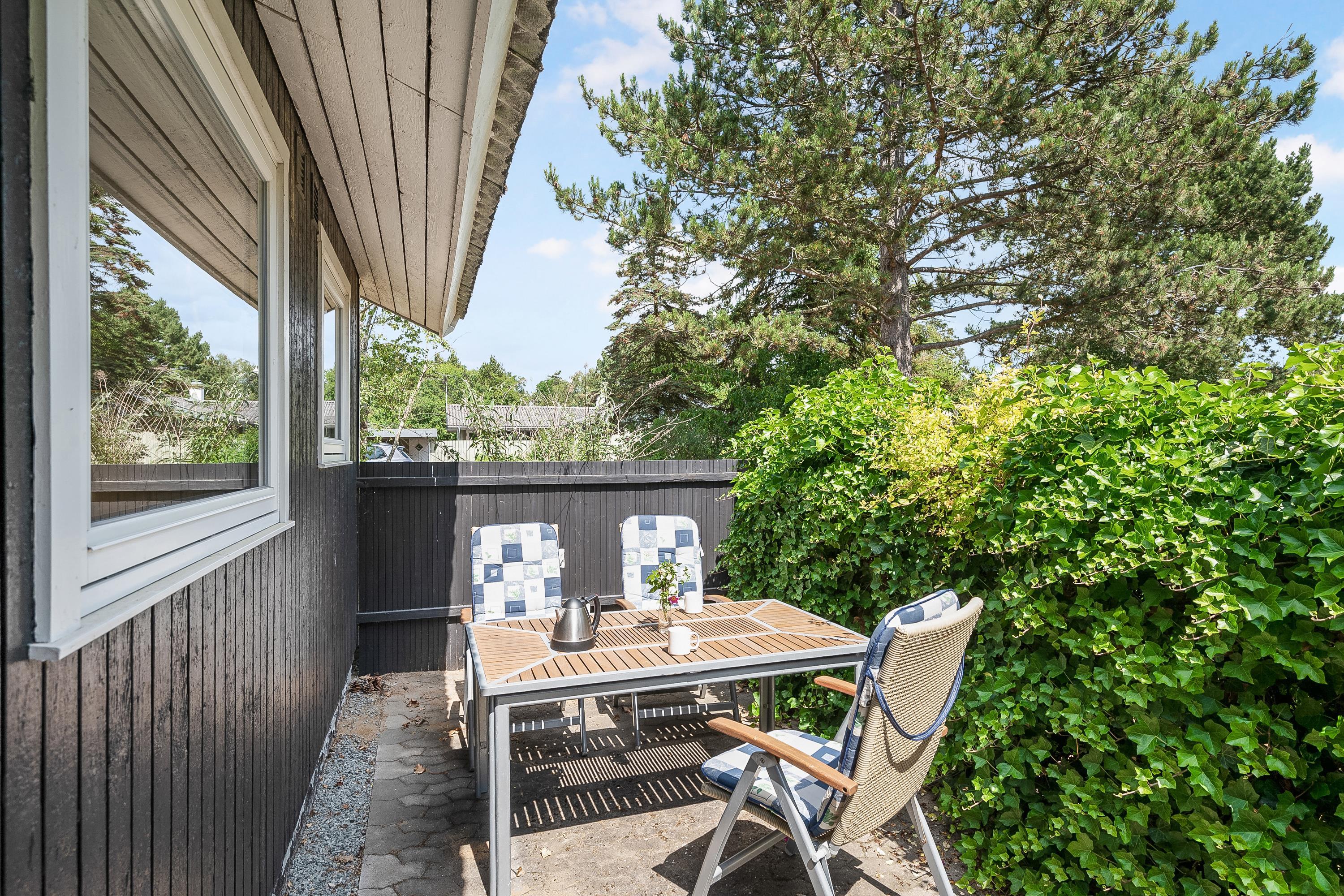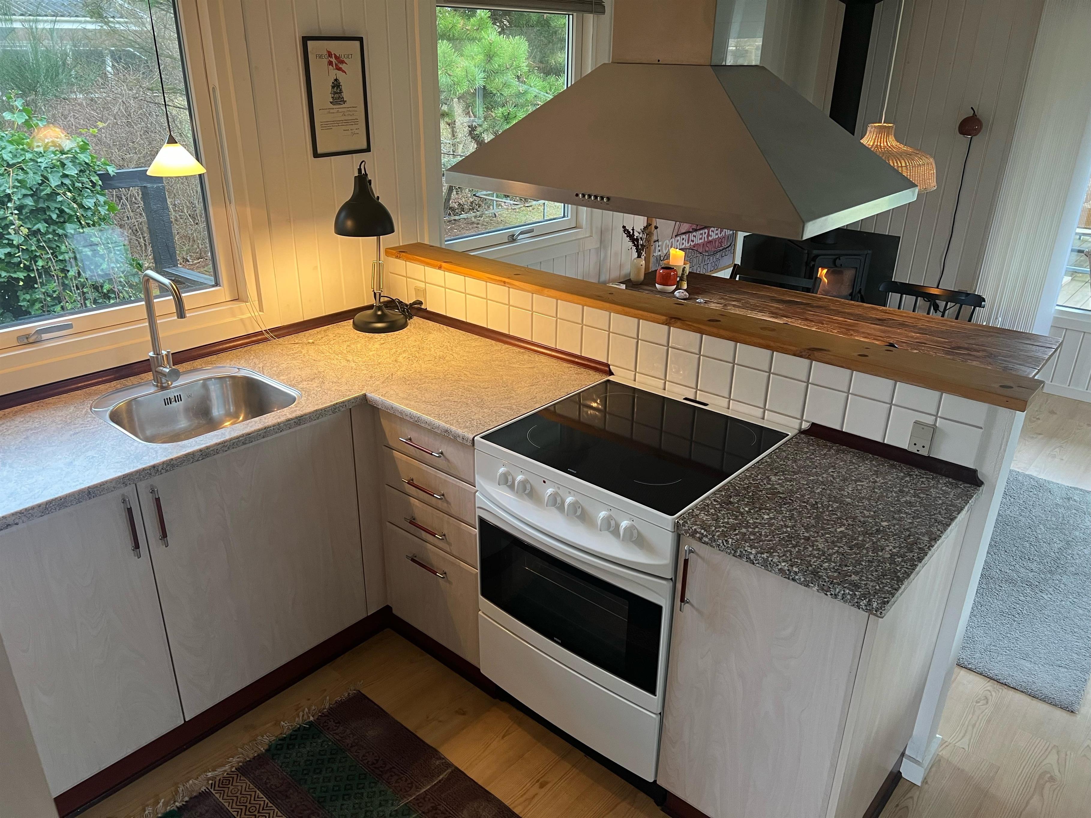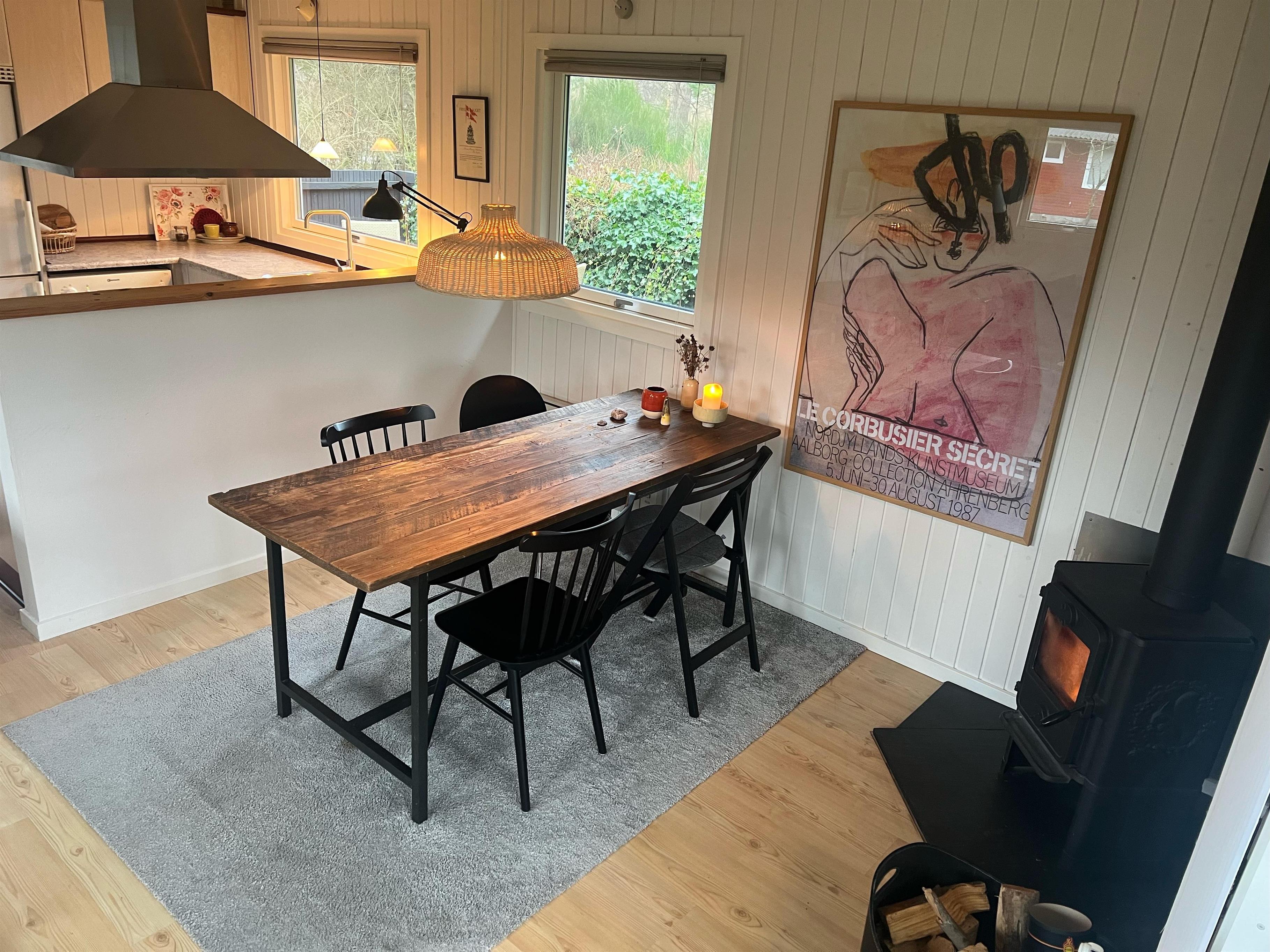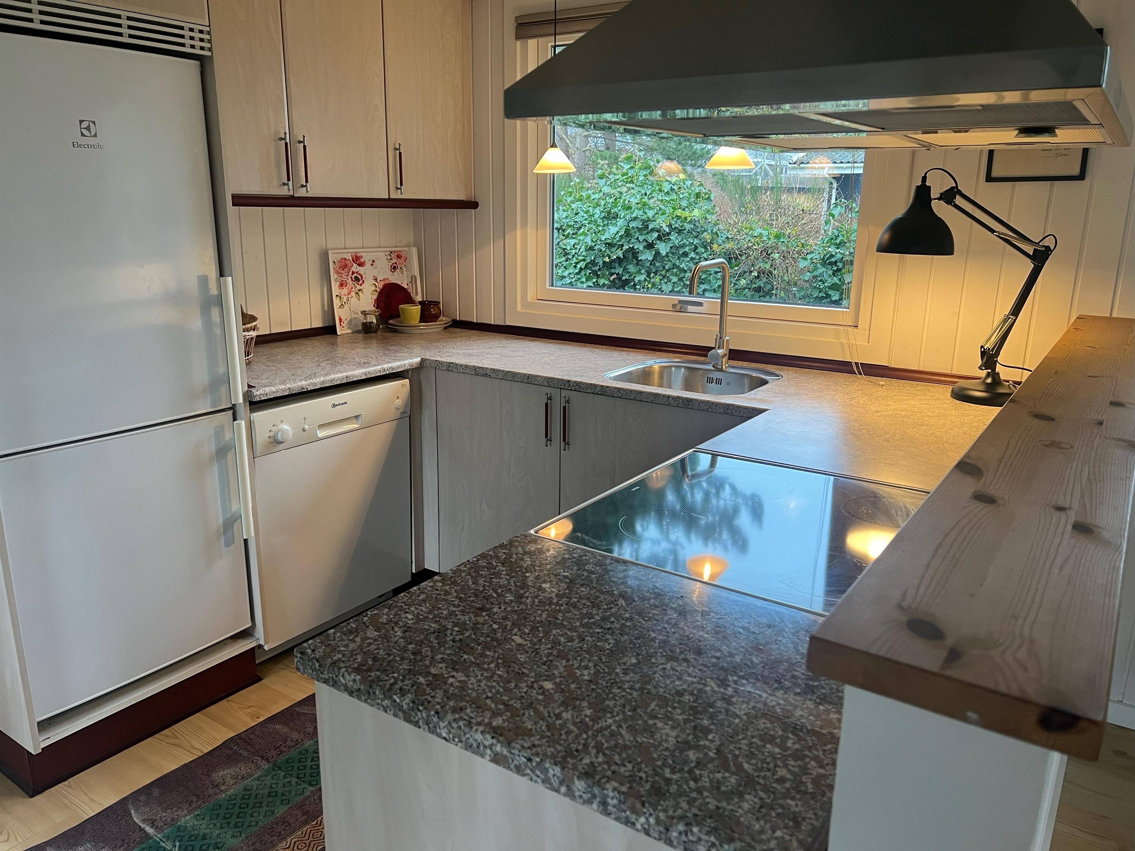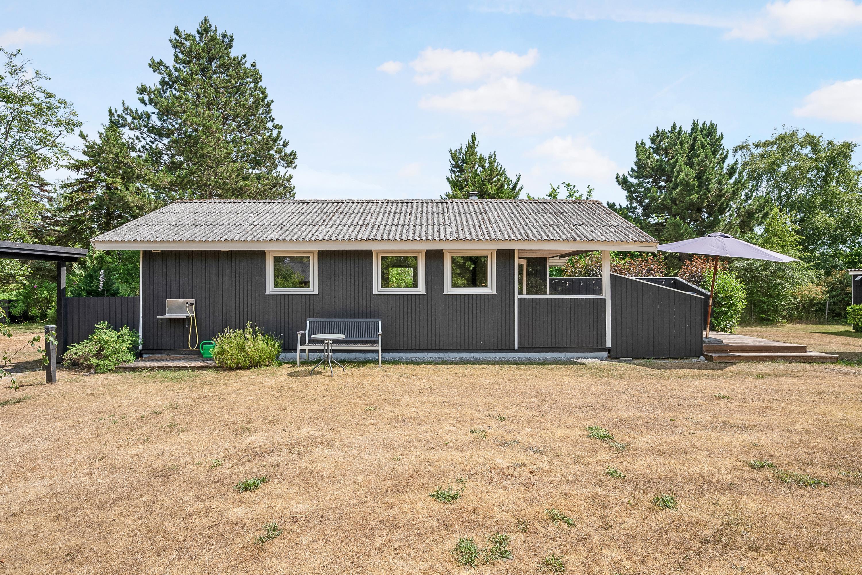 Sobald Sie die Tür betreten, spüren Sie die gemütliche Ferienhausatmosphäre, die Sie im Haus finden. Hier finden Sie ein gemütliches und gut eingerichtetes Wohnzimmer mit Holzofen und Zugang zu einer wirklich schönen Terrasse mit Gartenmöbeln. In Verbindung mit dem Wohnzimmer finden Sie die gemütliche Küchenabteilung mit unter anderem Geschirrspüler. Zwei kleinere Schlafzimmer, eines davon mit zwei Einzelbetten und das andere mit einem Etagenbett. Alle Betten sind 90 cm breit. Schönes Badezimmer mit Dusche und Fußbodenheizung. Es gibt WLAN im Haus und TV läuft über Chromecast. Das Mitbringen eines Hundes ist gestattet. Das Haus liegt auf einem schönen Grundstück, das sich zum Spielen, Ballspielen und für Freizeitaktivitäten im Freien eignet. Es gibt schöne Terrassenbereiche mit Gartenmöbeln, Liegestühlen, Sonnenschirmen und Grills und zum Strand sind es nur 5 Gehminuten.