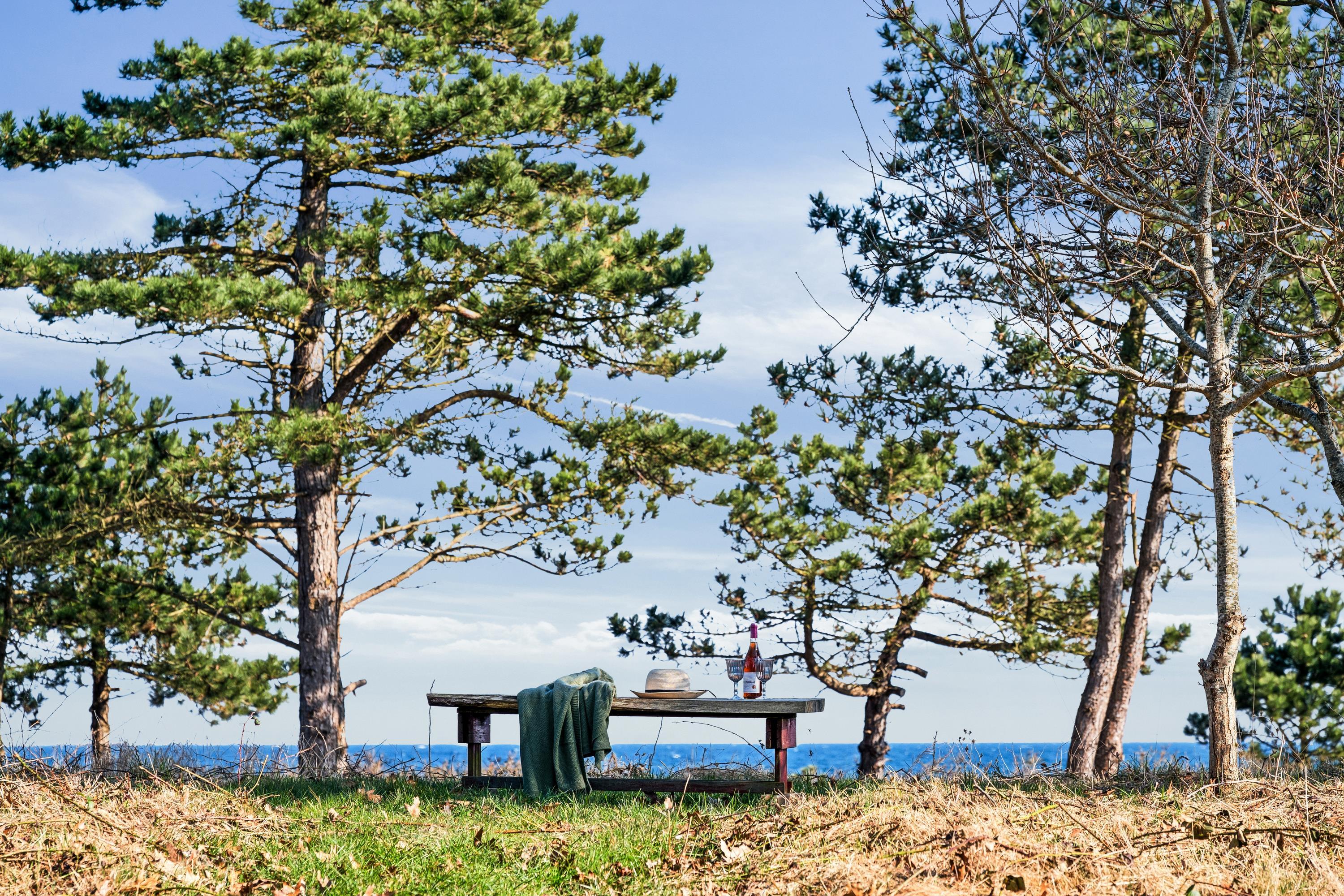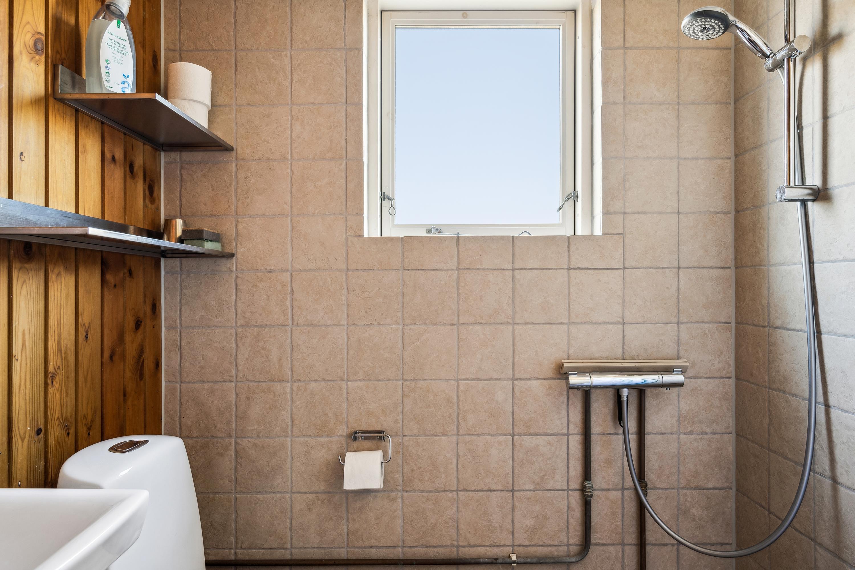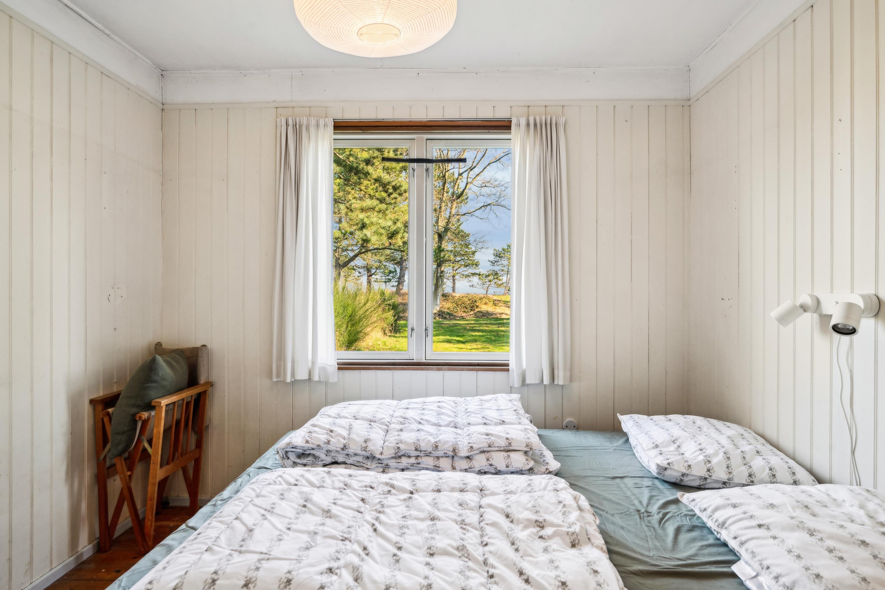 Kleines, älteres und gepflegtes Ferienhaus auf einem großen Naturgrundstück mit fantastischem Blick über das Kattegat und nach Hjelm. Westseitige und teilweise überdachte geflieste Terrasse mit Gartenmöbeln, Sonnenliegen, Sonnenschirm und Außengrill. Es gibt eine Fischreinigungsstelle im Freien, und auf dem Grundstück gibt es auch einen abschließbaren Schuppen.