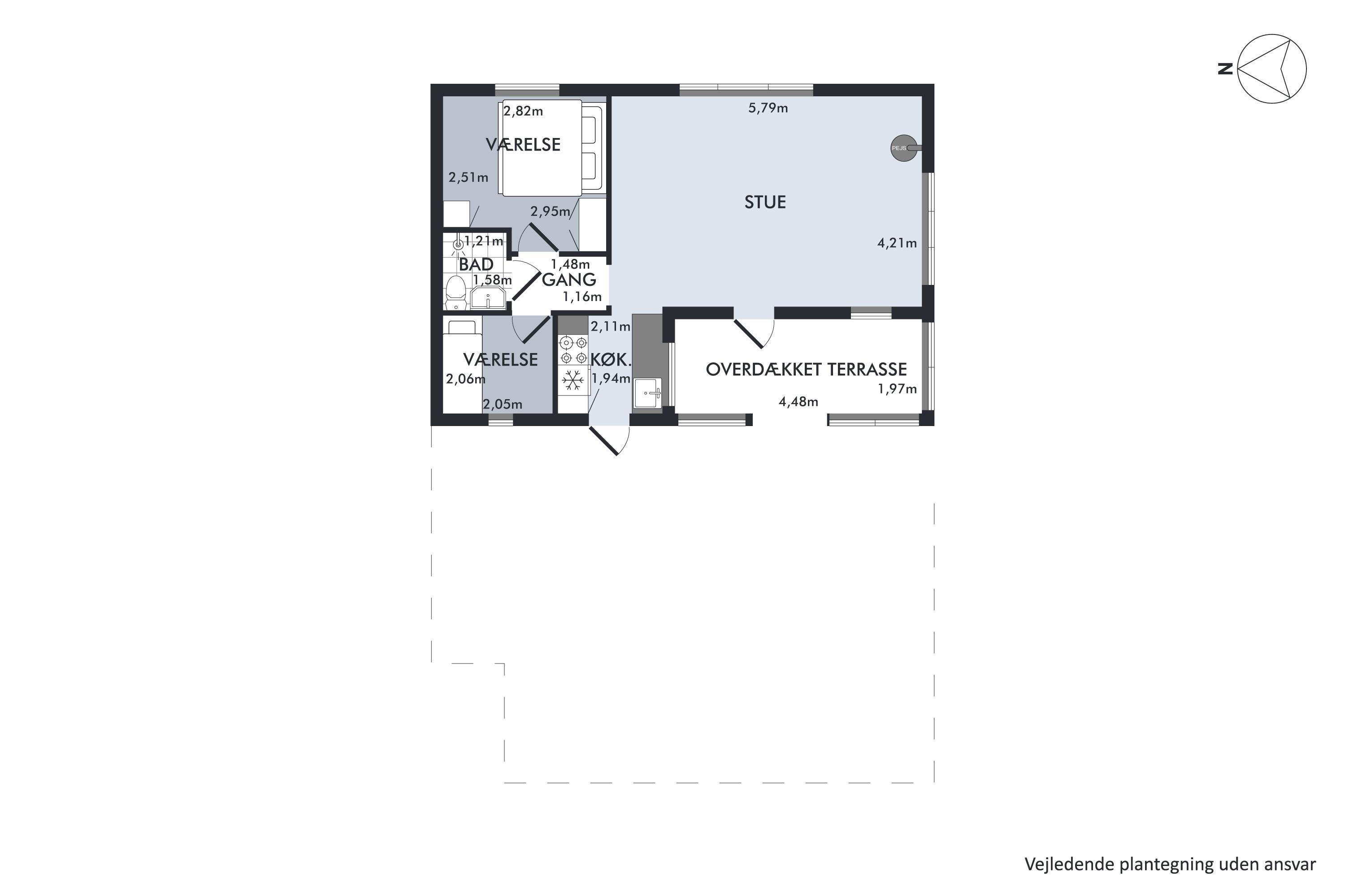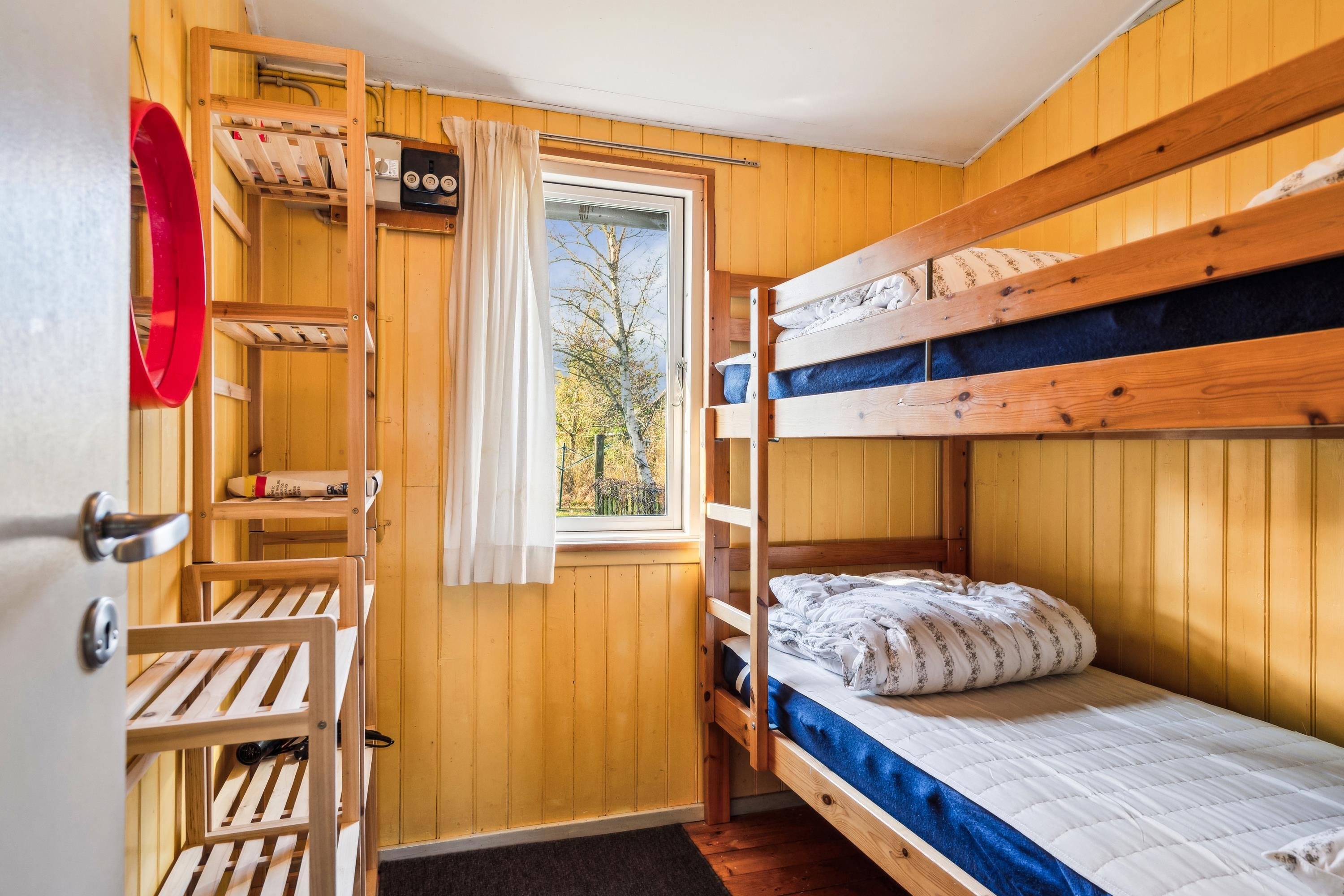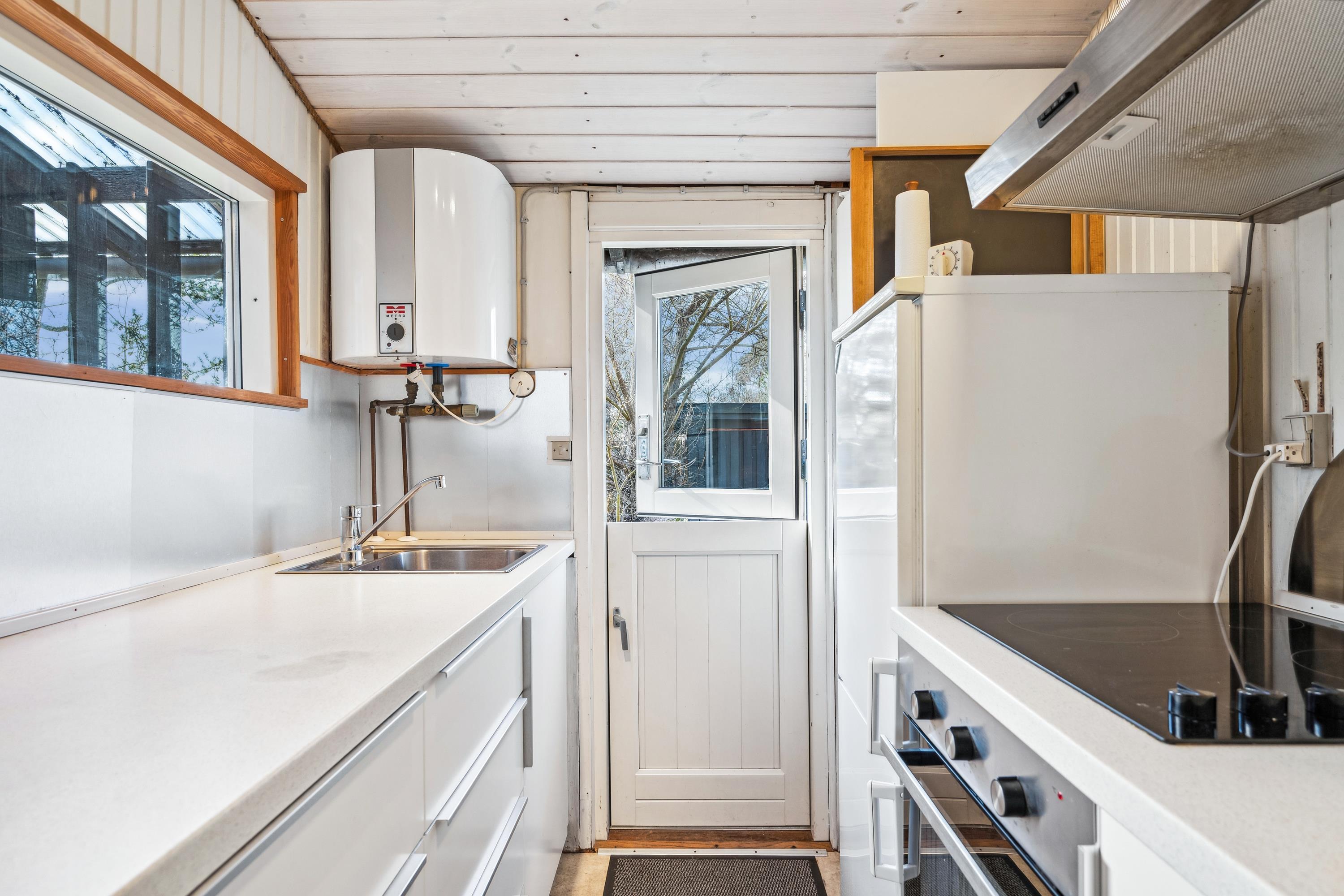 Gemütliches Wohnzimmer mit Kaminofen, Essplatz für 4 Personen, Fernseher mit Parabolantenne und dänischen (nur kostenlosen) und deutschen Sendern, Stereoanlage mit CD und Radio. Küche mit Herd mit Ceranfeldern, Backofen und Kühlschrank mit kleinem Gefrierfach. Kleines Badezimmer mit Dusche. Das Haus bietet Platz für 4 Personen in 2 Zimmern, 1 mit 2 Einzelbetten und 1 mit Etagenbett.