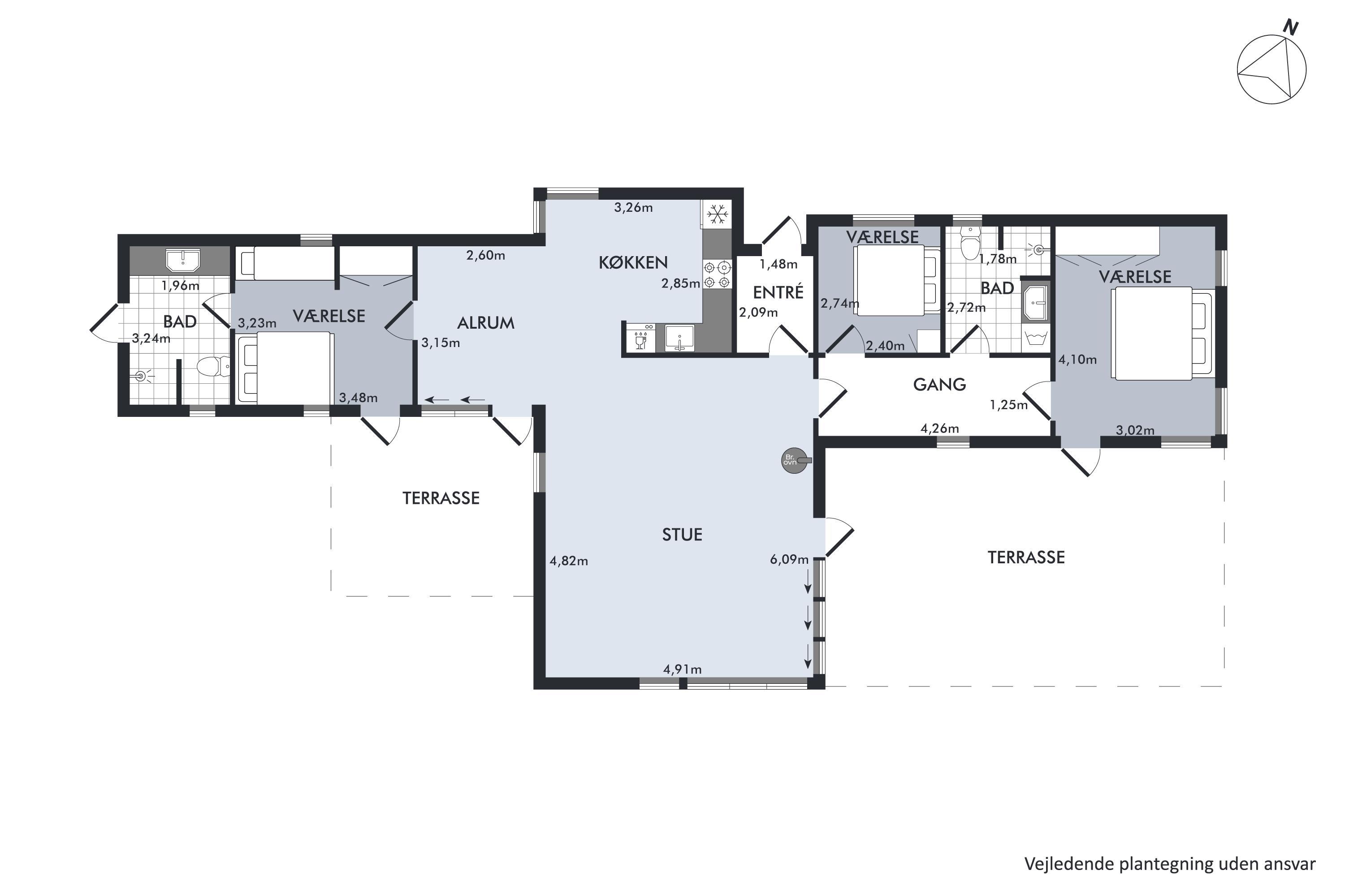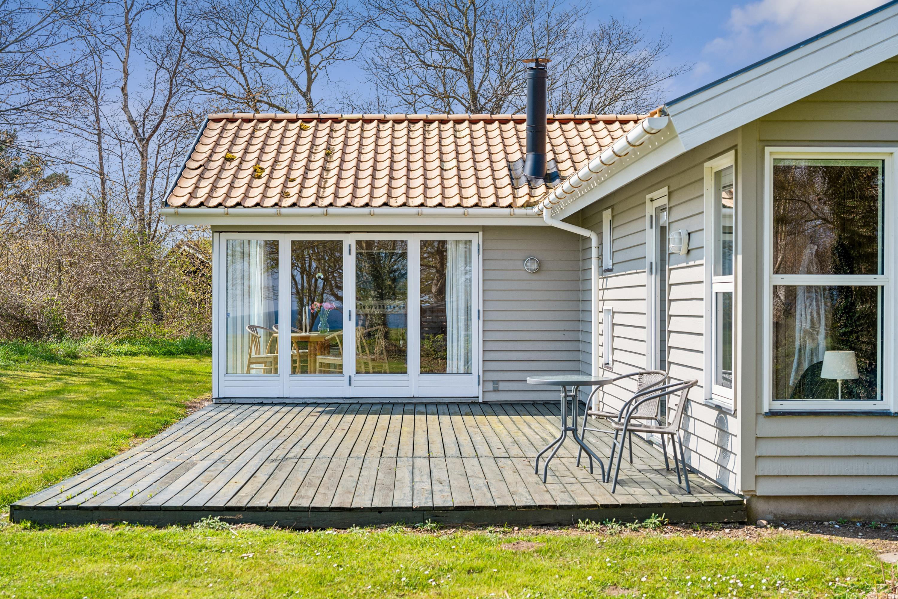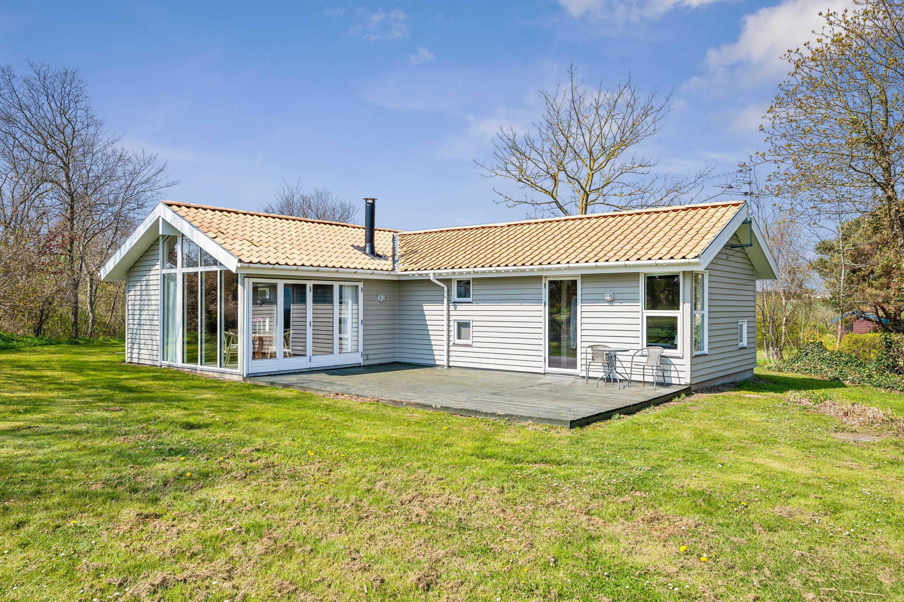 Das ganze Haus hat Dachschrägen und wirkt überall hell und freundlich. Großes, schönes Wohnzimmer mit Panoramafenster und Zugang zur Terrasse, Holzofen und Sofaecke mit TV mit dänischen (inkl. TV2) und deutschen Kanälen. Zwei separate Essbereiche in offener Verbindung mit guter, geräumiger Küche mit Herd mit Ceranfeldern und Backofen, Kühl-/Gefrierschrank und Geschirrspüler. Zwei schöne Badezimmer mit Dusche, das größte zusätzlich mit Schrankeinrichtung und Waschmaschine. Das Haus bietet Platz für 8 Personen in 3 guten Schlafzimmern: 1 mit großem Doppelbett (180 cm), 1 mit Doppelbett (120 cm) und 1 mit Doppelbett (120 cm) und einem guten Etagenbett. Vom Hauptschlafzimmer gibt es auch Zugang zur Terrasse. Ein schönes Ferienhaus, nur 150 Meter vom kinderfreundlichen Strand entfernt und in der Nähe vieler Aktivitätsmöglichkeiten.
