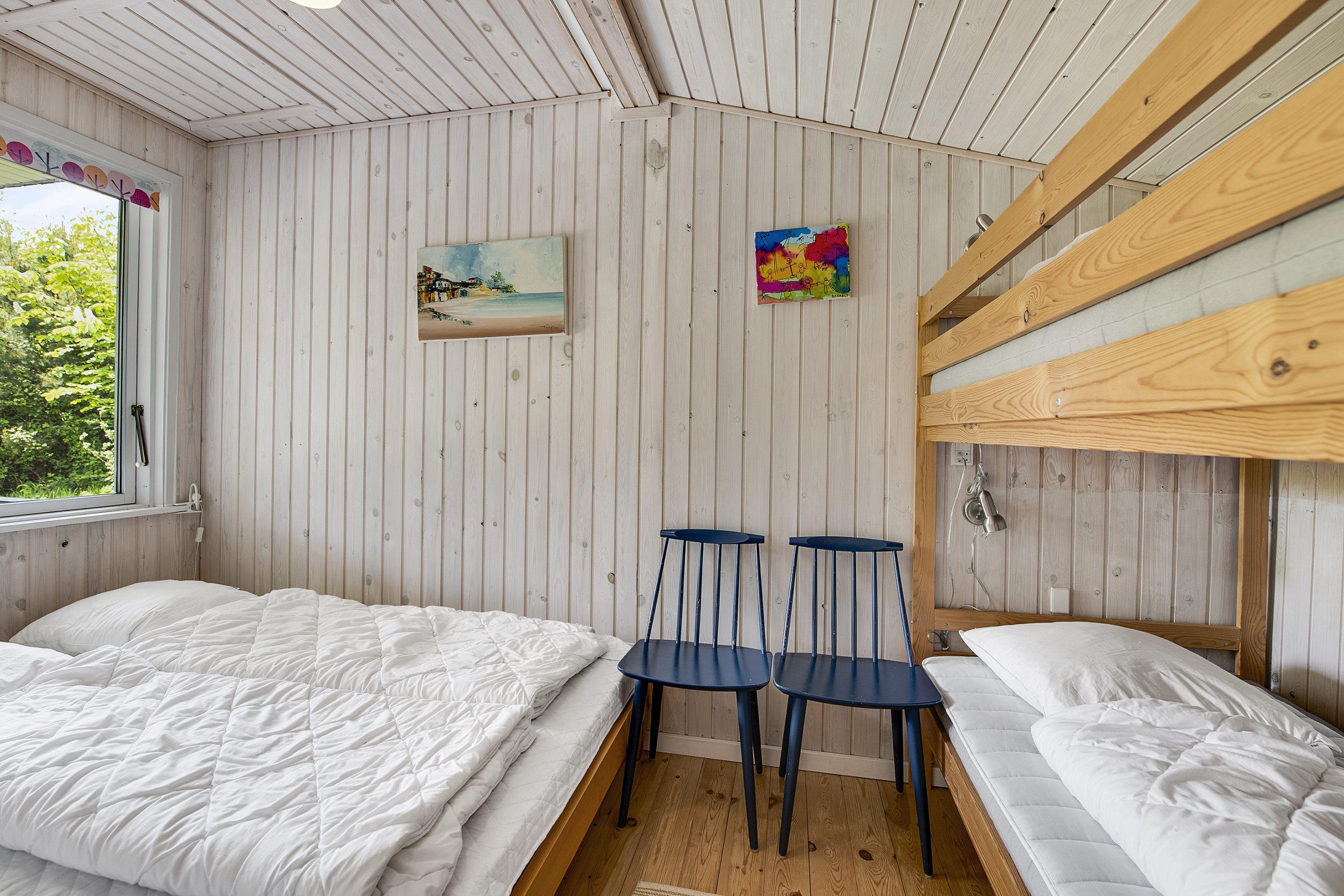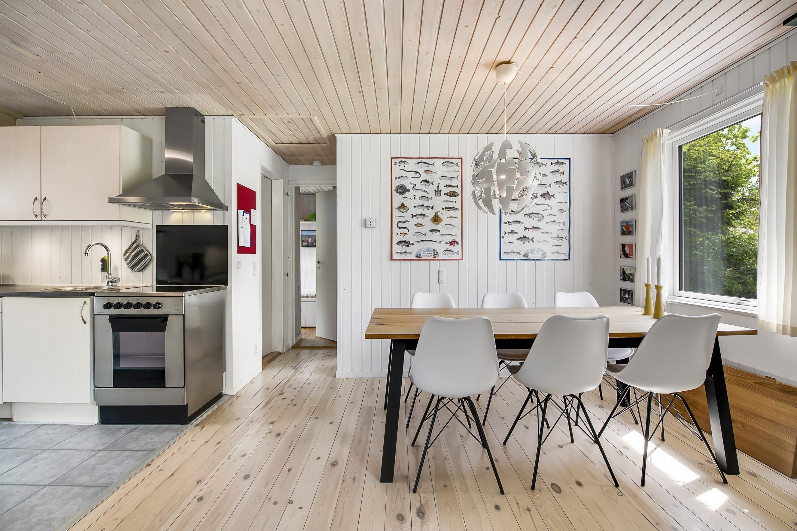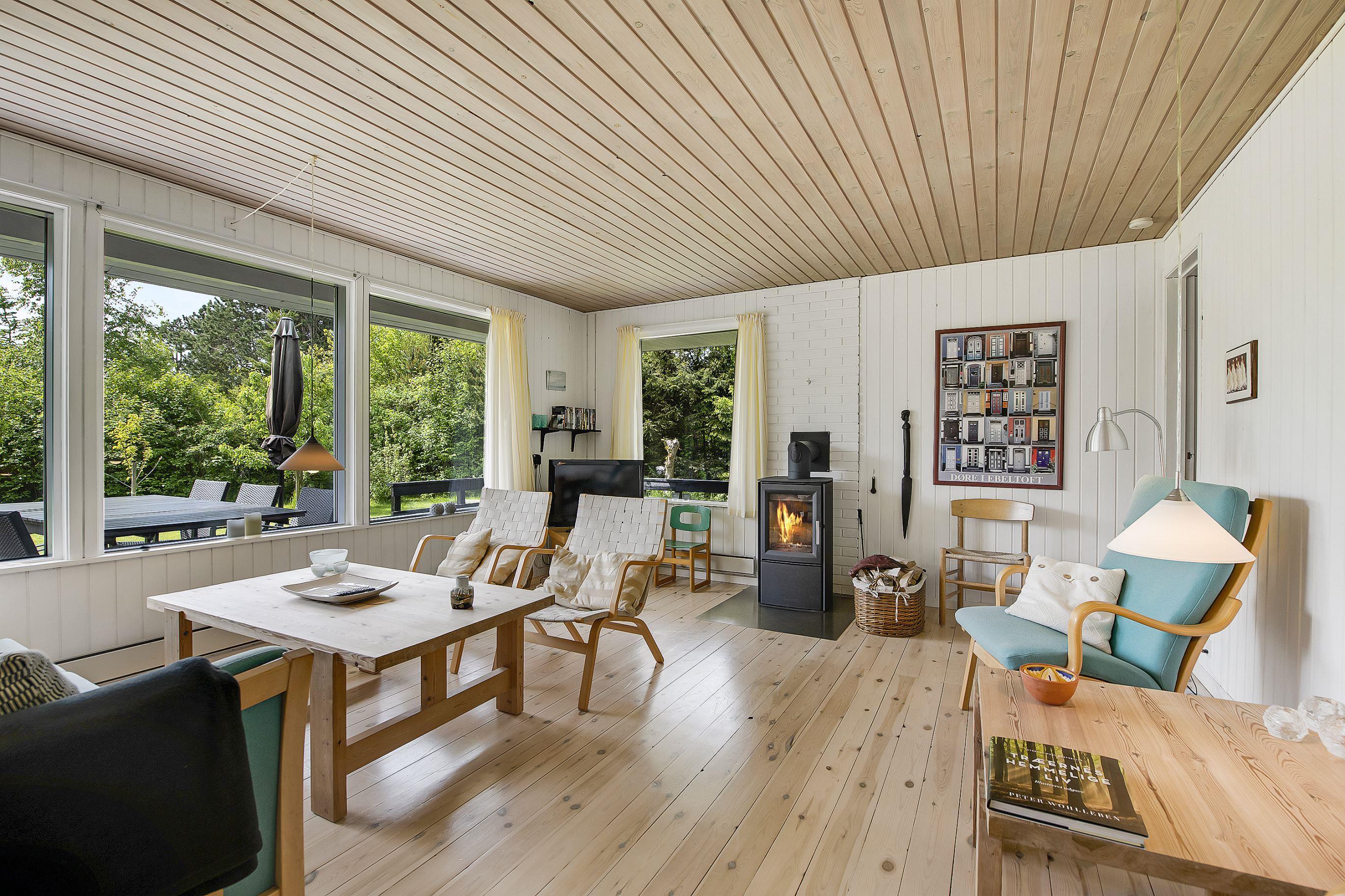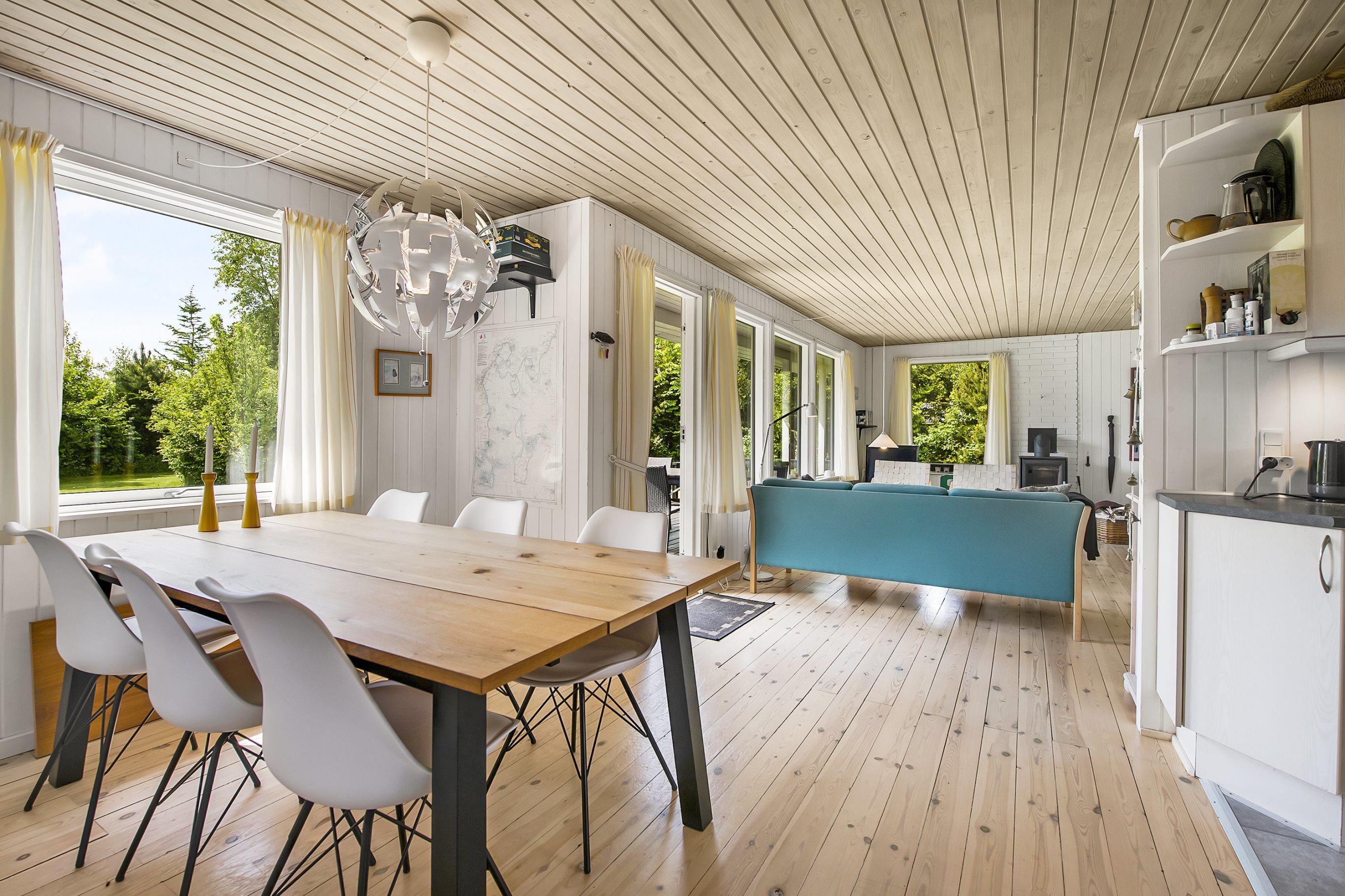 Helles und gut eingerichtetes Wohnzimmer mit Holzofen, Wärmepumpe mit Klimaanlage und Fernseher mit dänischen und deutschen (ZDF) Sendern. Schöner Essbereich mit Zugang zur schönen, funktionell und gut ausgestatteten Küche mit Cerankochfeld mit Backofen, Kühlschrank mit kleinem separatem Gefrierfach, Geschirrspüler und Mikrowelle. Extra Gefrierschrank im Werkzeugraum. Von der Küche aus gelangt man auf die hintere Terrasse. Das Haus schläft sechs Personen wie folgt: 1 Schlafzimmer mit Doppelbett und 1 Schlafzimmer mit Doppelbett und ein Etagenbett. Darüber hinaus gibt es ein kleineres Zimmer mit 1 Einzelbett. Freies WLAN.