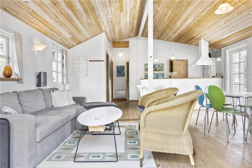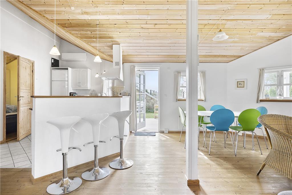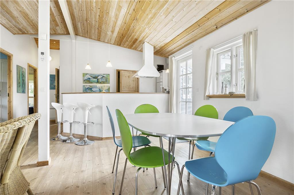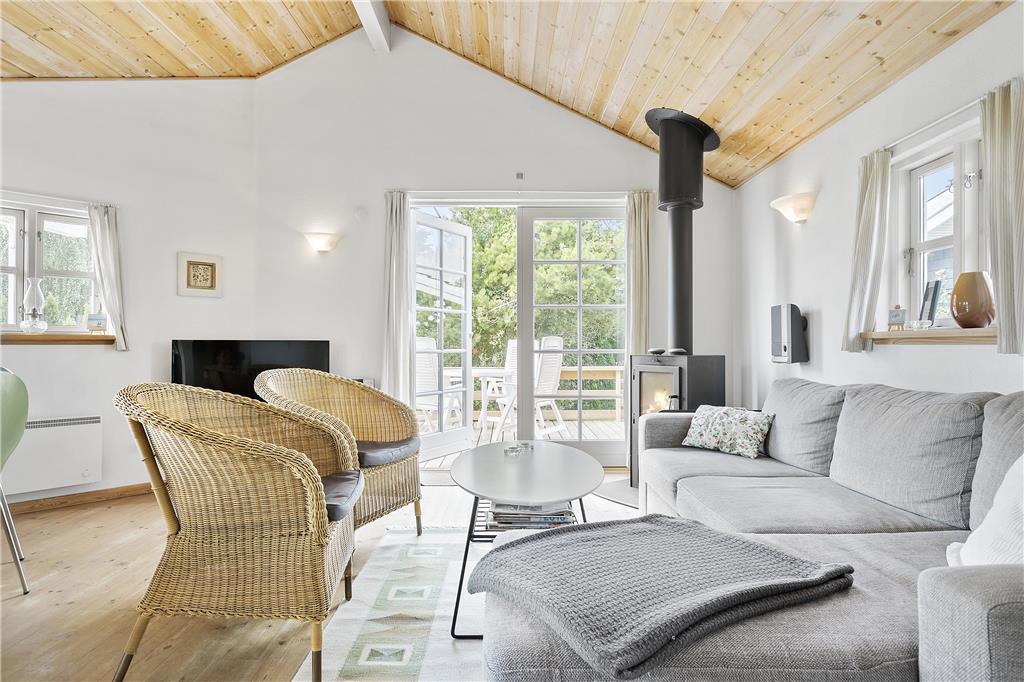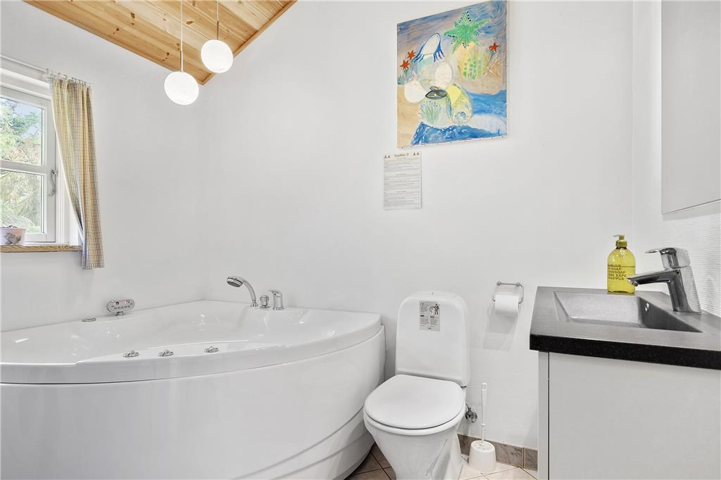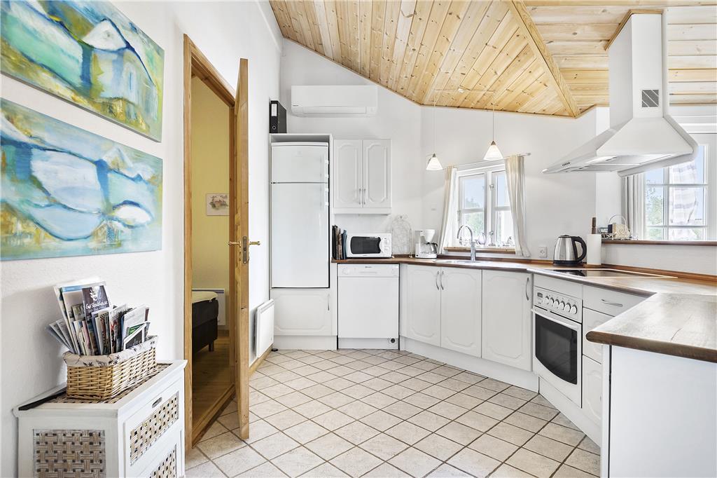 Dieses Urlaubsdomizil empfängt Sie mit einer gelungenen Kombination aus Wohnbereich und Küche. In der hellen Küche erleichtern Ihnen ein eingebauter Backofen, ein Cerankochfeld, eine Mikrowelle, ein Geschirrspüler und ein Kühlschrank mit einer kleinen Gefrierbox Ihre alltäglichen Aufgaben. Der Wohnraum bietet Ihnen mehrere Ausgänge auf die Terrasse und beinhaltet ein Chaiselongue-Sofa, einen guten Essplatz, einen Fernseher mit dänischen und deutschen Sendern, einen DVD-Player, ein Radio und einen CD-Player. Die Schlafplätze verteilen sich auf zwei Schlafräume mit jeweils einem Doppelbett und einen Schlafraum mit einem Etagenbett. Das Badezimmer verfügt über eine Duschnische, eine Fußbodenheizung und eine Waschmaschine. Der zusätzlich im Badezimmer befindliche Whirlpool lädt zu wunderbar entspannenden Stunden nach einem erlebnisreichen Urlaubstag ein. Das Haus wird mittels einer Wärmepumpe, mittels Elektroheizungen und des Kamins beheizt.