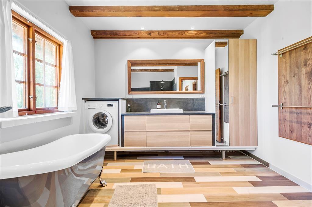 Einrichtung: Gedigen und geräumiges Ferienhaus in 2 Etagen, direkt an Fjord- und Meer gelegen. Eingangsbereich mit zugang zu Komb. Wohn-/Essraum, Offene Küche mit Kühlschtrank/Gefrierbox, E-Herd/Backofen, Spülmaschine. 1 Schlafzimmer mit 1 Doppelbett. Nagelneues Badezimmer mit Dusche, Badevanne, Wascbecken mit Schrank. WC. Waschmaschine. 1. Stock: Eine Treppe fürht zum 1. Stock mit ein gross und hellen Wohnraum mit herrlichen blick zum Fjord- und Meer. 1 grosses Schlafraum mit 1 Doppelbett. 2 Schlafmöglichkeiten im hinteren bereich des Wohnraums.