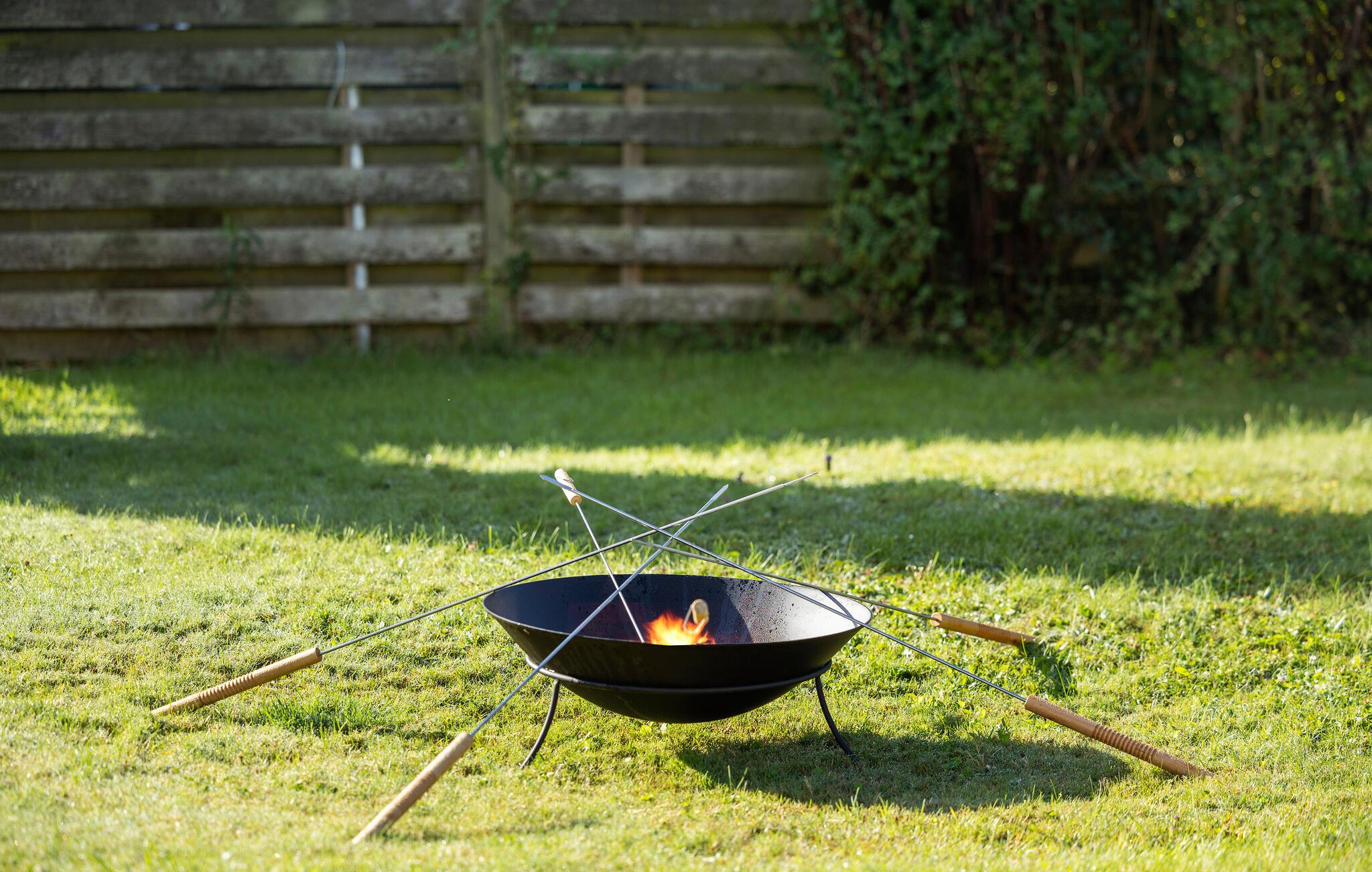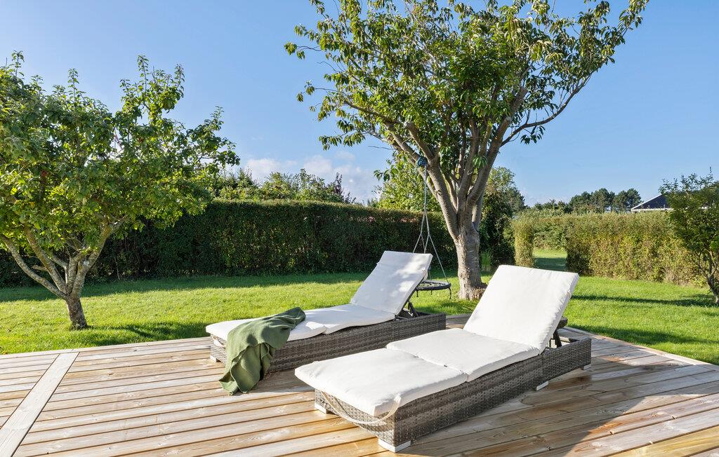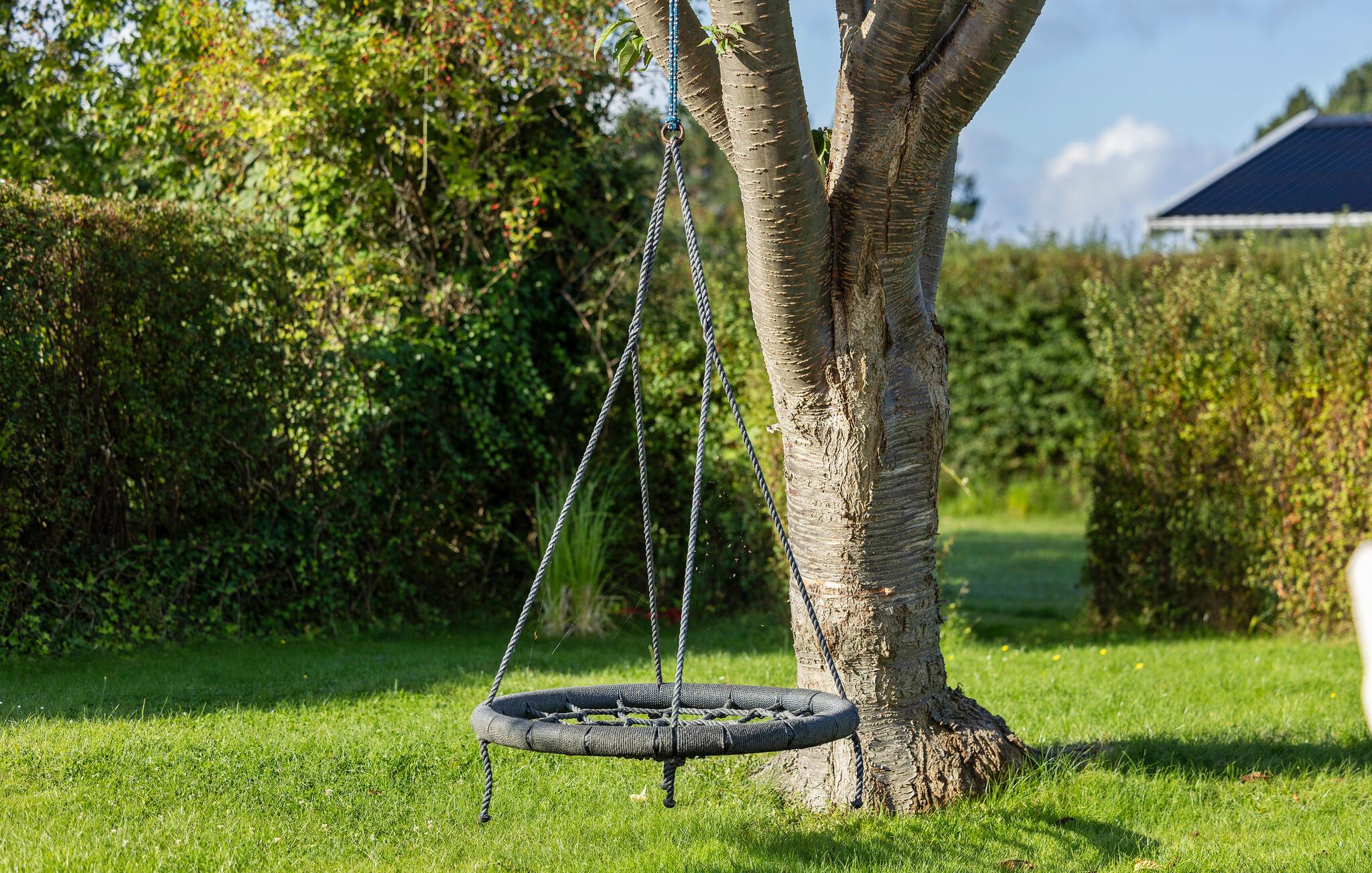Auf der großzügigen Holzterrasse kommen alle auf ihre Kosten, und der weitläufige Rasen bietet viel Platz zum Spielen und Herumtollen. Wenn der Tag sich dem Ende neigt, wird die Feuerstelle zum Treffpunkt für die ganze Familie – mit Stockbrot und gemütlichen Gesprächen unter dem Abendhimmel.
