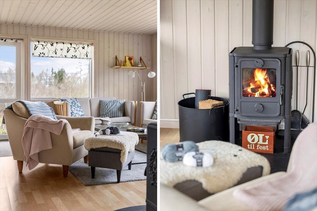 Tritt ein in dieses helle und einladende Ferienhaus, das eine gemütliche Atmosphäre mit schönen Details bietet. Im Wohnzimmer kannst du bei dem warmen Kaminofen zur Ruhe kommen, der die perfekte Kulisse für Entspannung an kalten Abenden schafft. Stell dir vor, du sitzt mit einem guten Buch, während die Flammen tanzen und die weiche Wärme den Raum erfüllt. Der offene Raumaufbau des Hauses sorgt für einen angenehmen Fluss zwischen Wohnzimmer und Küche, und hier kannst du problemlos Zeit mit deinen Lieben verbringen. Es ist ein Haus, das zu Nähe und Gemeinsamkeit einlädt.
