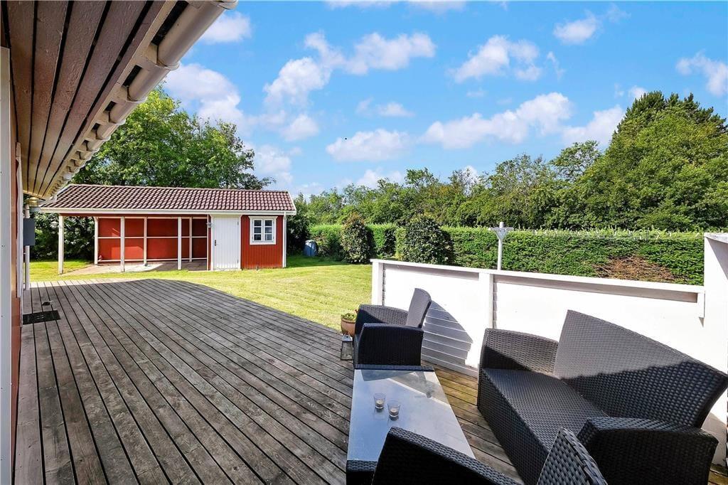 Mit 1300 m² ist das Grundstück recht groß, so dass Sie, wenn Sie Kinder oder einen Hund im Urlaub dabei haben, viel Platz zum Spielen und Toben auf dem Rasen haben. Das Auto kann im Carport stehen, und wenn Sie eine ruhige Pause brauchen, können Sie sich auf die Holzterrasse setzen, die sich südlich und westlich des Hauses erstreckt. Die Terrasse ist mit bequemen Gartenmöbeln ausgestattet, die tagsüber zum Sonnen und abends zum Grillen einladen.