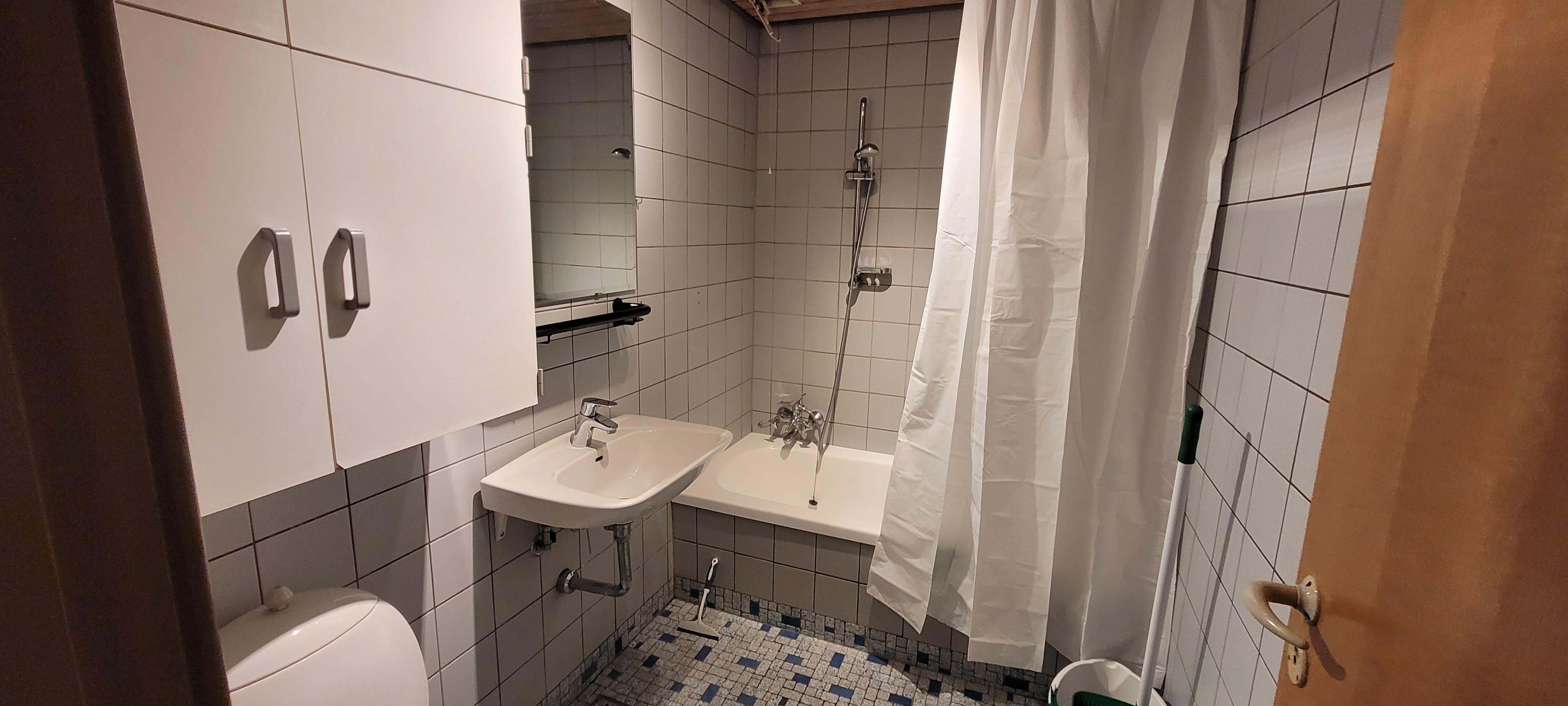 Das Badezimmer hat eine Duschkabine, Handwaschbecken und Toilette.