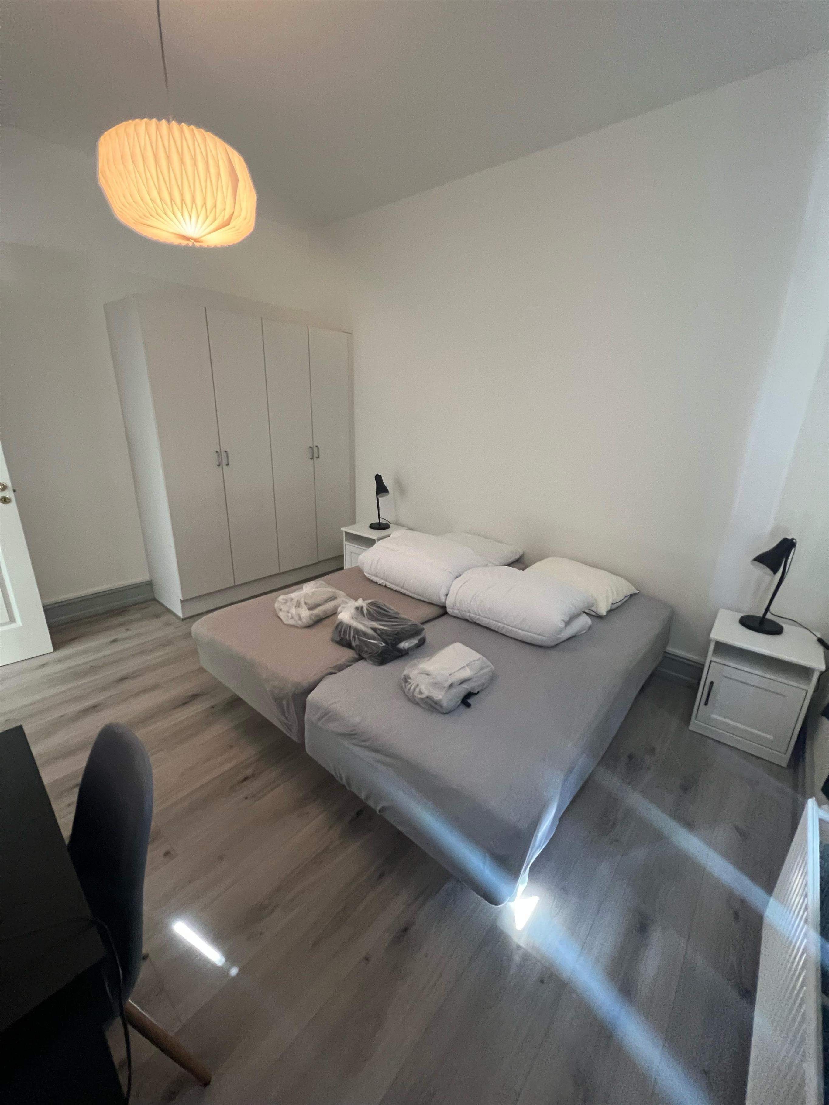 Schlafzimmer mit Doppelbett und Kleiderschrank.