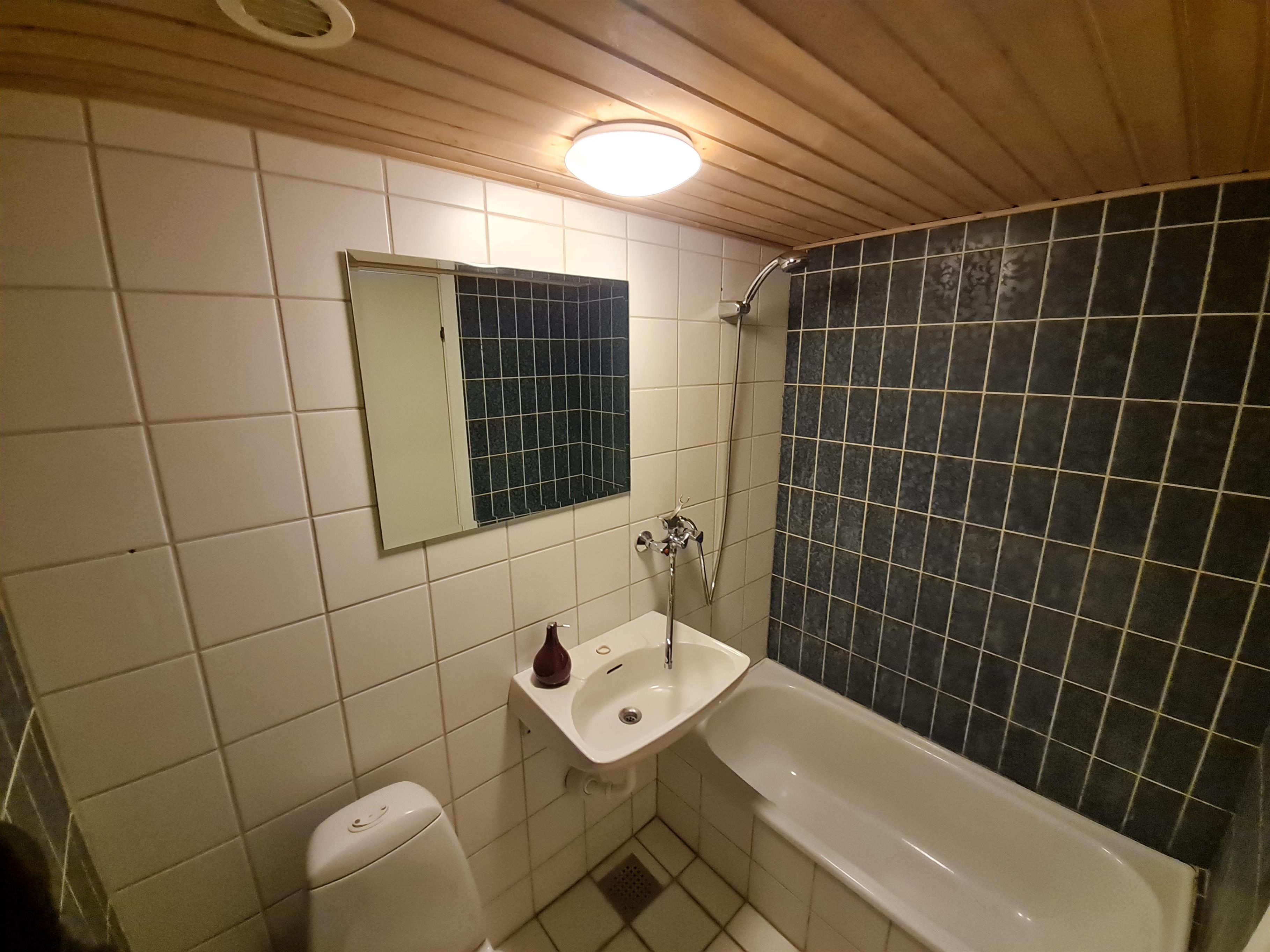 Badeværelse med bruseniche, håndvask og toilet.