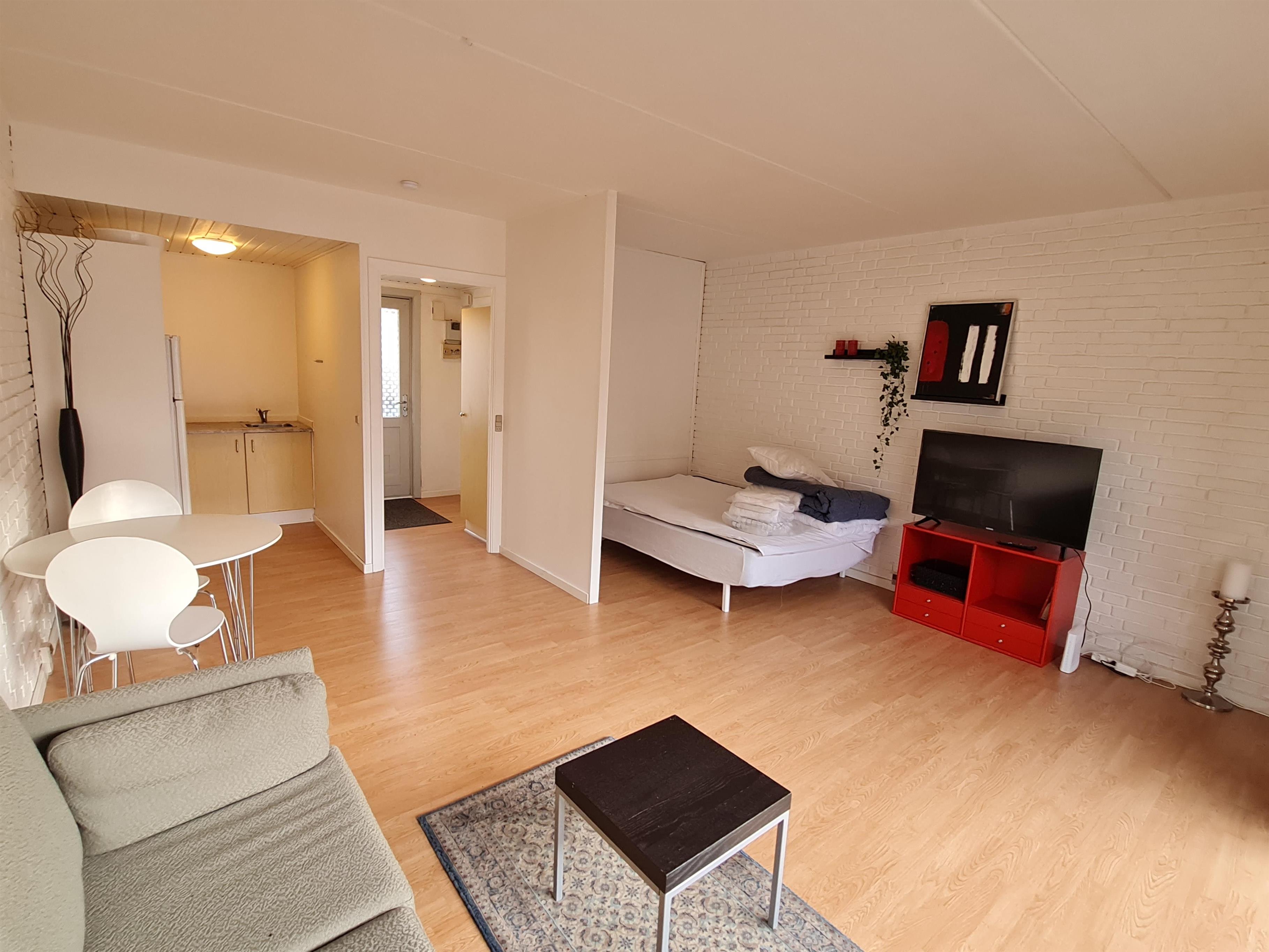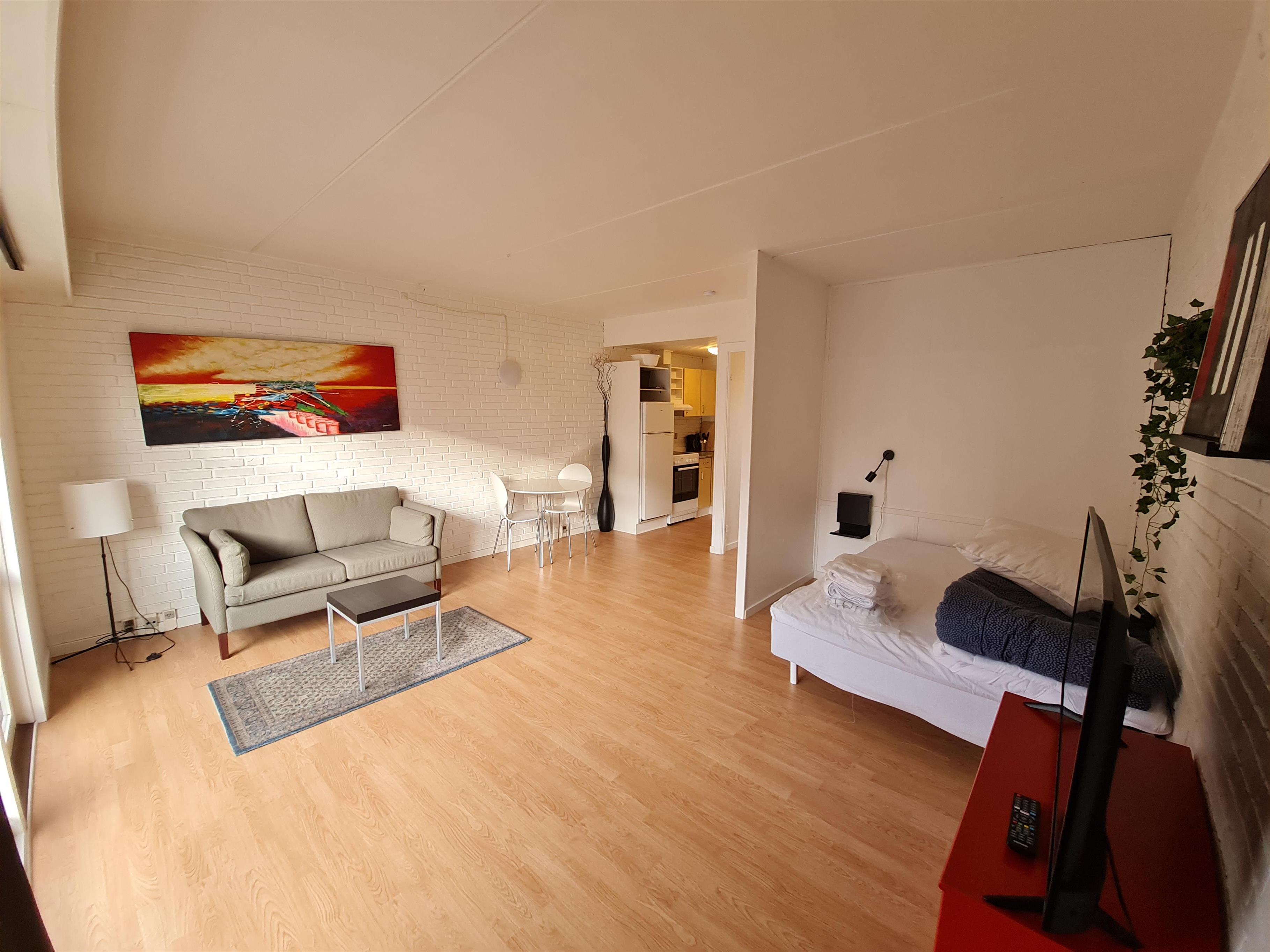 1 værelses lejlighed med dobbeltseng (140), internet, sofa, køkken med komfur Køl/frys og kaffemaskine.