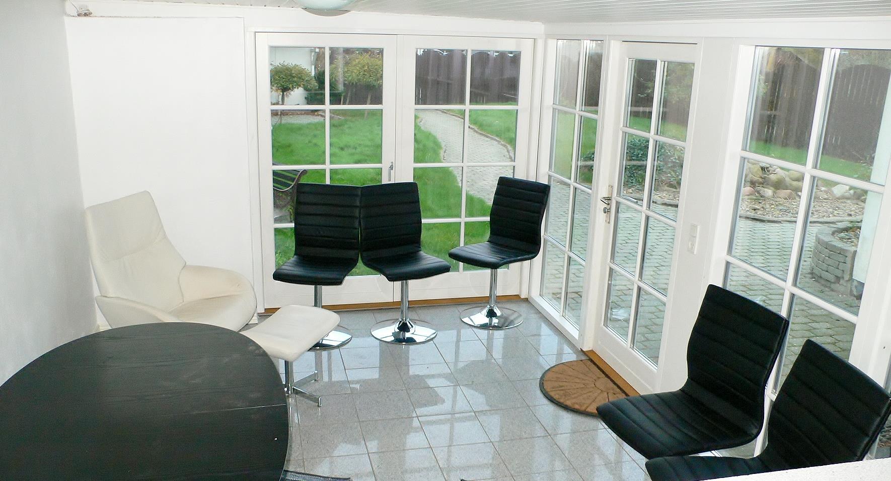 Im Parterre liegen die Wohnstube mit Fernseher und Internetzugang, Holzofen und Essecke in Verbindung mit der Küche sowie ein Schlafzimmer mit 2 Betten. Es gibt einen Wintergarten, der Verbindung mit dem Hauswirtschaftsraum mit Waschmaschine hat. Hier gibt es reichlich Schrankplatz und Platz für eine zusätzliche Schlafmöglichkeit.