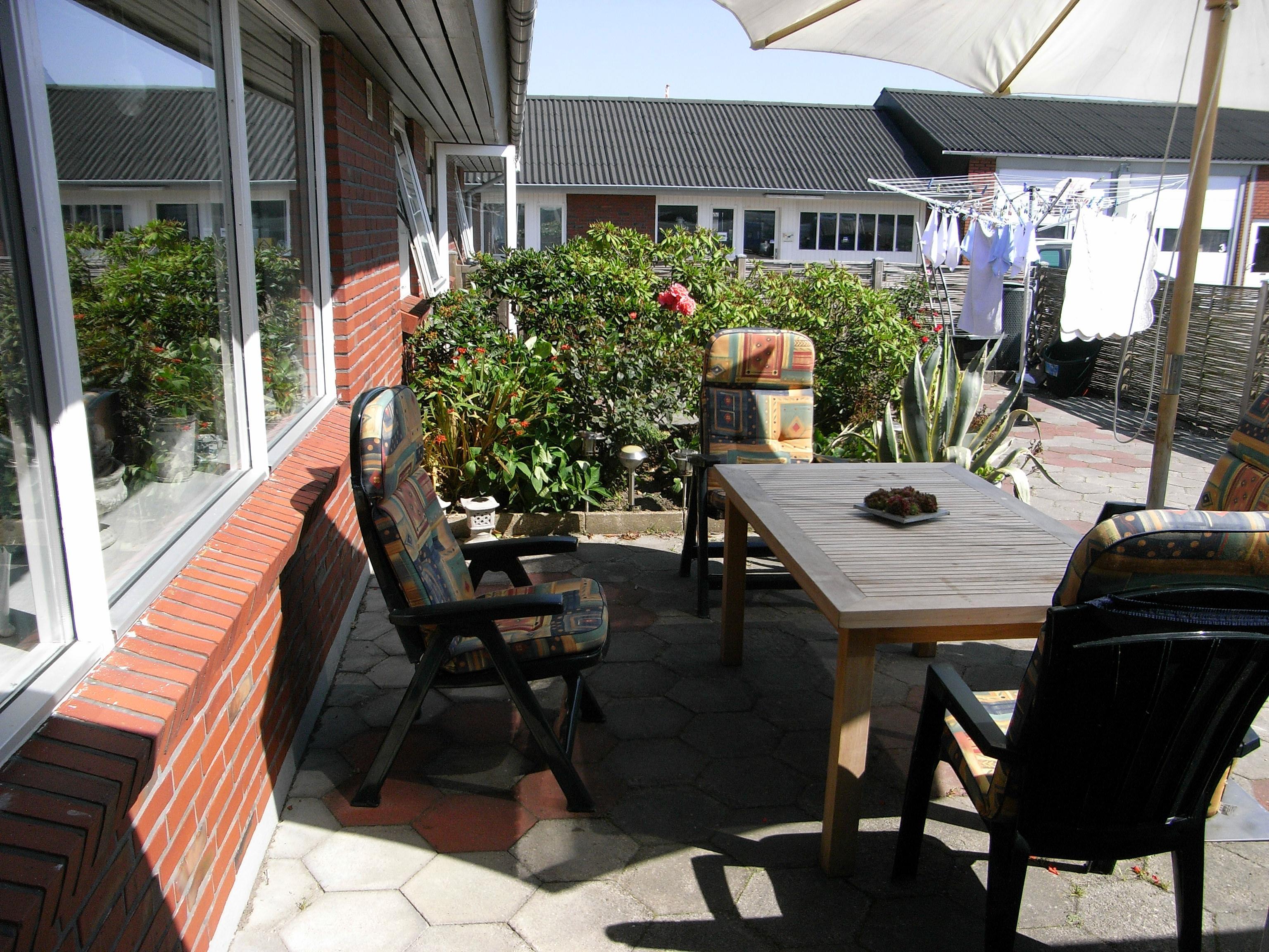 Das Grundstück ist eingezäunt und hat Beete und Gartenfliesen. Gartenmöbel sind vorhanden.