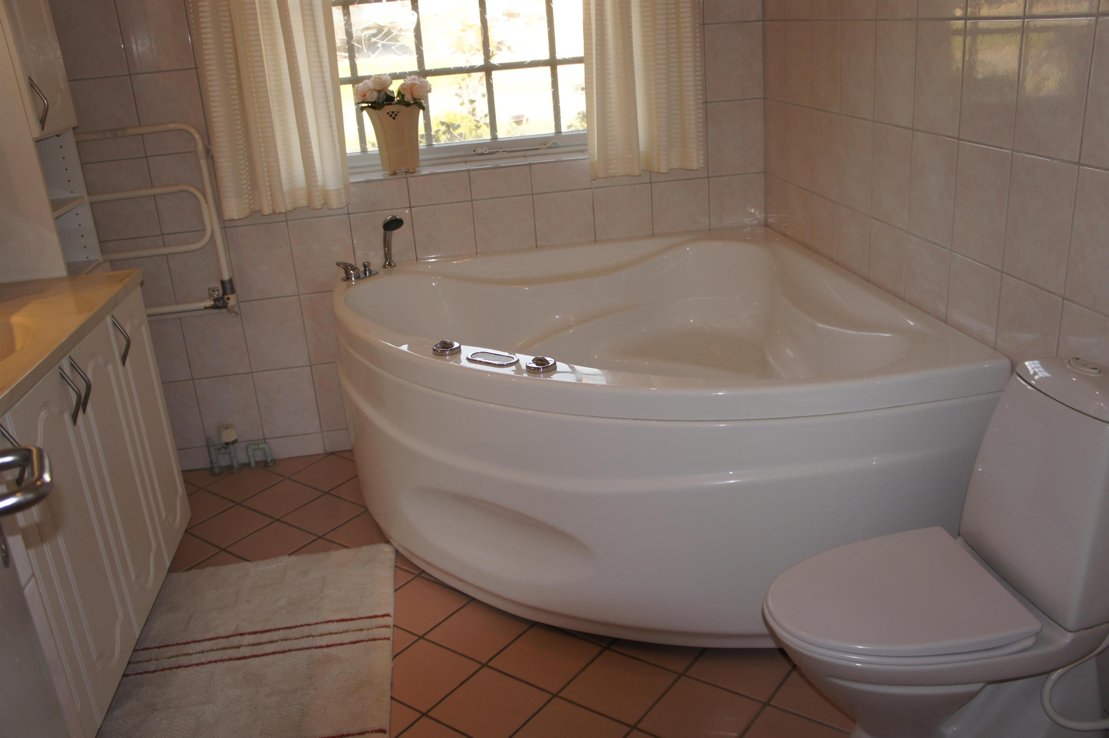 Das Badezimmer hat Fussbodenheizung, Whirlpool, Dusche, Waschbecken und Toilette.