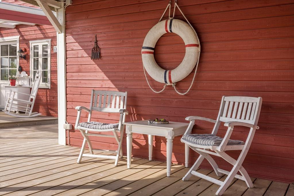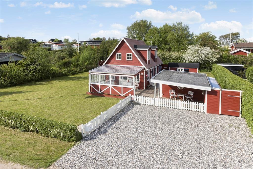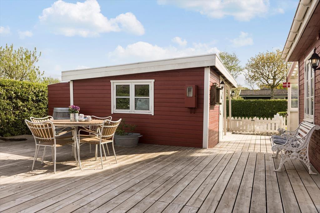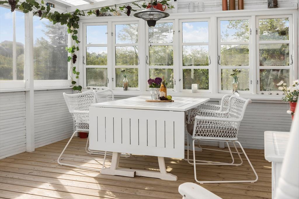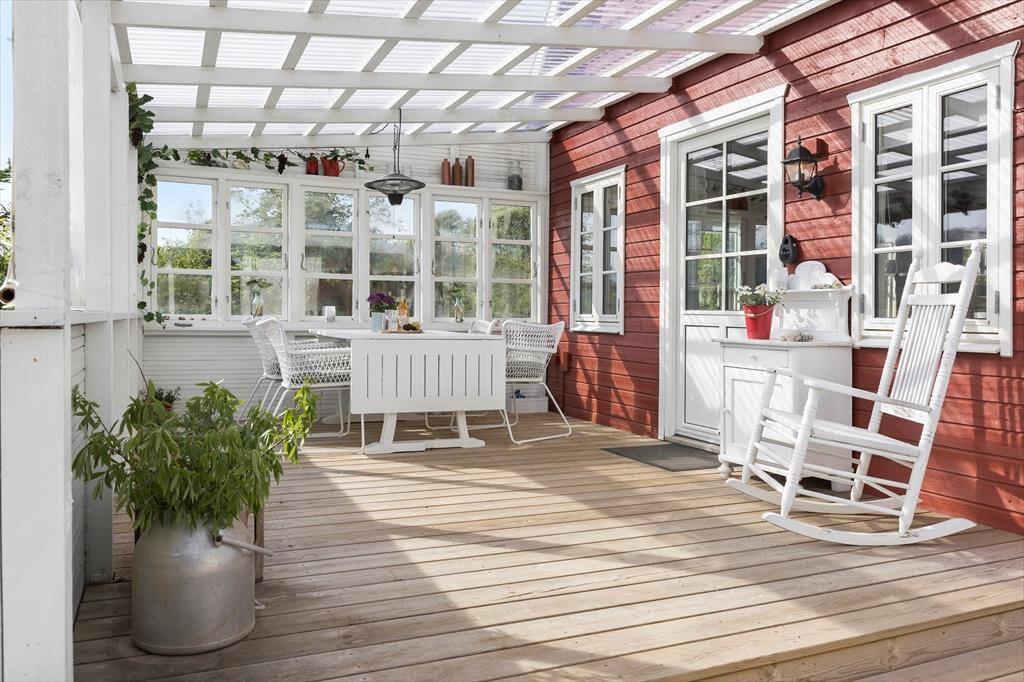 Dein Ferienhausgrundstück bietet die besten Möglichkeiten, das milde Frühlings- und warme Sommerwetter in vollen Zügen zu genießen. Die Grasfläche ist angenehm eben, sodass die Kinder vergnügt umhertollen und mit den Erwachsenen zusammen Wikingerschach und andere Outdoor-Spiele spielen können. Entspannte Stunden mit einem guten Buch genießt du in der Hängematte im Garten oder an einem der schönen Aufenthaltsplätze auf der großen, ungestörten Terrasse. Vor der Grundstückseinfahrt befindet sich zusätzlich eine überdachte Terrasse. Angenehm windgeschützt und stimmungsvoll geht es auf der Terrasse in Verlängerung des Wohnraums zu. Diese ist angenehm abgeschirmt und zu zwei Seiten von Glaswänden umgeben, sodass du dich hier wie in einem einladenden, hellen Wintergarten fühlst.
