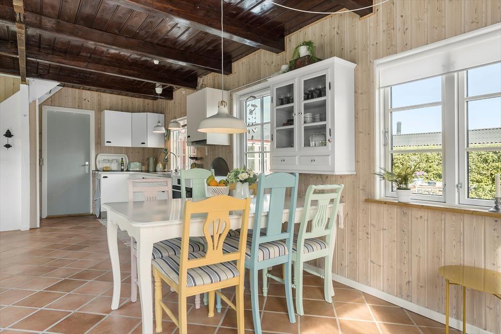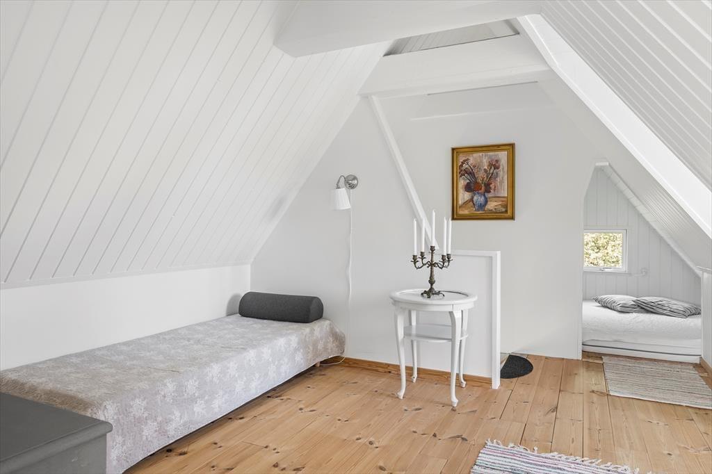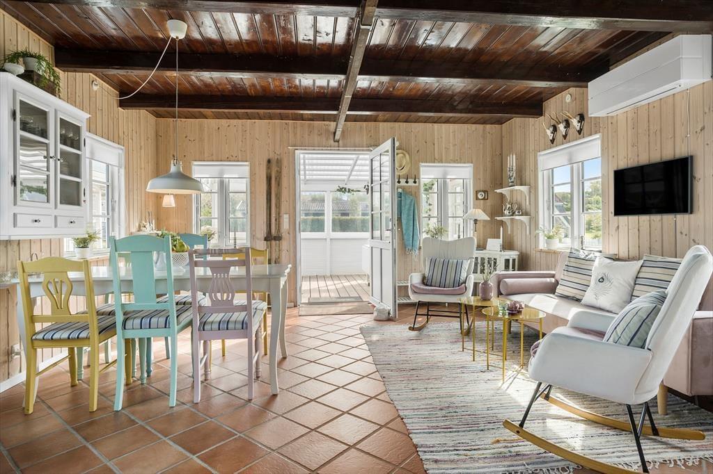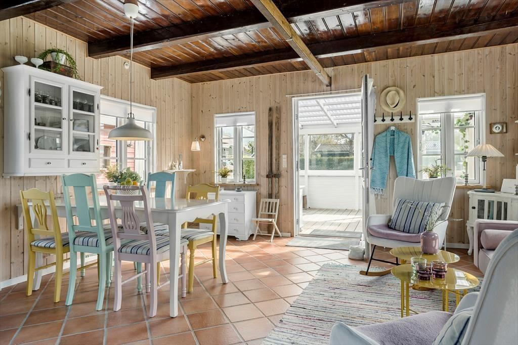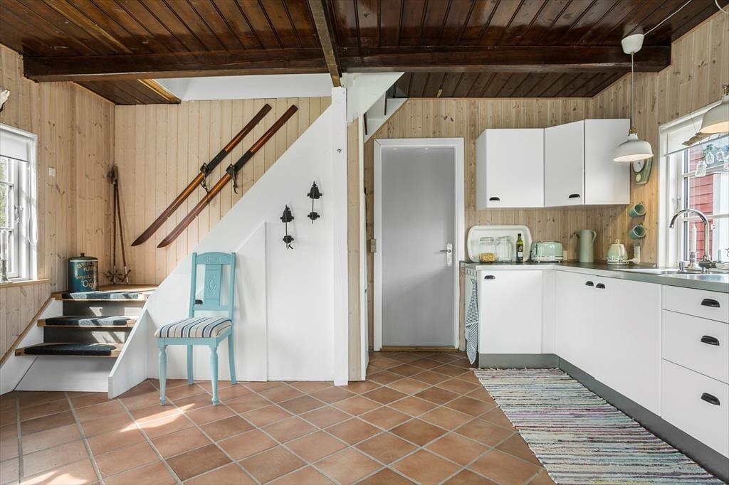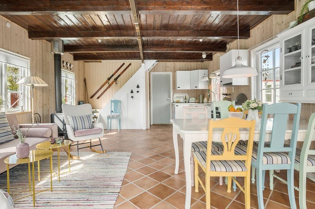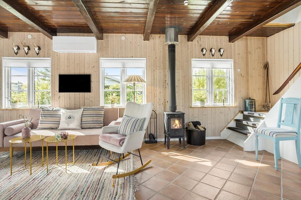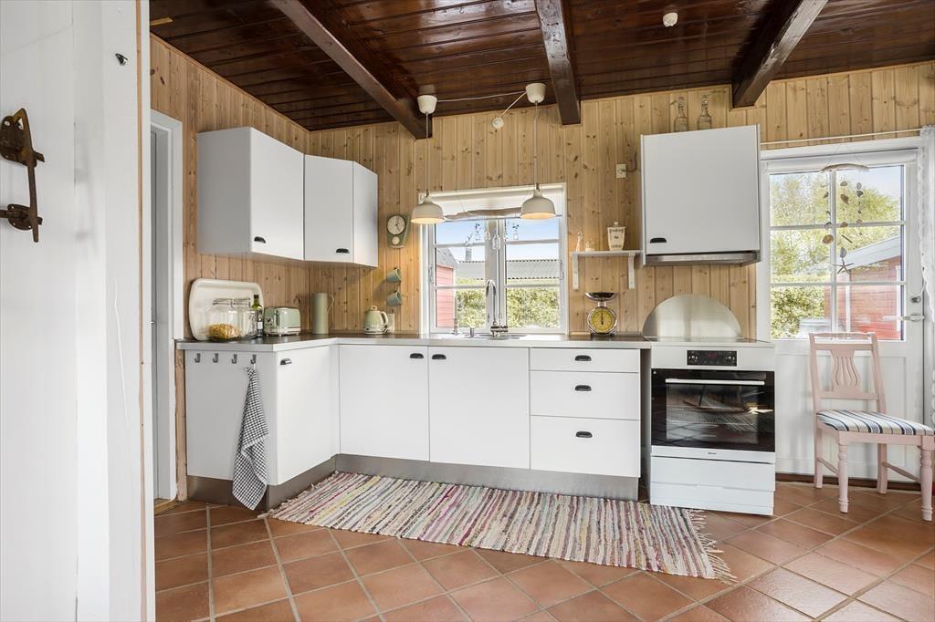 Mit seiner roten Holzfassade und den weißen Details erstrahlt dein Ferienhaus aus dem Grün rundherum. Das durchweg stimmige Erscheinungsbild lässt erahnen, wie schön es im Haus selbstzugeht. Bereits beim ersten Betreten wird dich die helle, leichte Wohnatmosphäre in den Bann ziehen. Die Einrichtung ist persönlich geprägt und bietet alles, was du mit deiner Familie für gelungene, entspannte Urlaubstage benötigst. Das Erdgeschoss beinhaltet den Wohnraum samt offen integrierter Küche. Der Wohnraum überzeugt mit seinem Kaminofen, der guten Deckenhöhe und dem schönen Tageslichteinfall aus drei Himmelsrichtungen. Das Badezimmer ist ebenfalls im Erdgeschoss platziert. Eine Treppe führt dich hinauf in den großen, schönen Schlafbereich, der mit einem hellen Ambiente und Dachschrägen verzückt. Die Schlafplätze sind lediglich durch eine halbe Wand voneinander getrennt - perfekt für eine Familie mit Kindern. Eine zusätzliche Matratze ist in einer kleinen, gemütlichen Schlafnische platziert. Weitere Schlafgelegenheiten stehen bei Bedarf im guten Nebengebäude zur Verfügung.