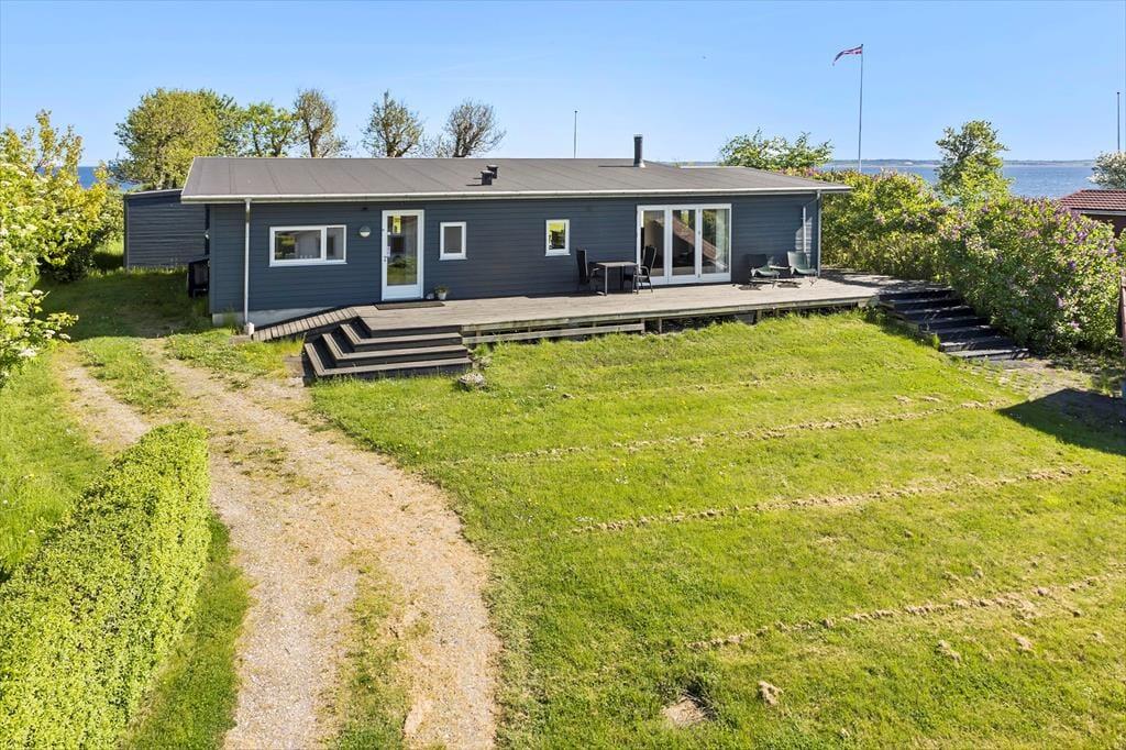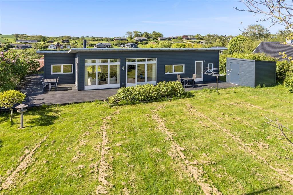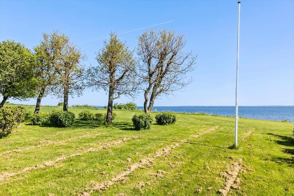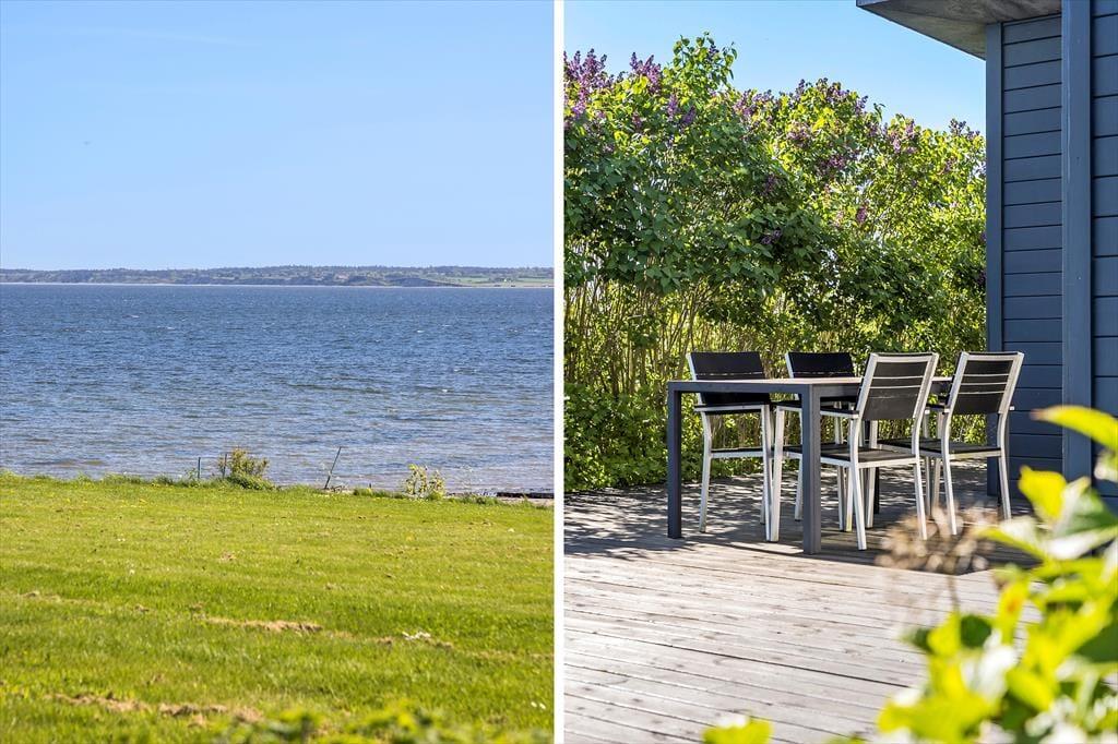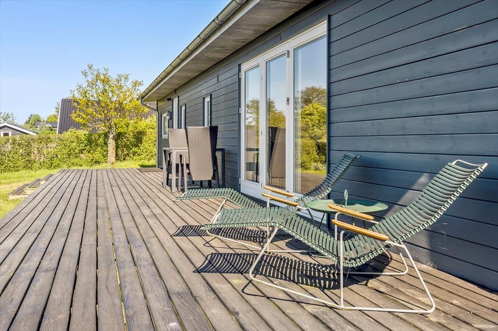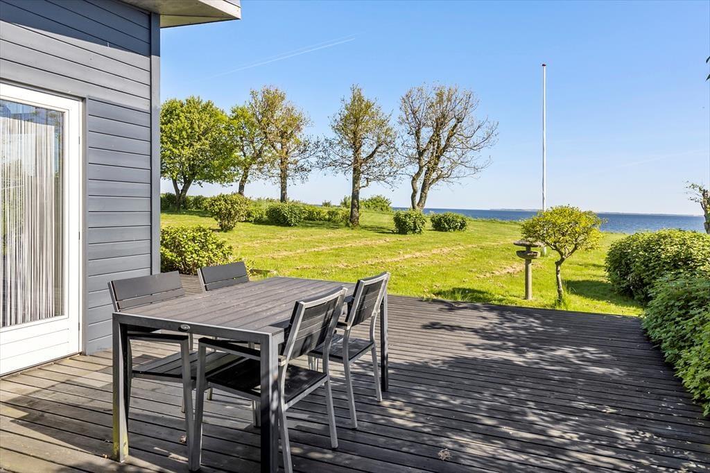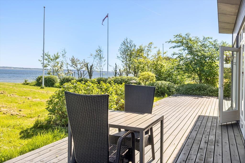 An schönen Sommertagen wird das attraktive Terrassenareal bei Ihnen für Begeisterung sorgen. Eine große Holzterrasse umgibt drei Seiten des Hauses und lädt zu ausgedehnten Sonnenbädern und gemütlichen Grillabenden ein. Der Garten wird teilweise durch eine Randbepflanzung abgeschirmt. Terrasse und Grasfläche bestechen mit Aussicht auf den Limfjord.