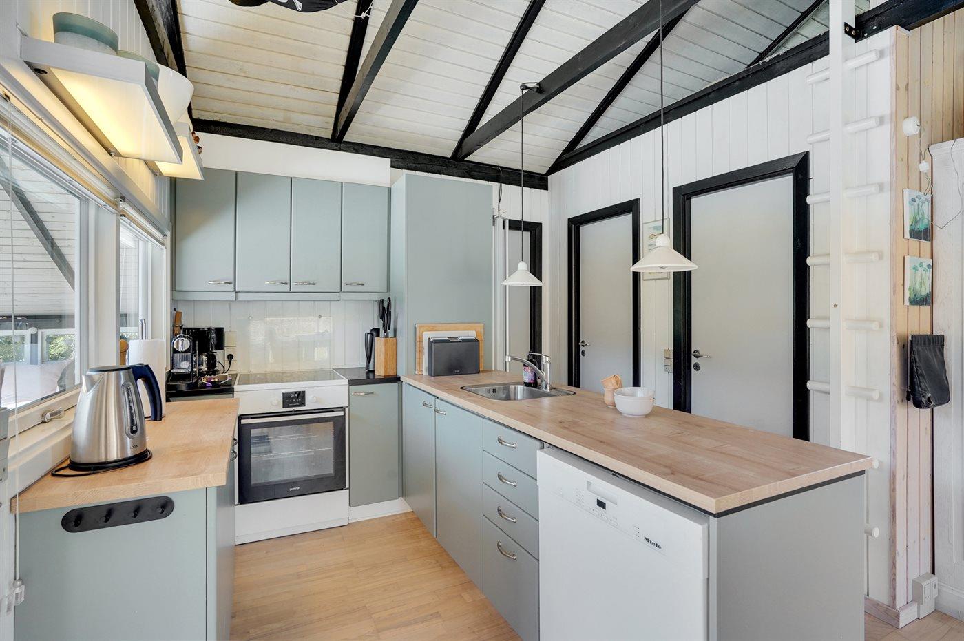 Die Küche ist mit Kühlschrank ausgestattet. Außerdem gibt es 4 elektrische Kochplatten, Backofen sowie Geschirrspüler.