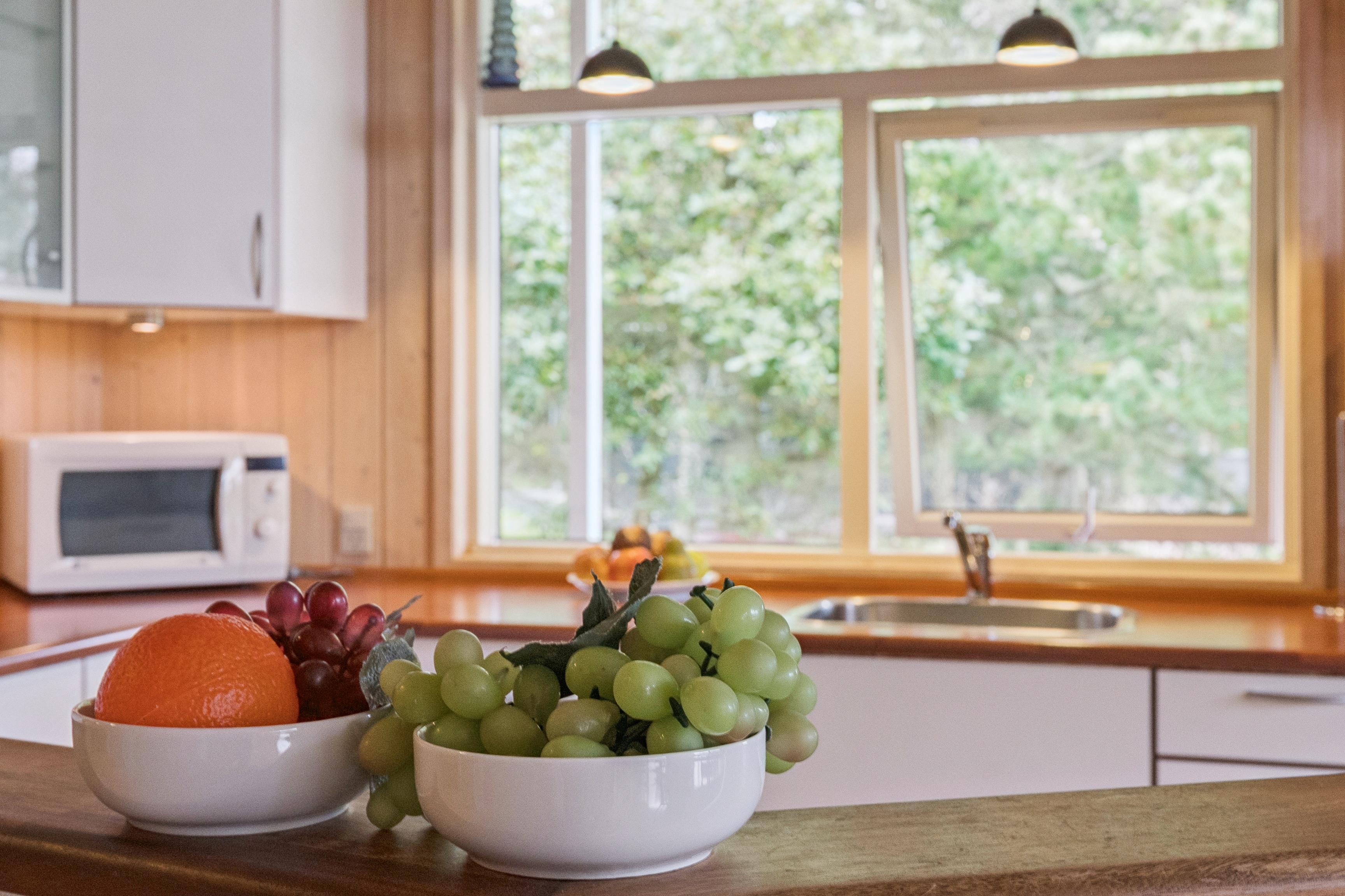 Die moderne, voll ausgestattete Küche ist offen mit dem Wohnzimmer verbunden, sodass alle beisammen sein können – beim Kochen, Spielen oder gemütlichen Beisammensein vor dem Kaminofen, der an kühlen Tagen wohlige Wärme und eine behagliche Atmosphäre verbreitet.