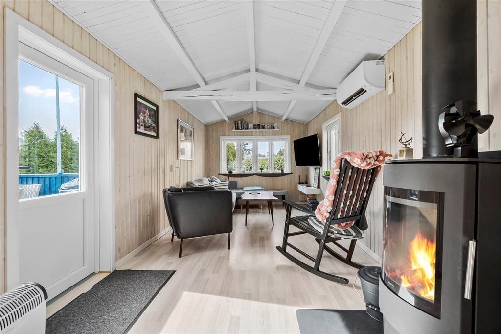 Dieses richtig stimmungsvolle Ferienhaus erwartet Sie nur 400 Meter abseits vom kinderfreundlichen Badestrand, an dem Sie auch gut angeln können. Der gemütliche Wohnraum umfasst einen Kaminofen, eine Sofaecke, einen Fernseher und einen schönen Essplatz, der direkt mit der ansprechenden Küche verbunden ist. In der Küche werden Sie sicherlich gerne köstliche Urlaubmahlzeiten zubereiten. Praktischerweise verfügt die Küche auch über angenehm große Gefriermöglichkeiten. Ein Eingangsbereich, ein funktionelles Badezimmer und zwei gute Schlafräume zählen ebenfalls zur Wohnfläche. Einer der beiden Schlafräume beinhaltet ein Doppelbett. Im zweiten Schlafraum stehen zwei Einzelbetten für Sie bereit. Das geräumige und gemütliche Nebengebäude beherbergt neben einem weiteren Doppelbett und einem Einzelbett auch einen Fernseher und eine Spielekonsole - Teenager werden dieses Nebengebäude lieben!